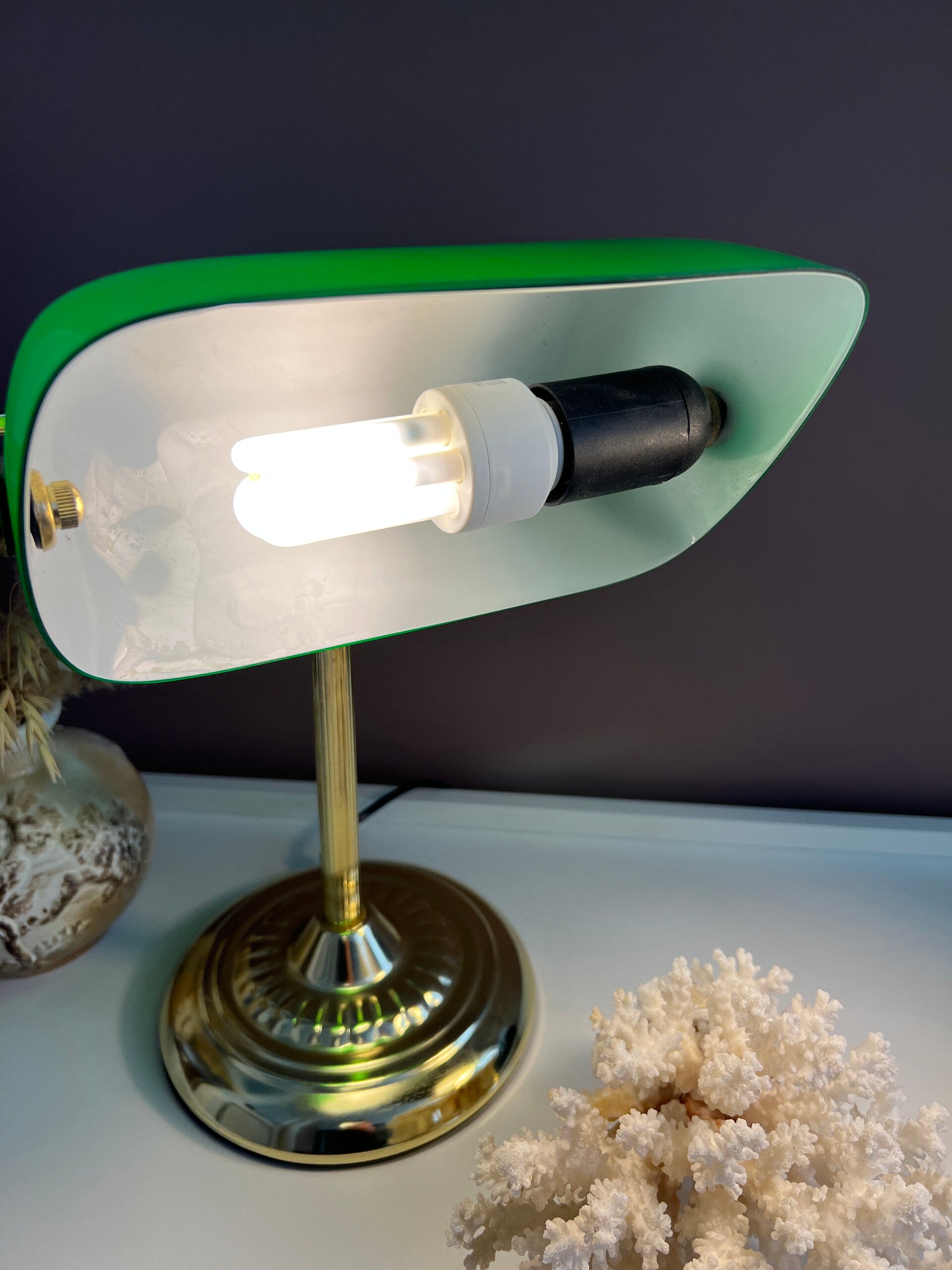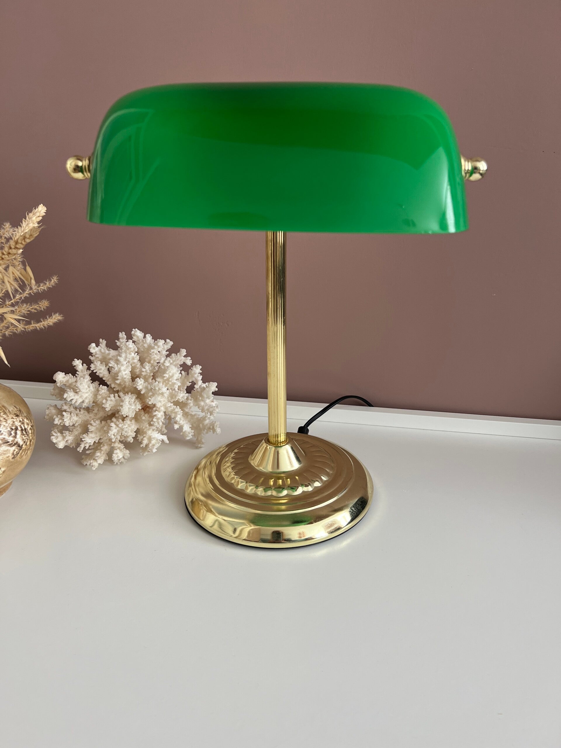 Notarislampje met goudkleurig frame met het bekende groene glazen kapje. Mooi bijvoorbeeld voor op je nachtkastje.