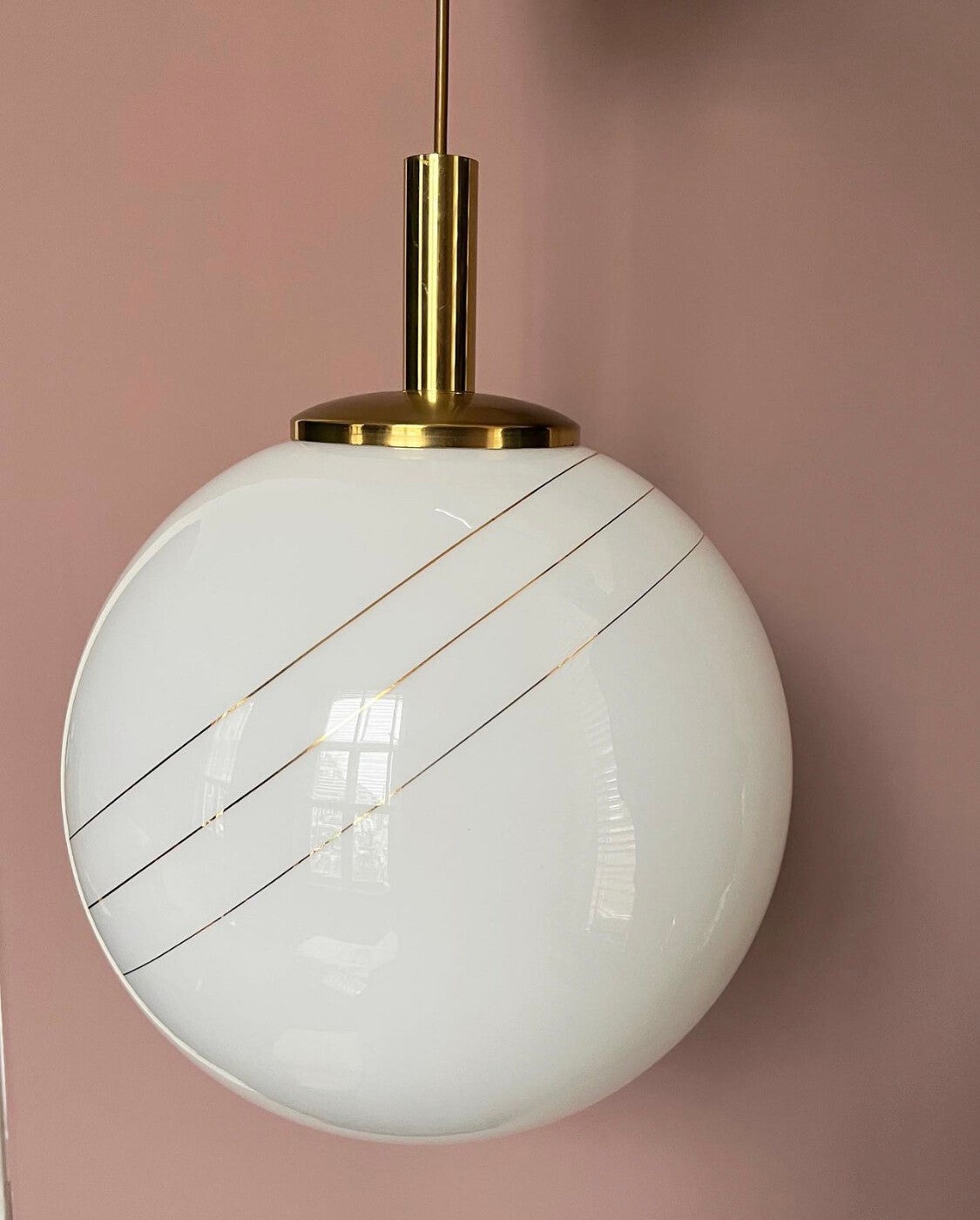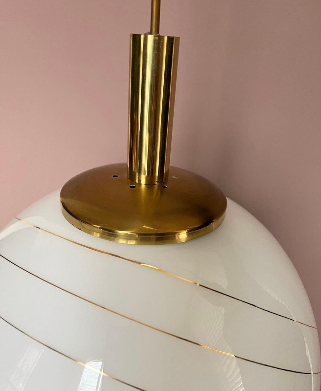 Prachtige bol hanglamp uit de sixties met goudkleurige biezen erop. Ook de afdekplaat is goudkleurigDe glazen globe verkeert in een mooie staat ෆ
