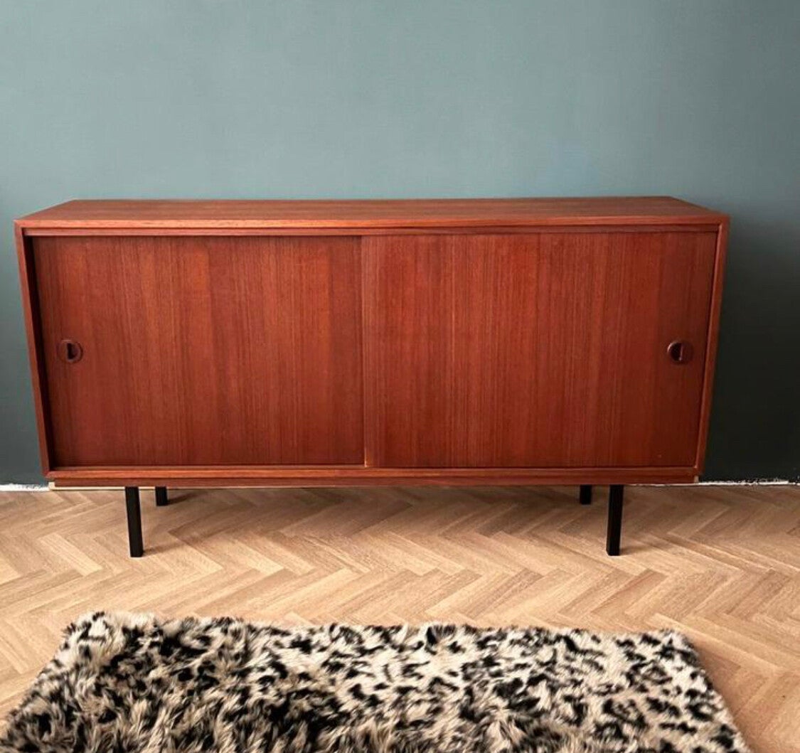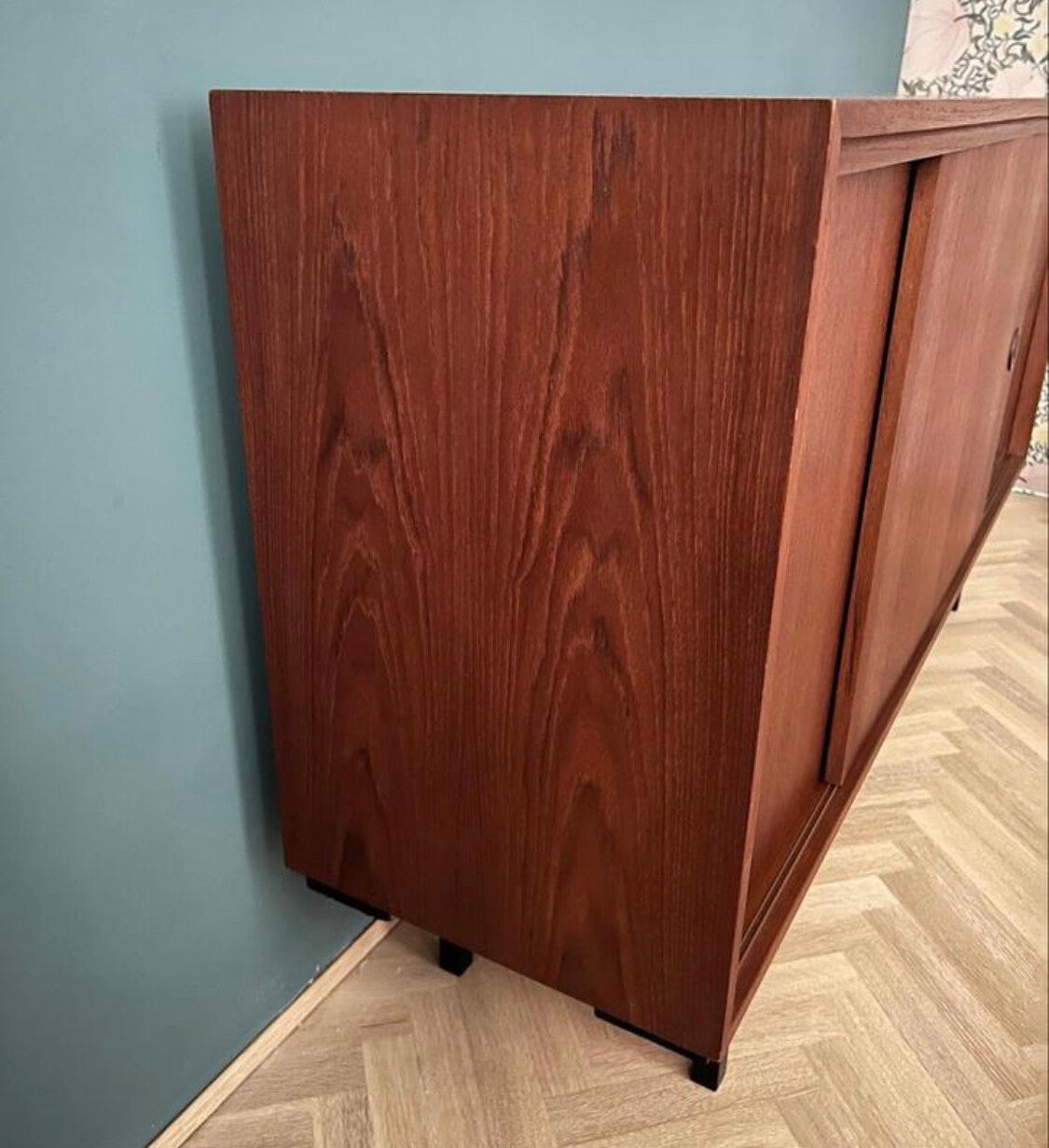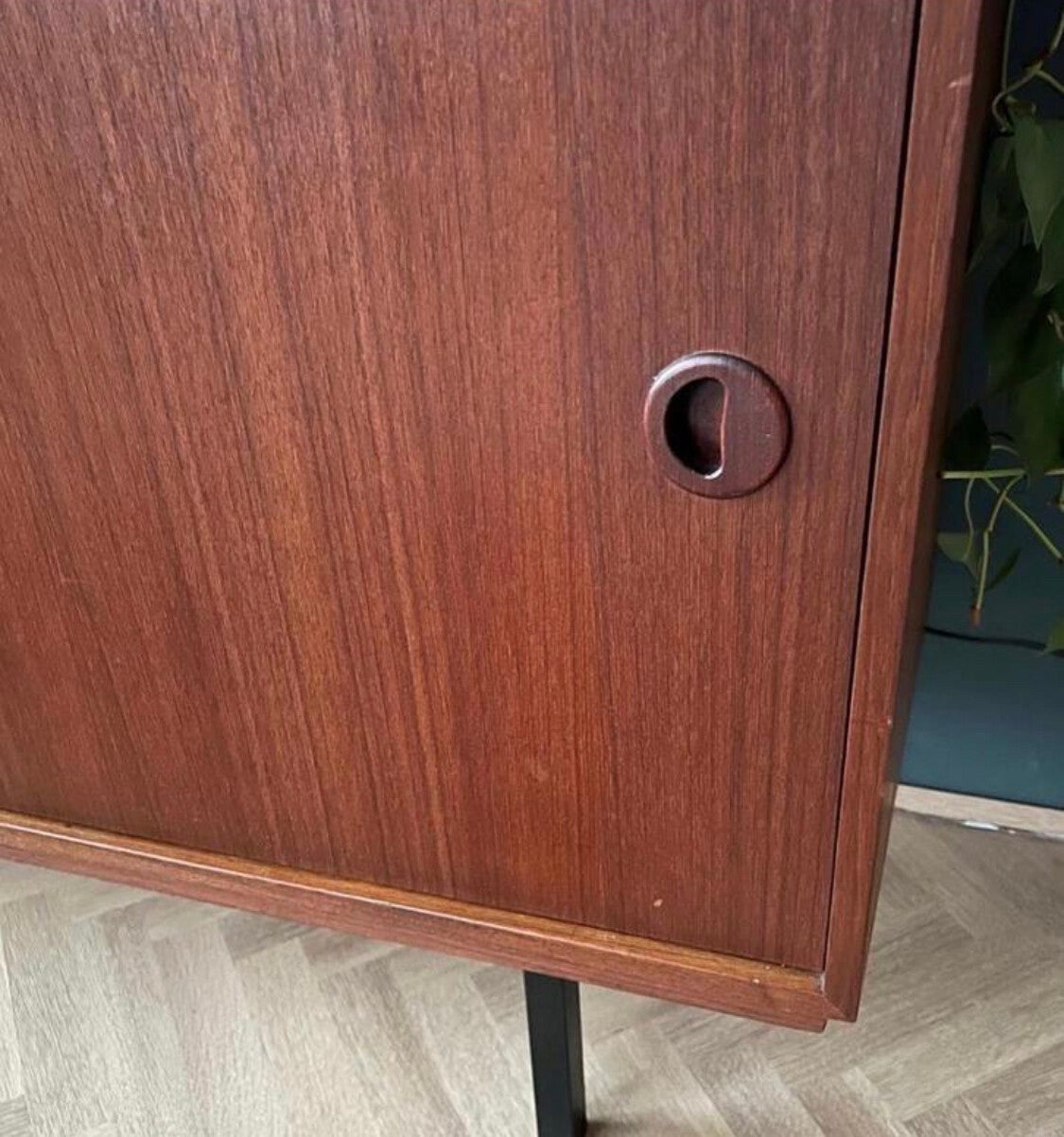 Tof Deens Design sideboard van Mustering Möbler wat nog in een topstaat verkeert. Teak fineer. De dressoir heeft 2 schuifdeuren die nog soepeltjes op en neer gaan. Achter het linker deurtje zit een schap en bij het rechterdeurtje is een groot vak, met mogelijkheid om er zelf nog een plank in te plaatsen. Het sideboard staat op metalen poten en heeft prachtige grepen.