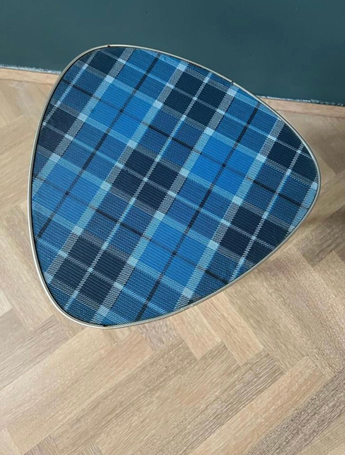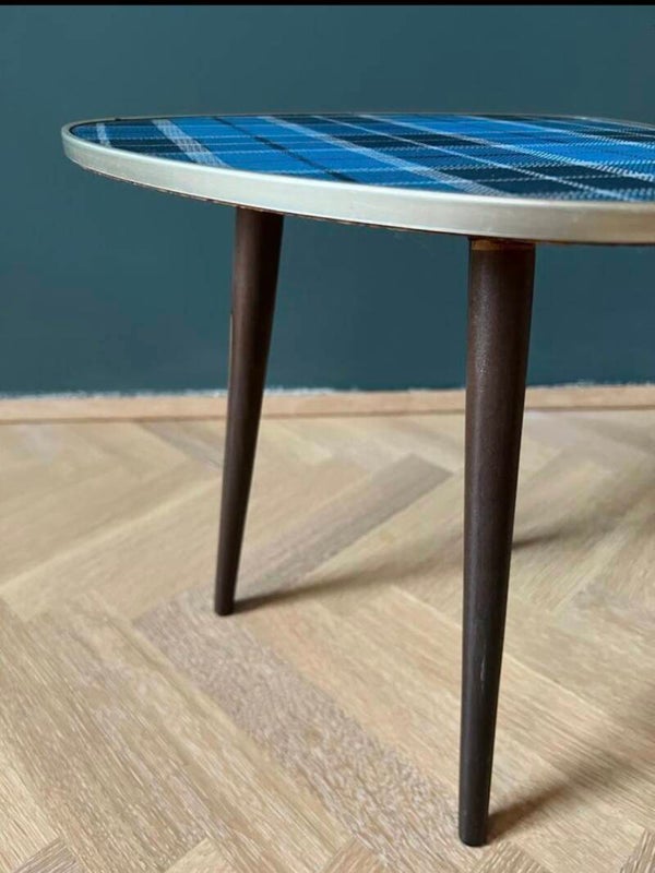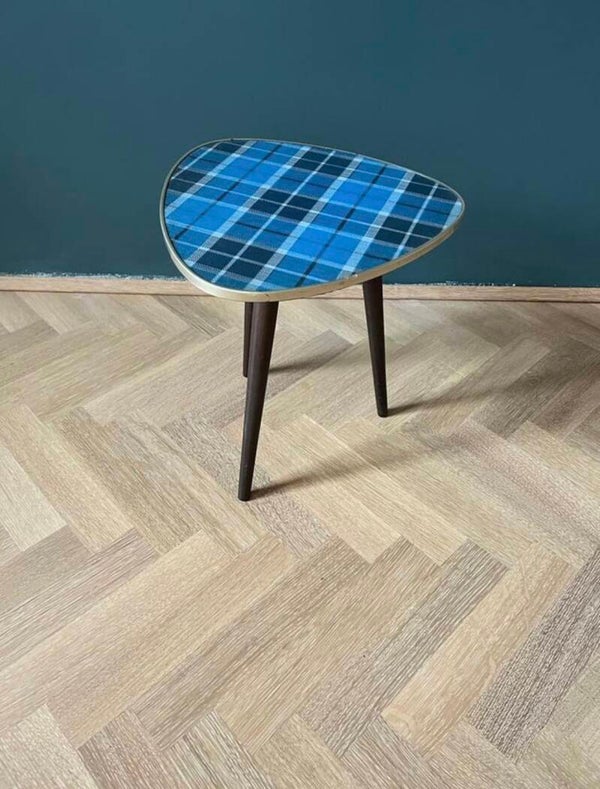 Vintage Plantentafel met blauw geruit blad metalen trim en mooie ranke pootjes.