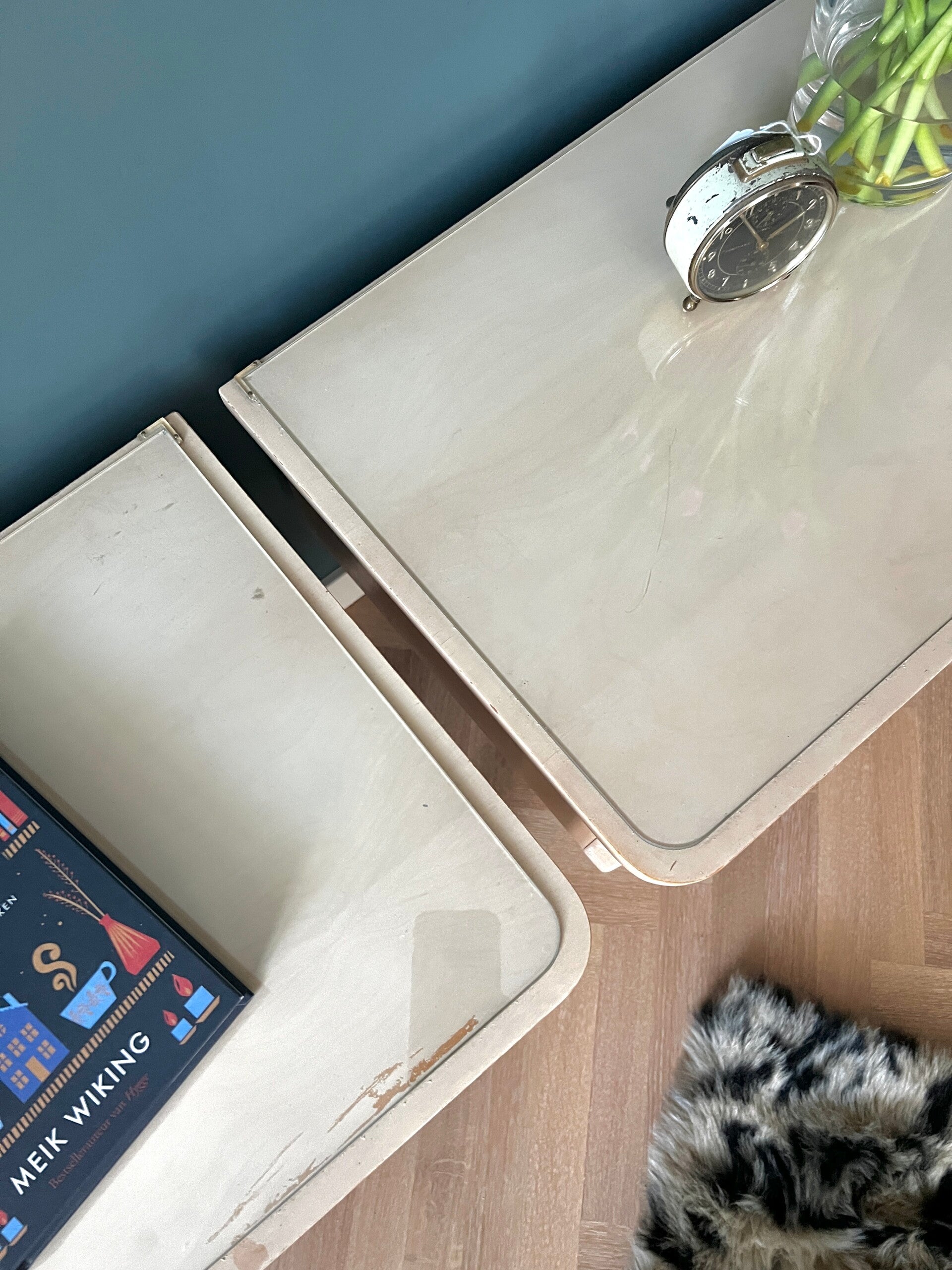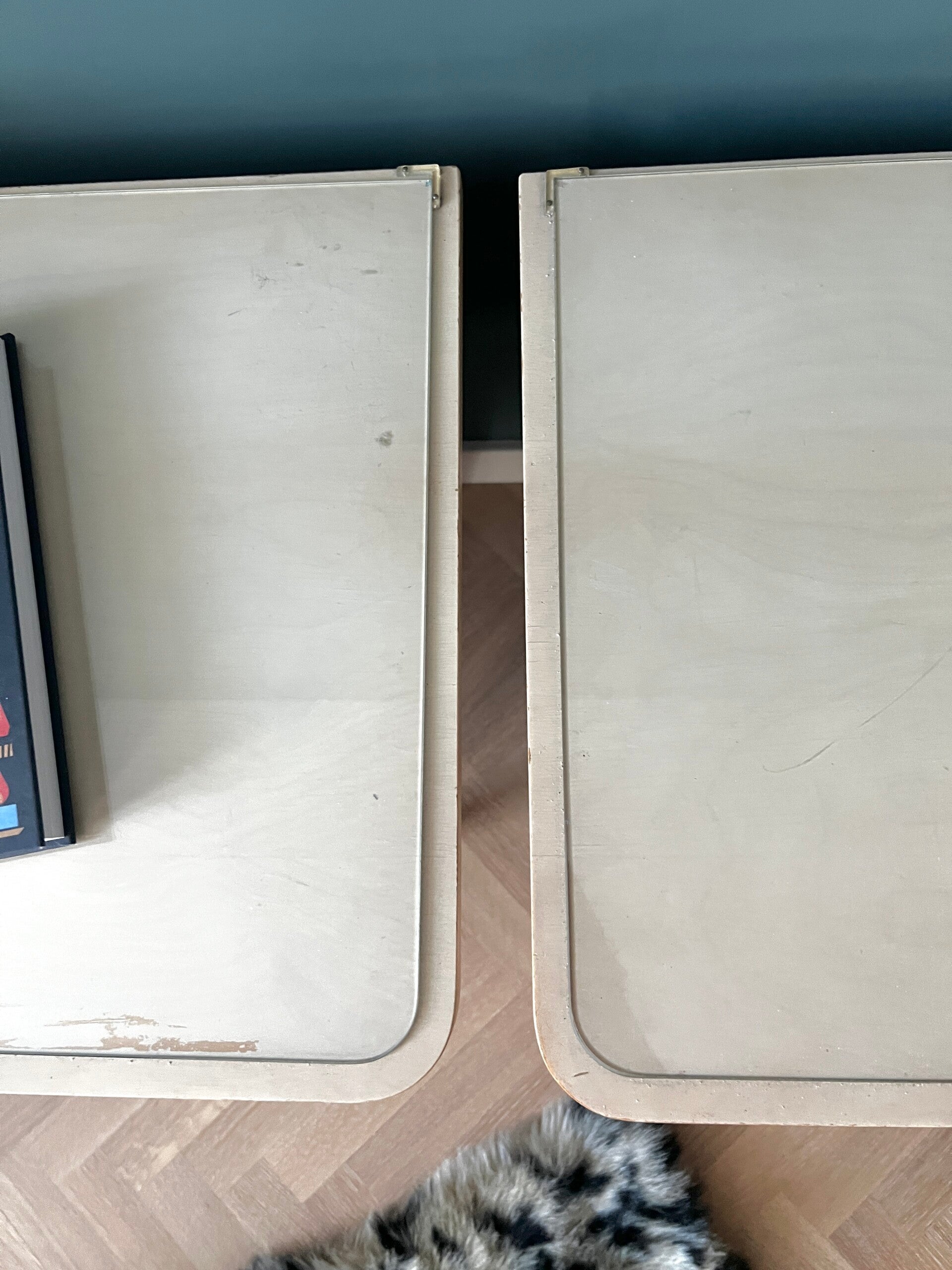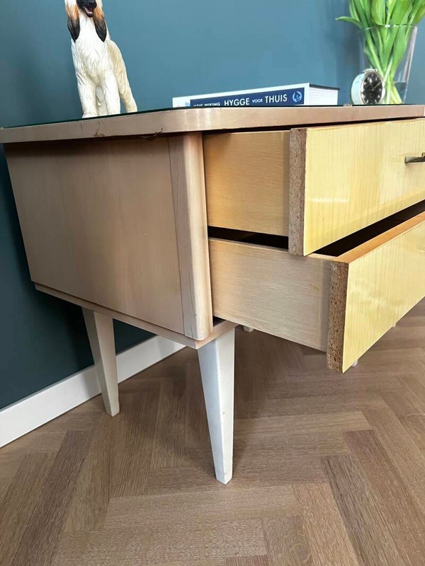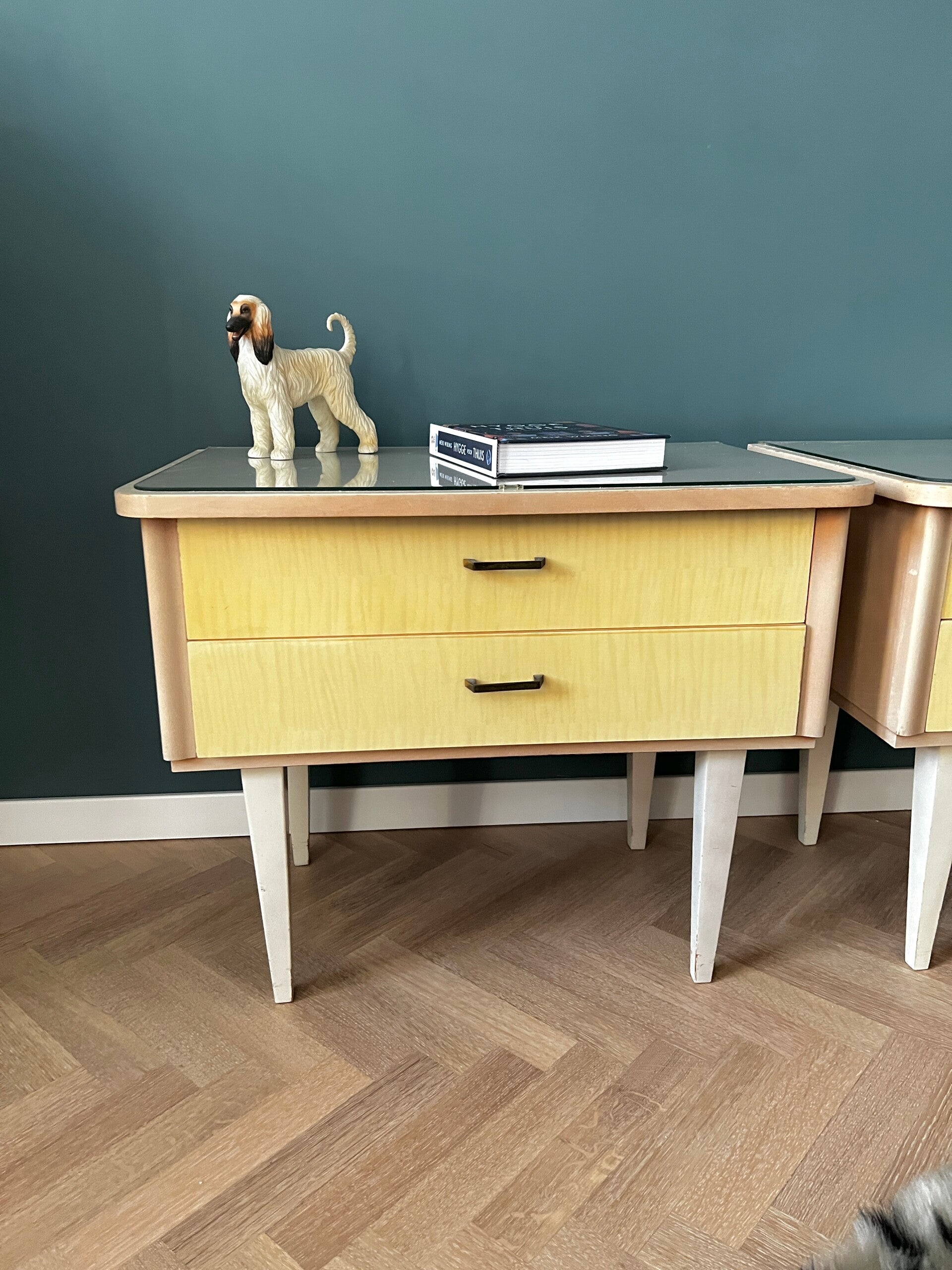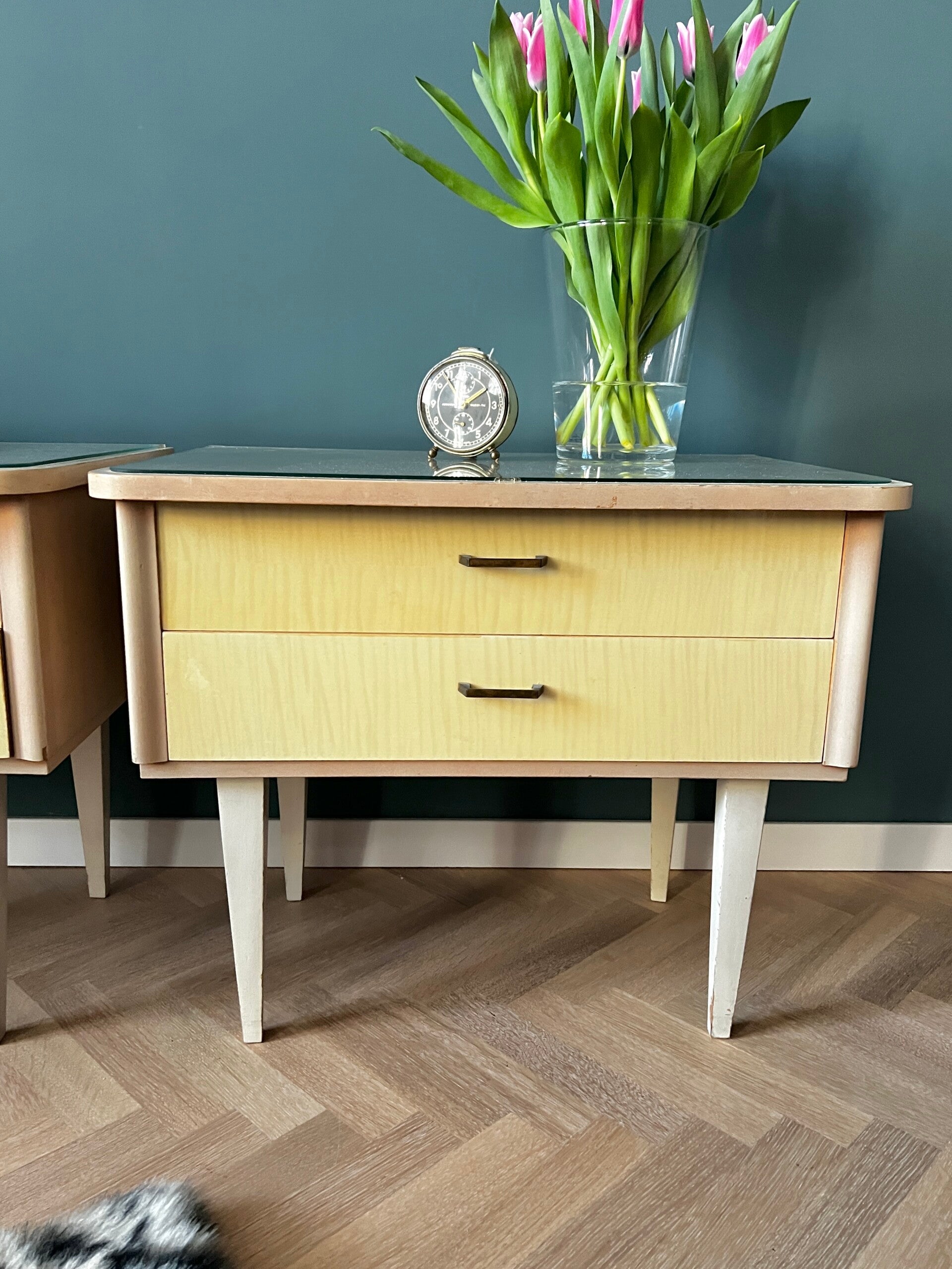 Set vintage nachtkastjes, super leuk met licht hout en een glasplaat aan de bovenzijde. De kastjes hebben 2 lades. lichte gebruikssporen
