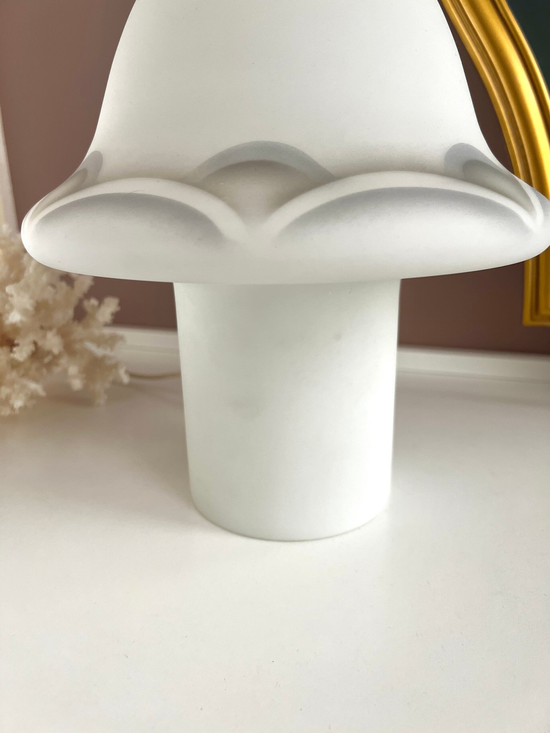 Super toffe jaren 70 mushroom tafellamp, de tafellamp is gemaakt uit één mond geblazen stuk glas. De lamp heeft een mooie bewerking op het glas en geeft sfeervol licht af. Getest en werkend. De lamp is in zeer goede vintage staat. We hebben er niet 1 maar 2 beschikbaar 🤩