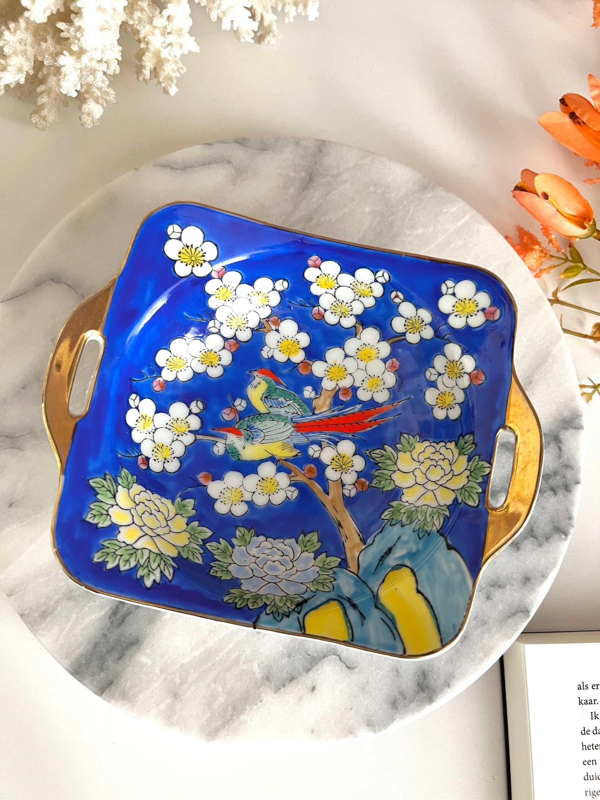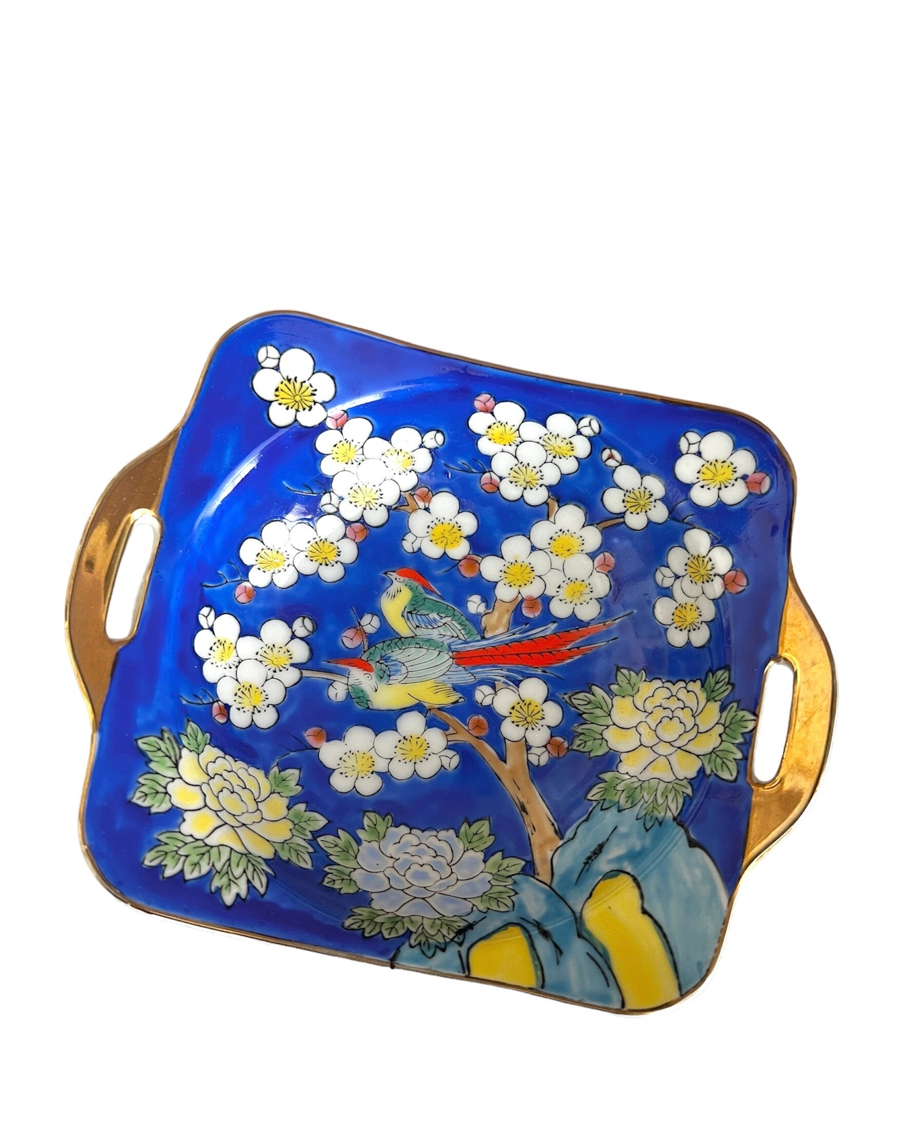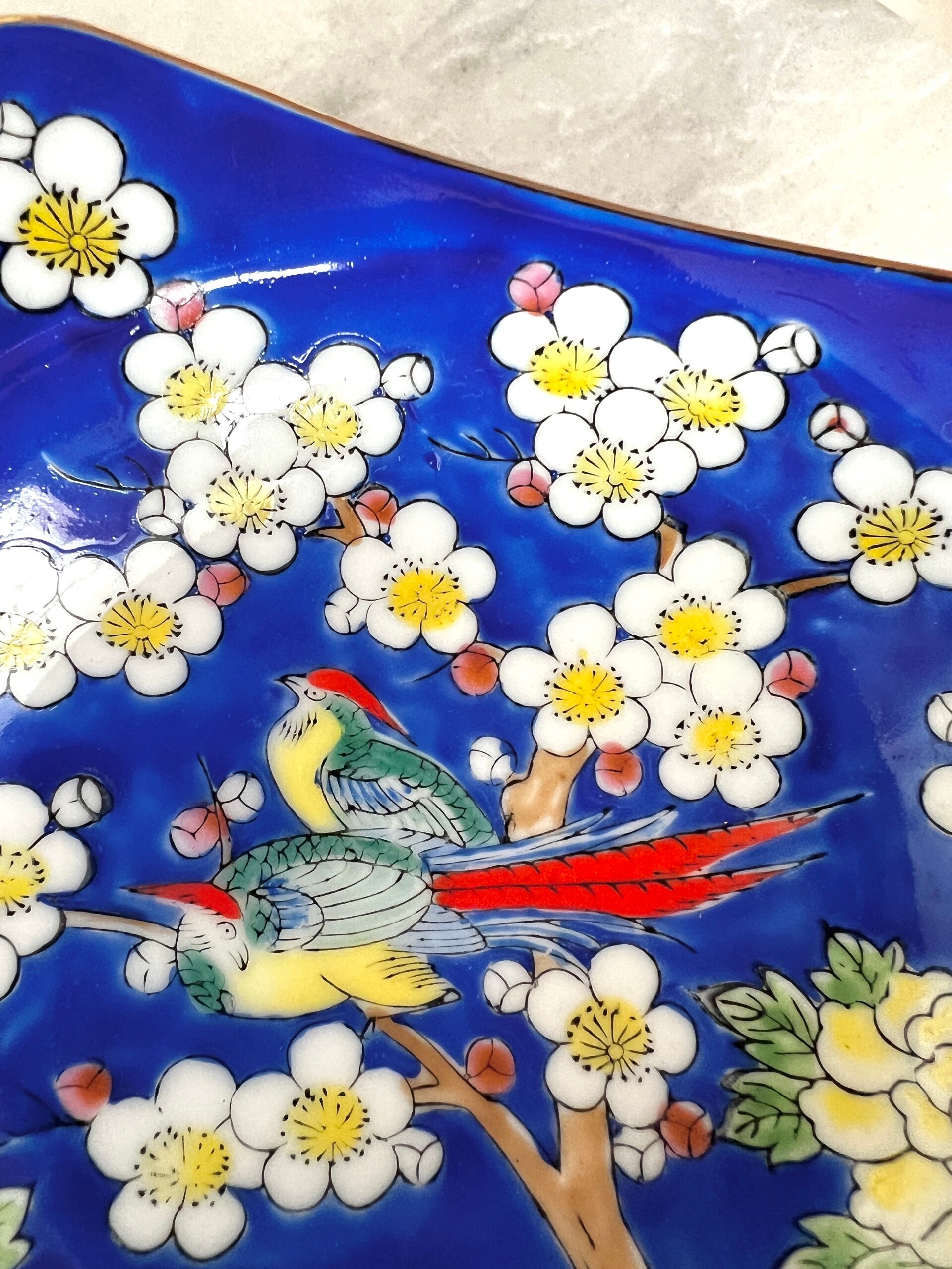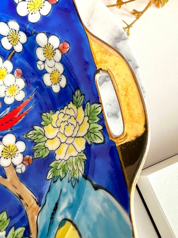 Heel mooi gekleurd schaaltje van porselein. Op het schaaltje zie je een afbeelding van 2 paradijsvogels in een bloesemboom, dit alles is heel sierlijk gedecoreerd. Mooi geglazuurd en afwerkt met een gouden touch✨
