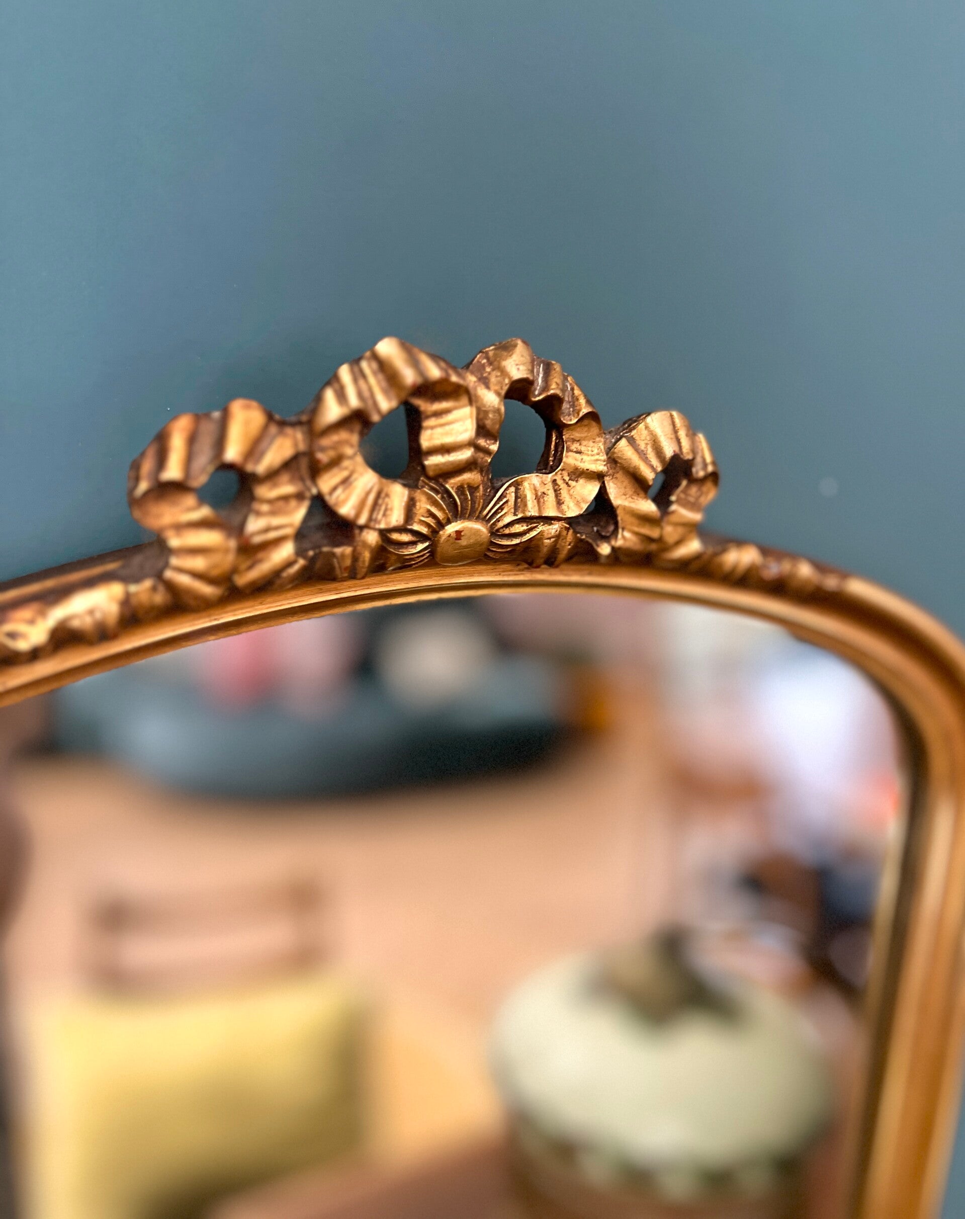 Mooie sierlijke spiegel met gouden striklijst. Een mooie blikvanger voor aan de muur🤩