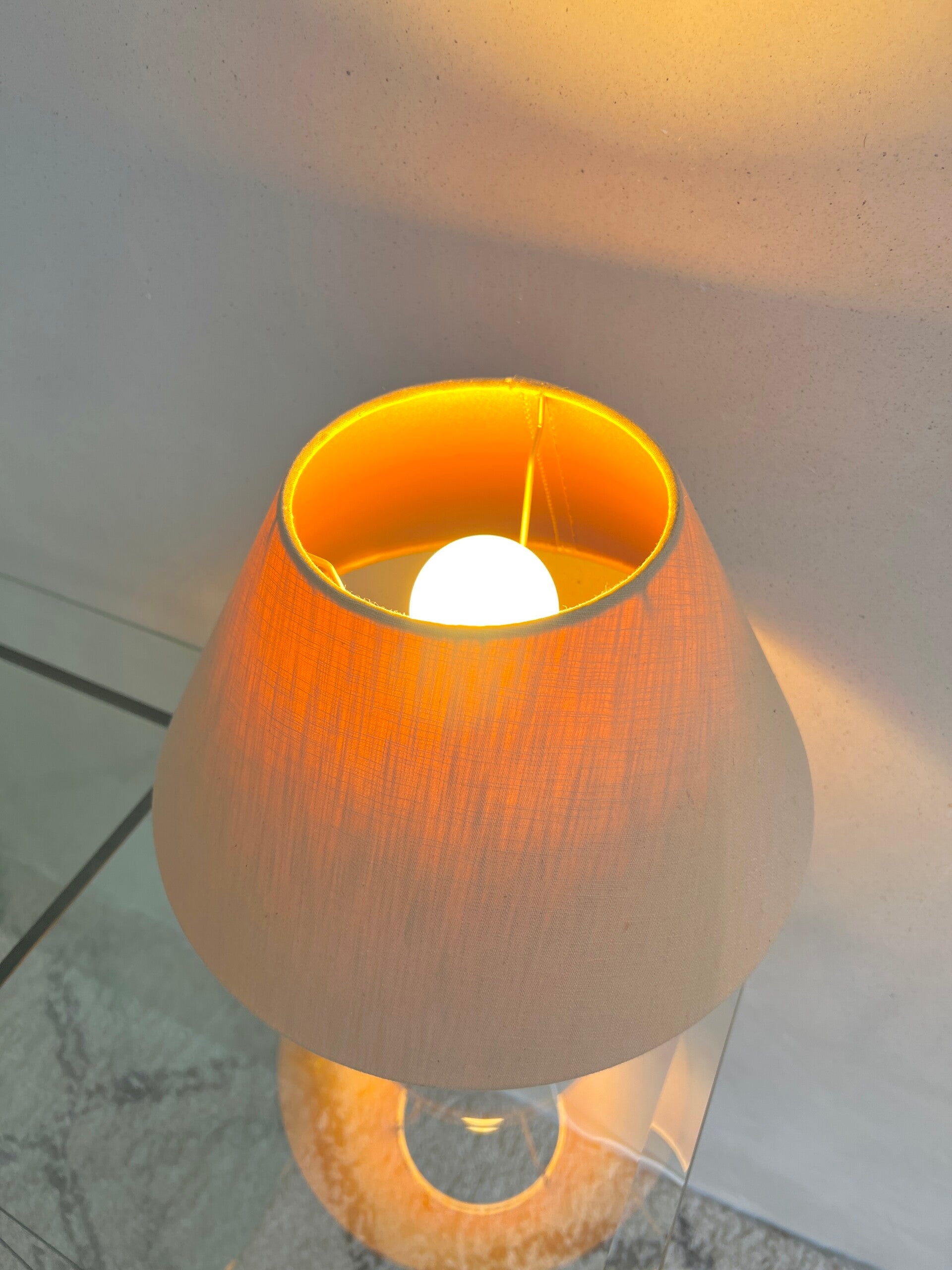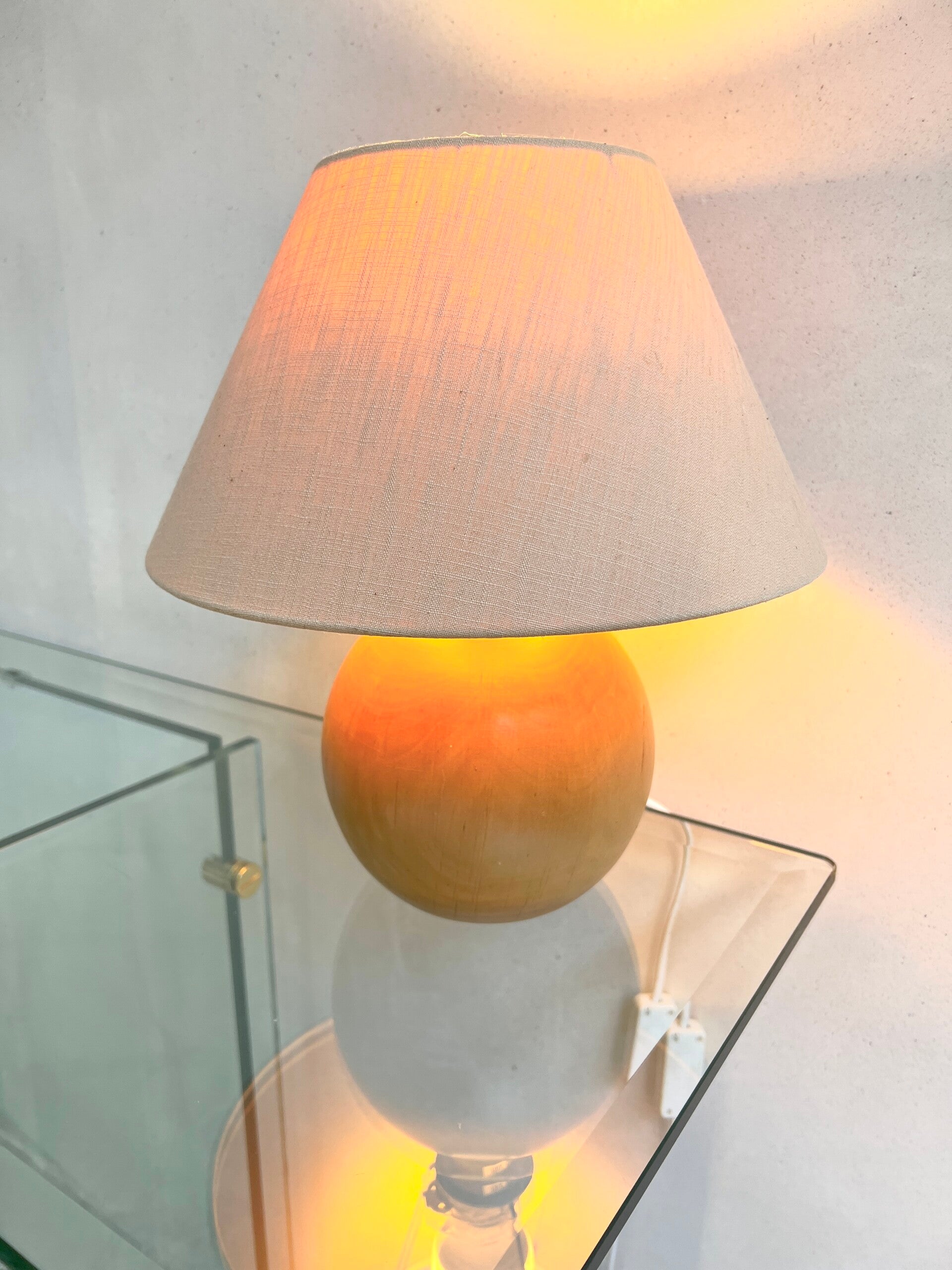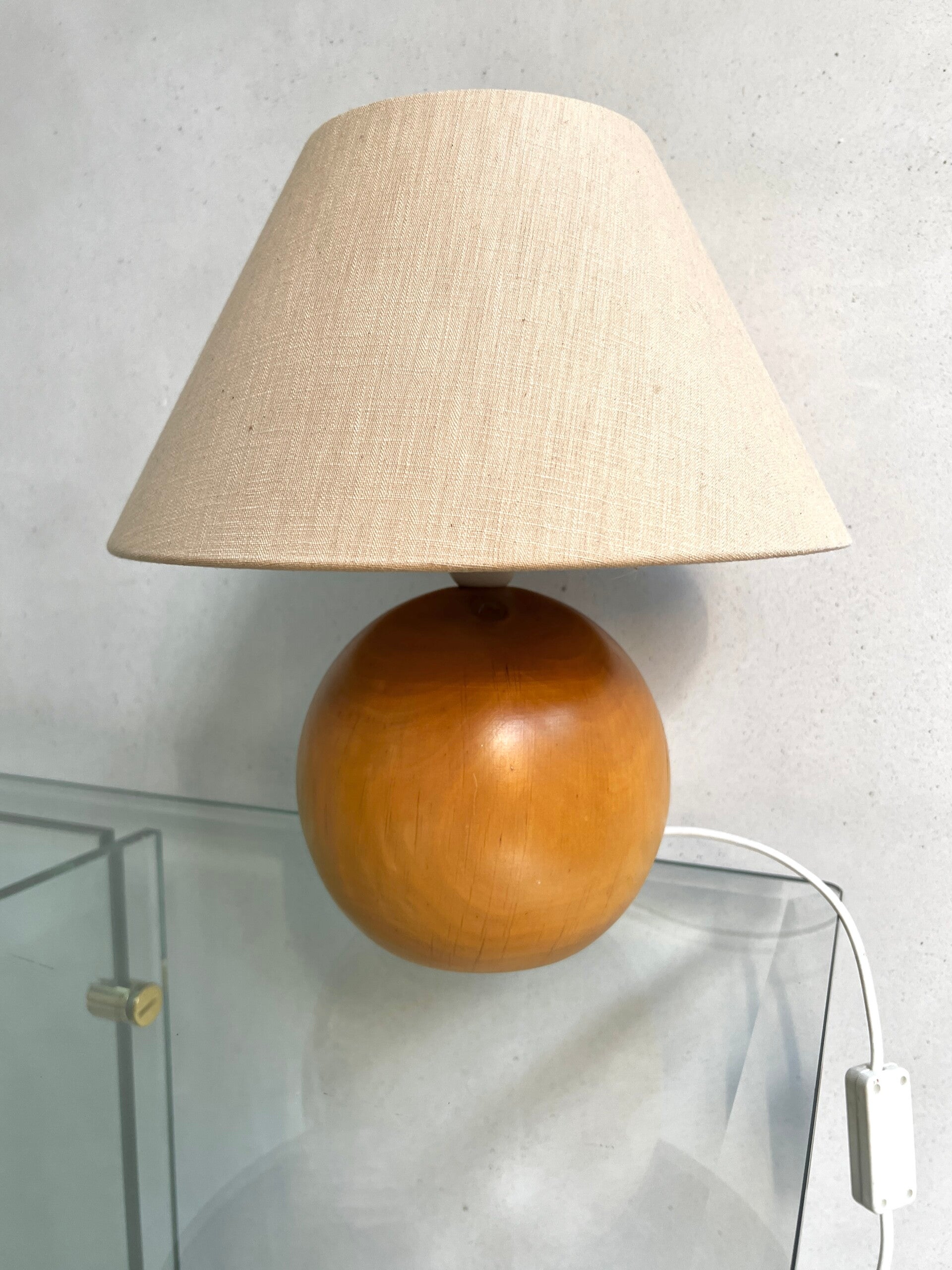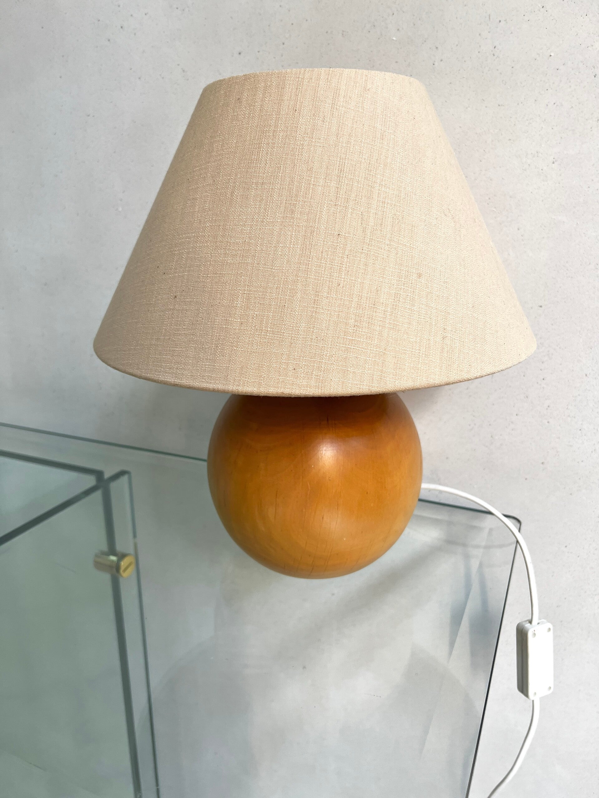 Prachtig tafellampje staat mooi in elk interieur. De bol is van massief hout uit een stuk gedraaid. Het kapje is beige van kleur.