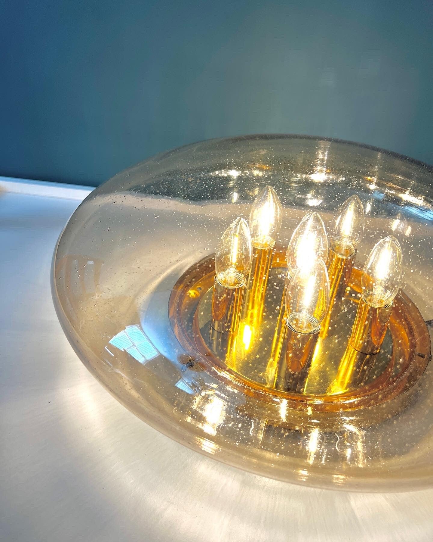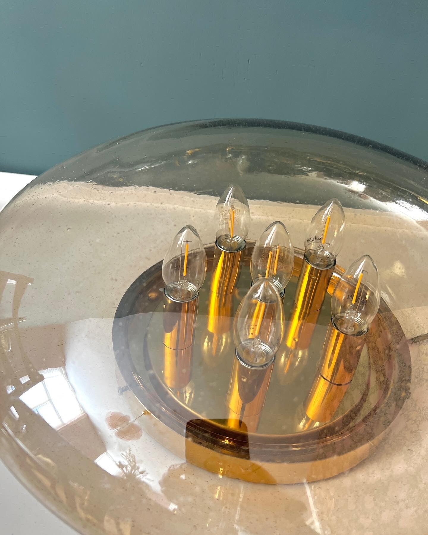 De lamp heeft amberkleurig glas met luchtbelletjes. Een messing armatuur met 6 lichtpunten verlichten je hele kamer. Dat wil je toch gewoon!