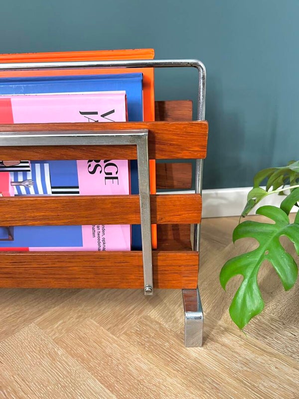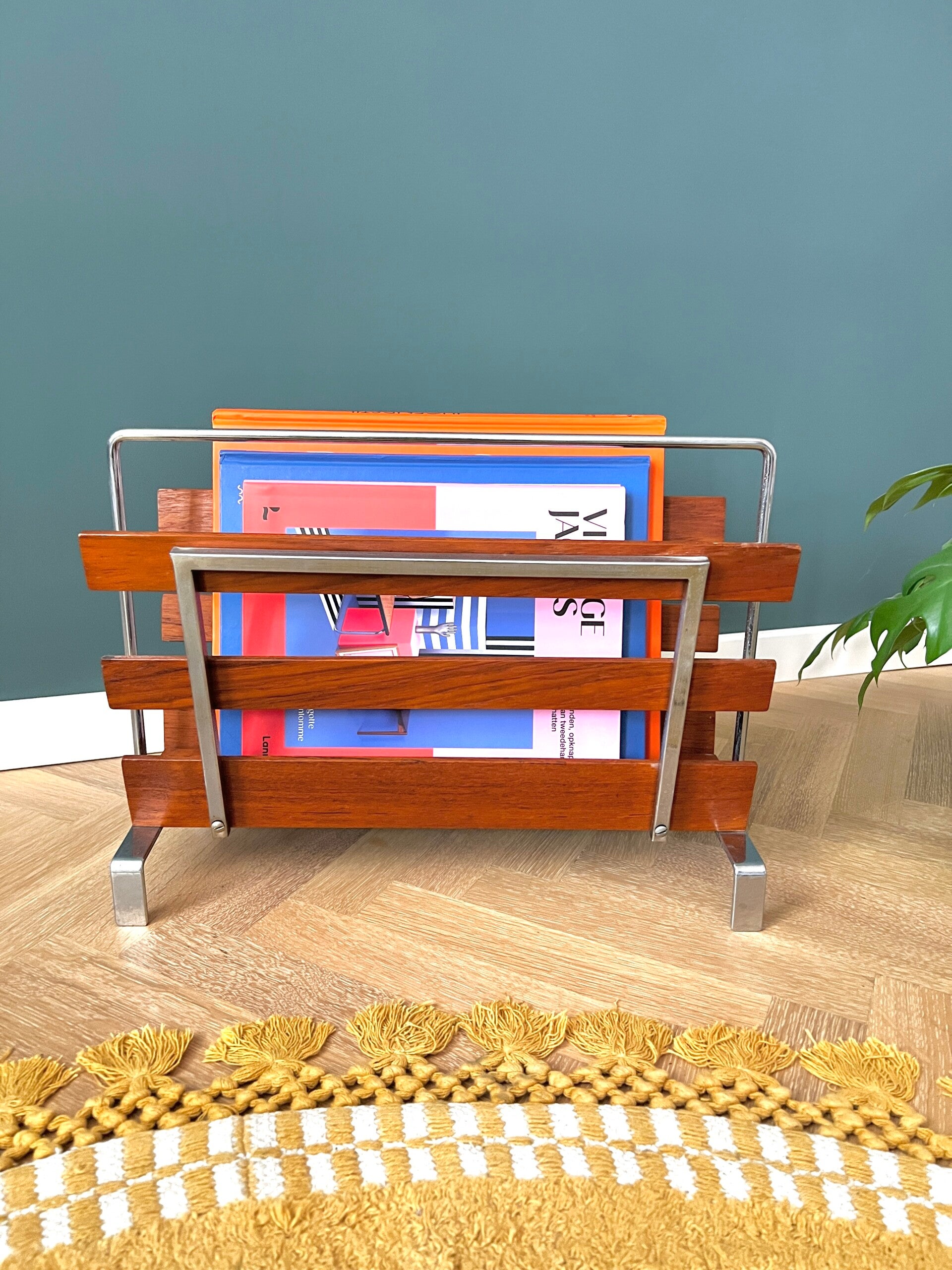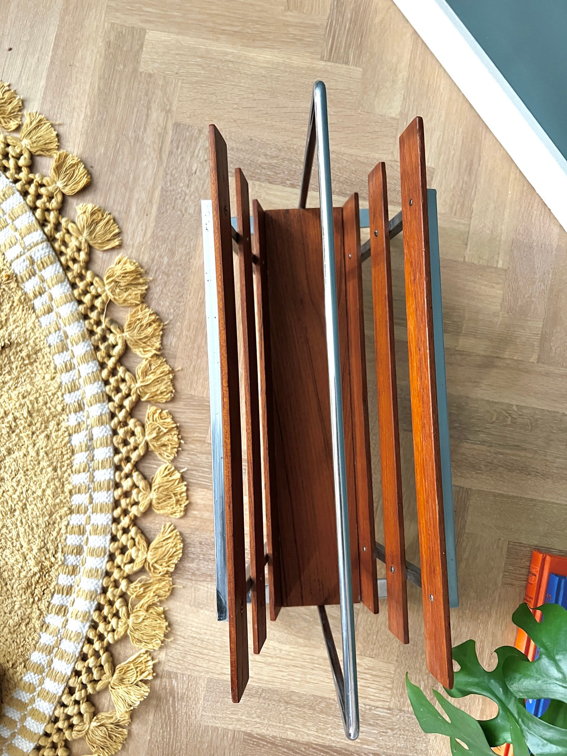 Supergaaf tijdschriftenrek uit de jaren 60, gemaakt van teakhout in metalen rekje 👌🏻 Deze zal prachtig staan in elk interieur😍