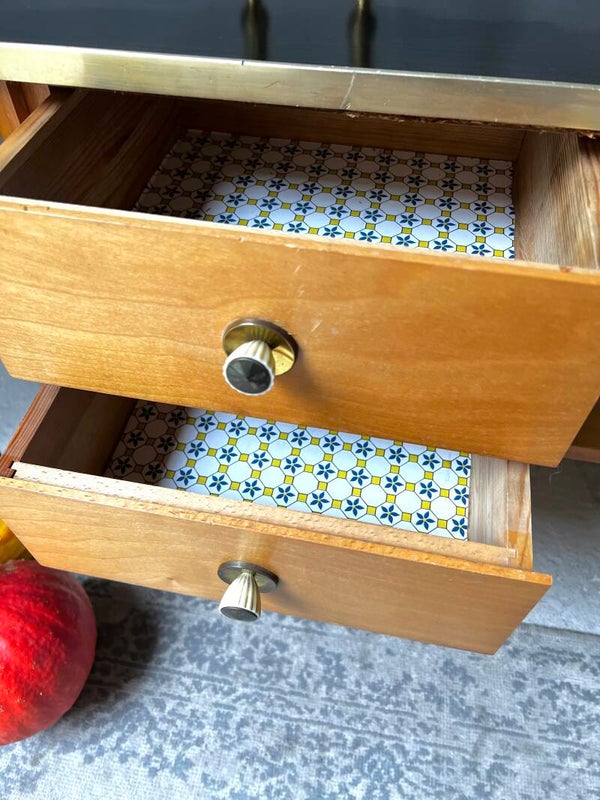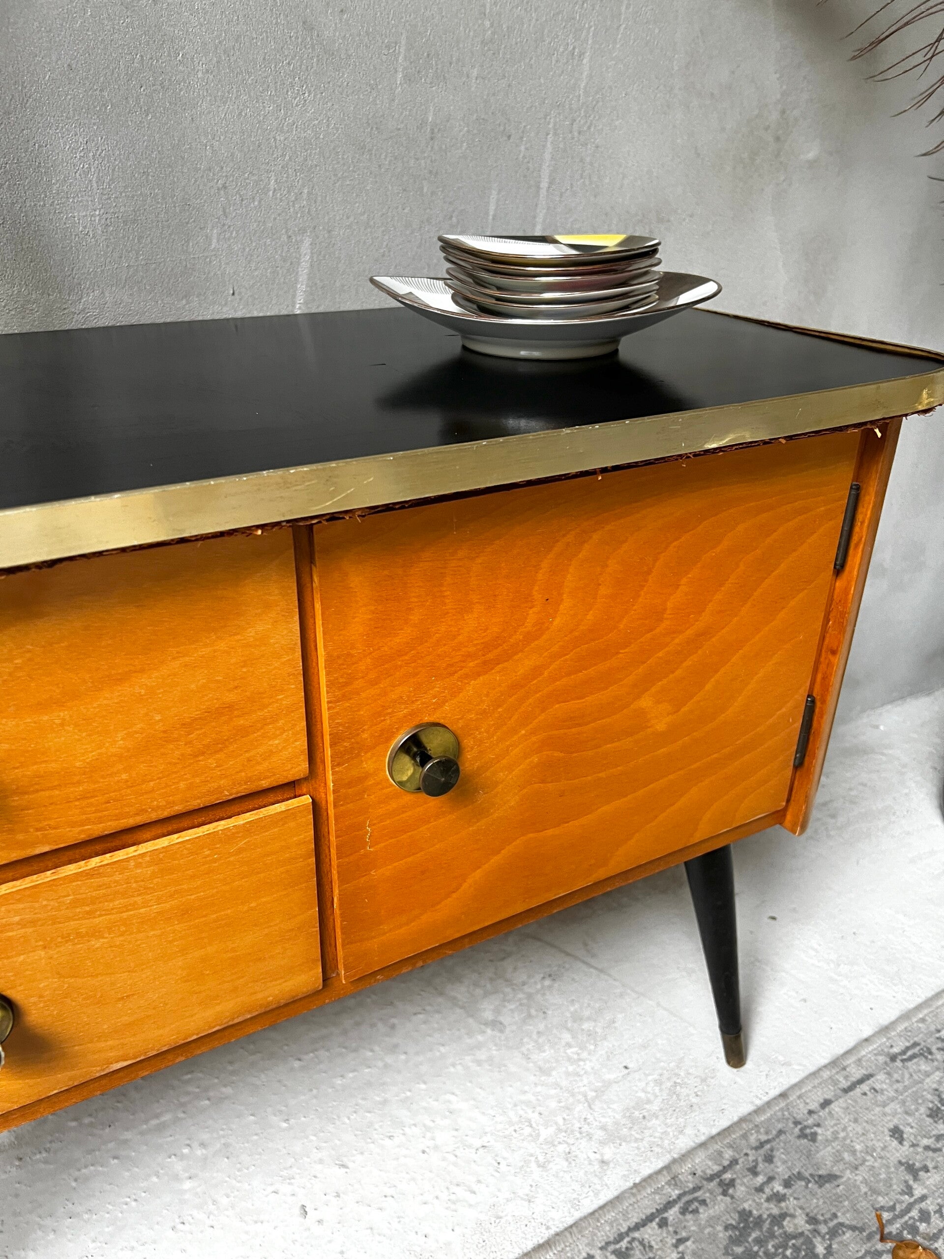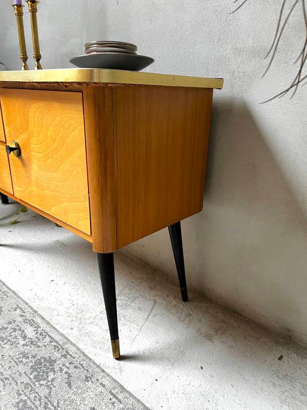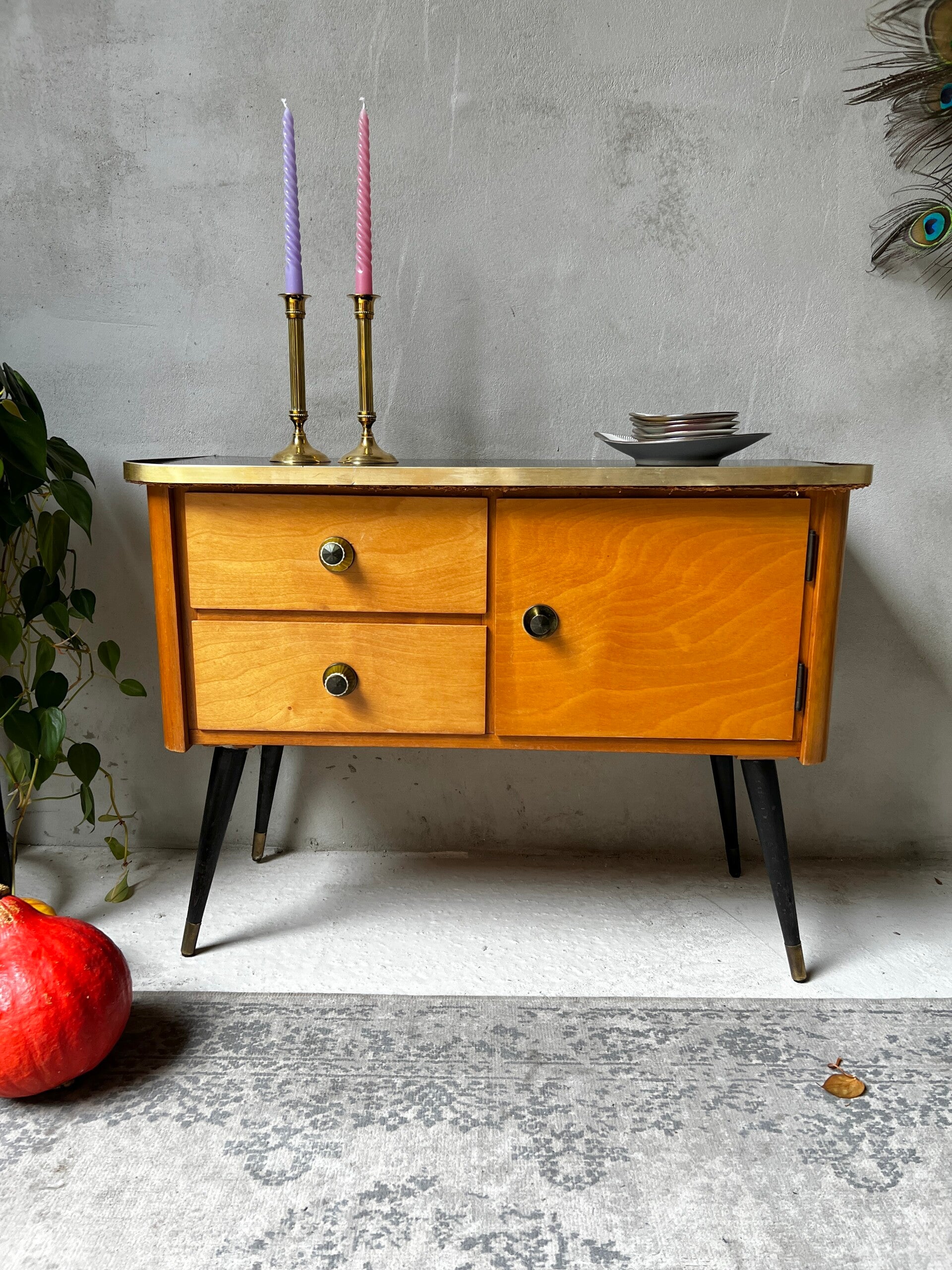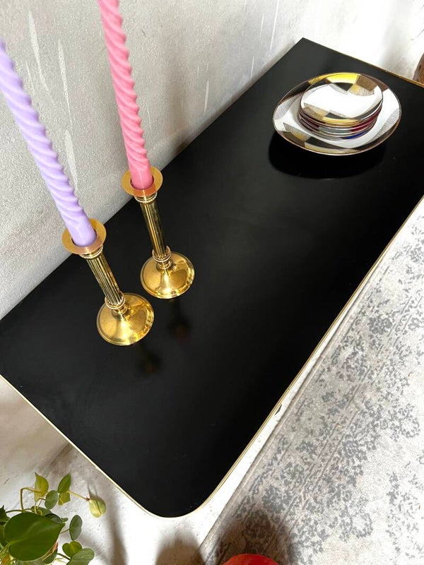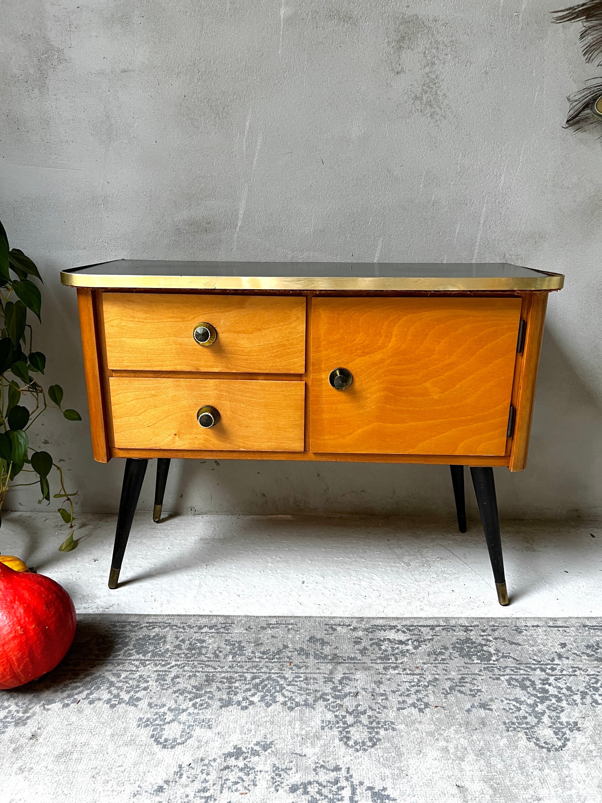 Heel erg leuk kastje met zwart bovenblad en goudkleurige trim. Aan een kant twee laadjes en aan de andere kant een deurtje. Het kastje heeft hoge pootjes en messing sokjes🥰