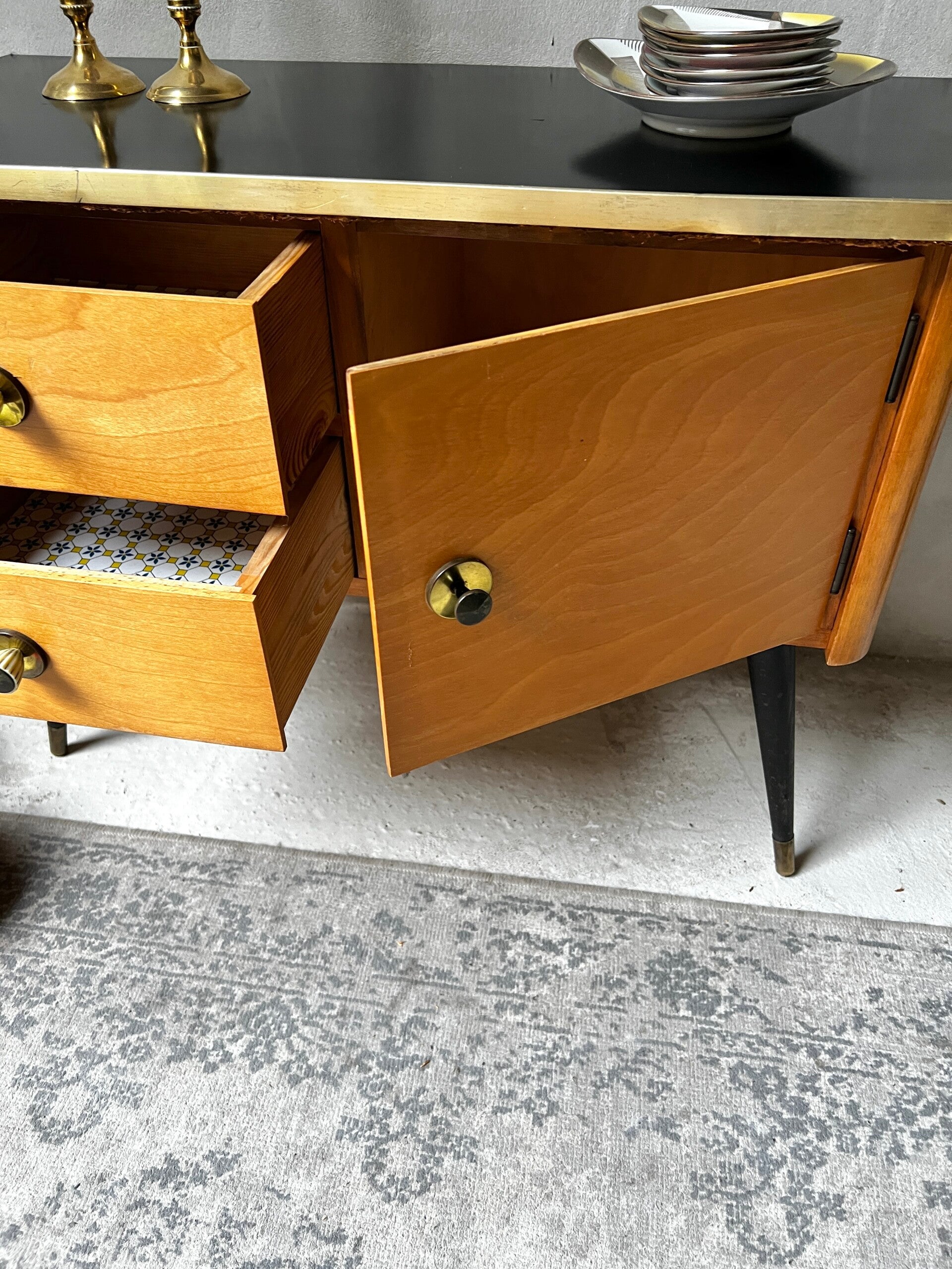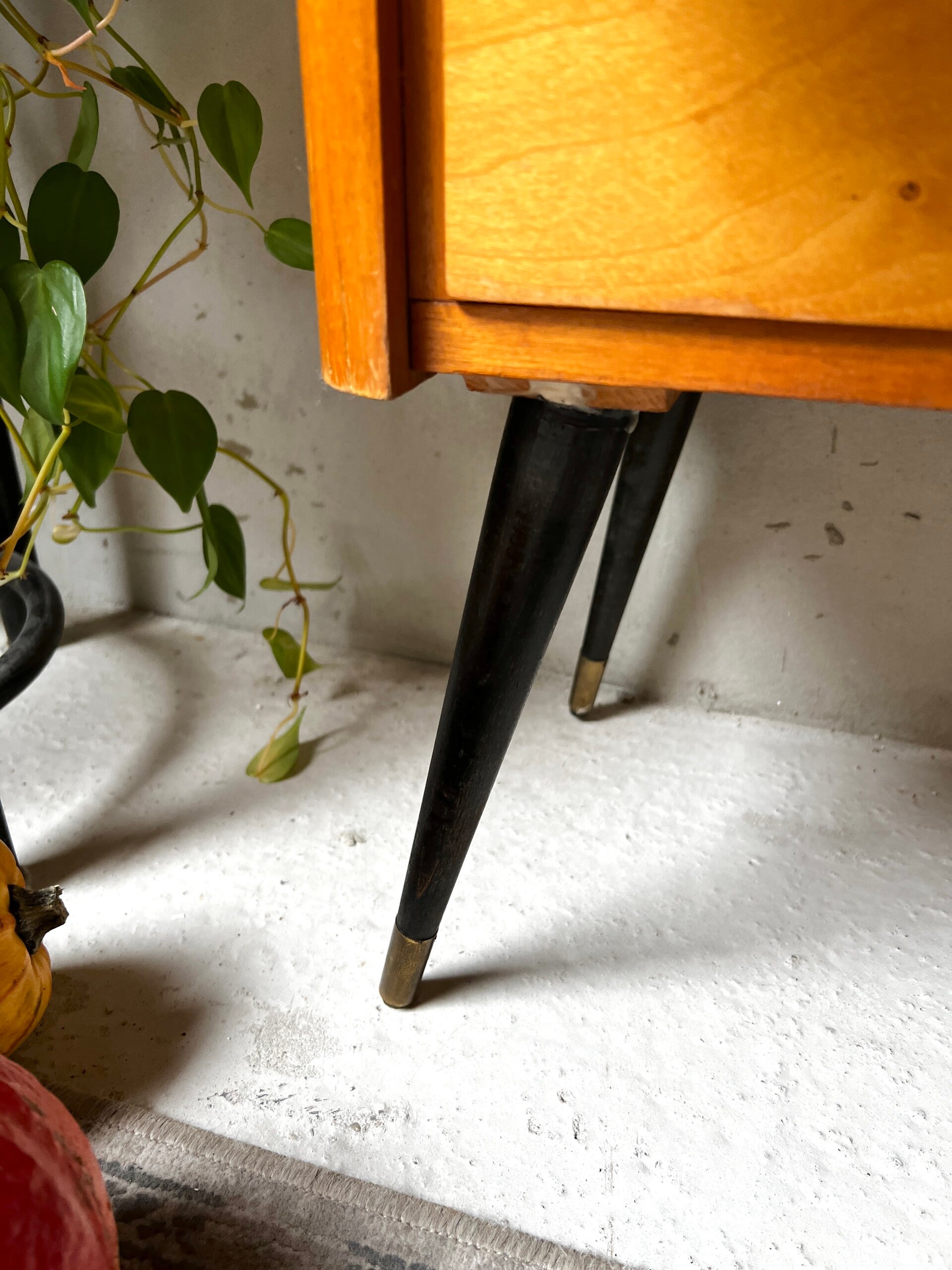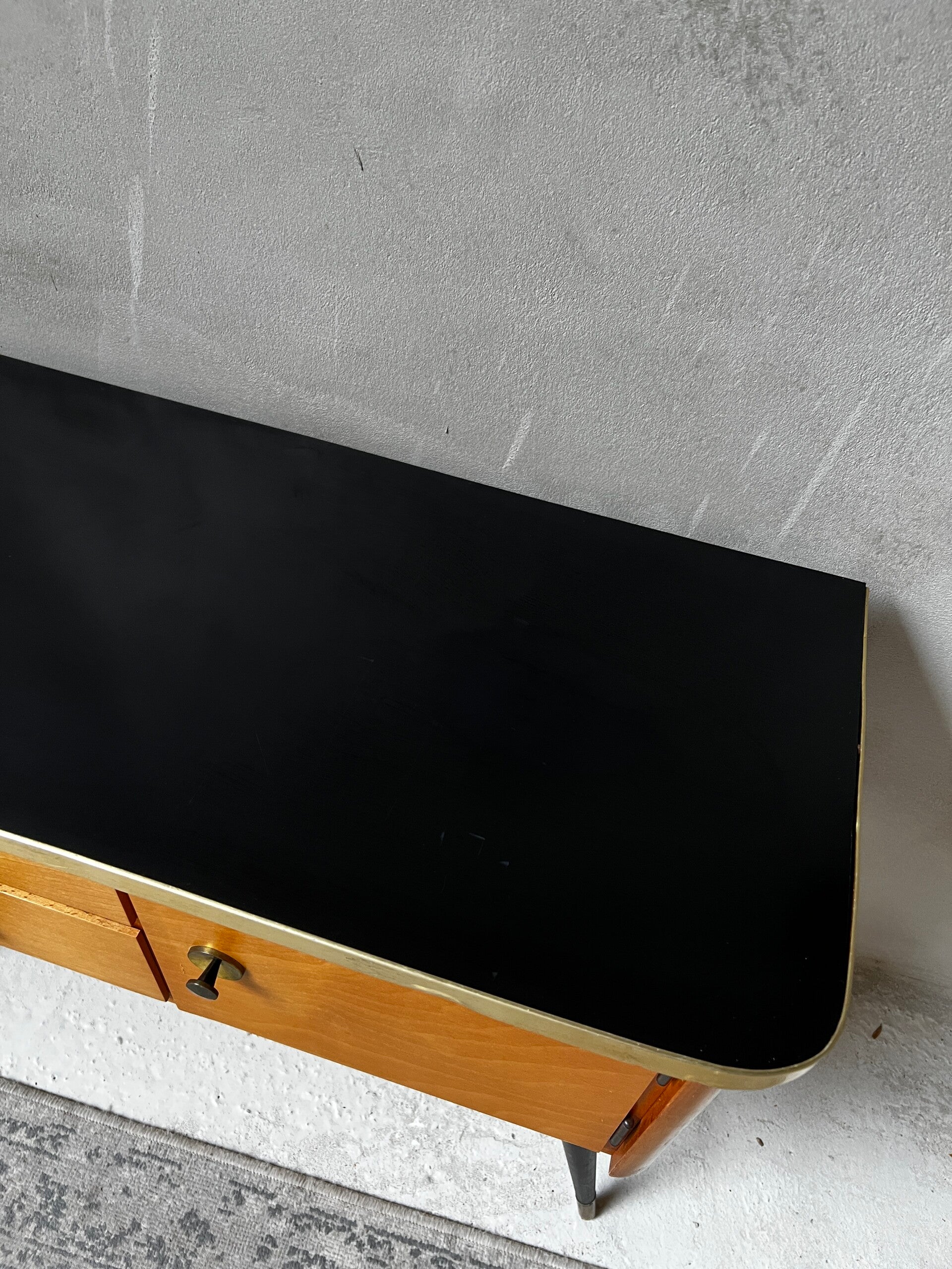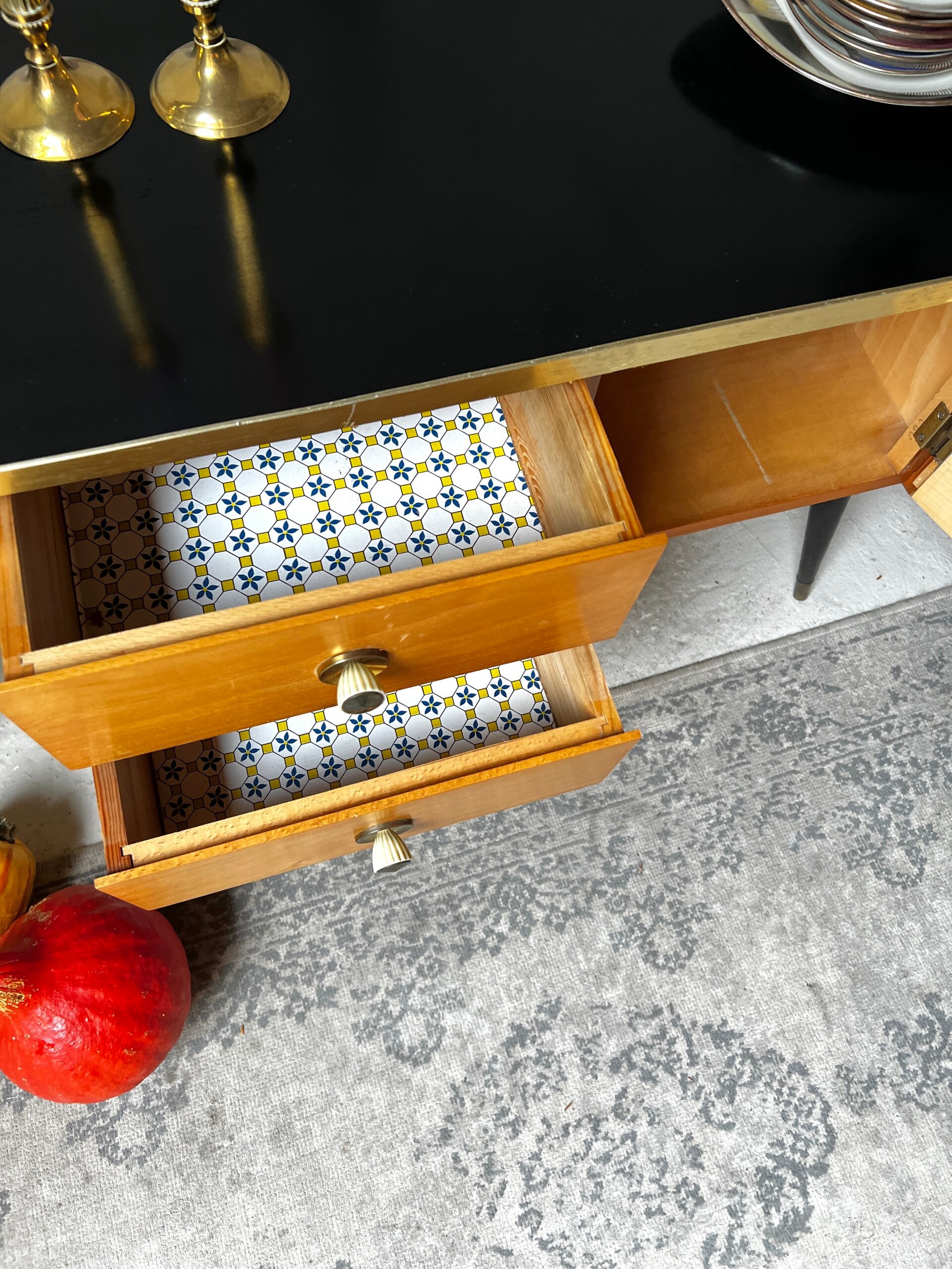 Heel erg leuk kastje met zwart bovenblad en goudkleurige trim. Aan een kant twee laadjes en aan de andere kant een deurtje. Het kastje heeft hoge pootjes en messing sokjes🥰