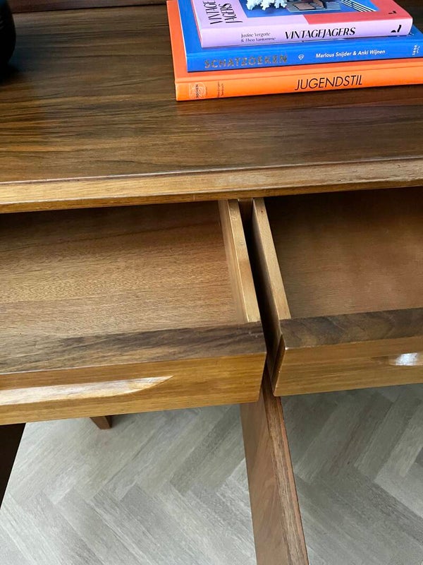 Zeer bijzonder dressoir. Dit dressoir is ook nog een secretaire. Want deze kun je heel eenvoudig ombouwen. Door een verborgen toets in te drukken kun je het ladenblok naar voren trekken en wordt het een secretaire. Het is een heel bijzonder en uniek meubelstuk waar we geen tweede van hebben kunnen vinden.