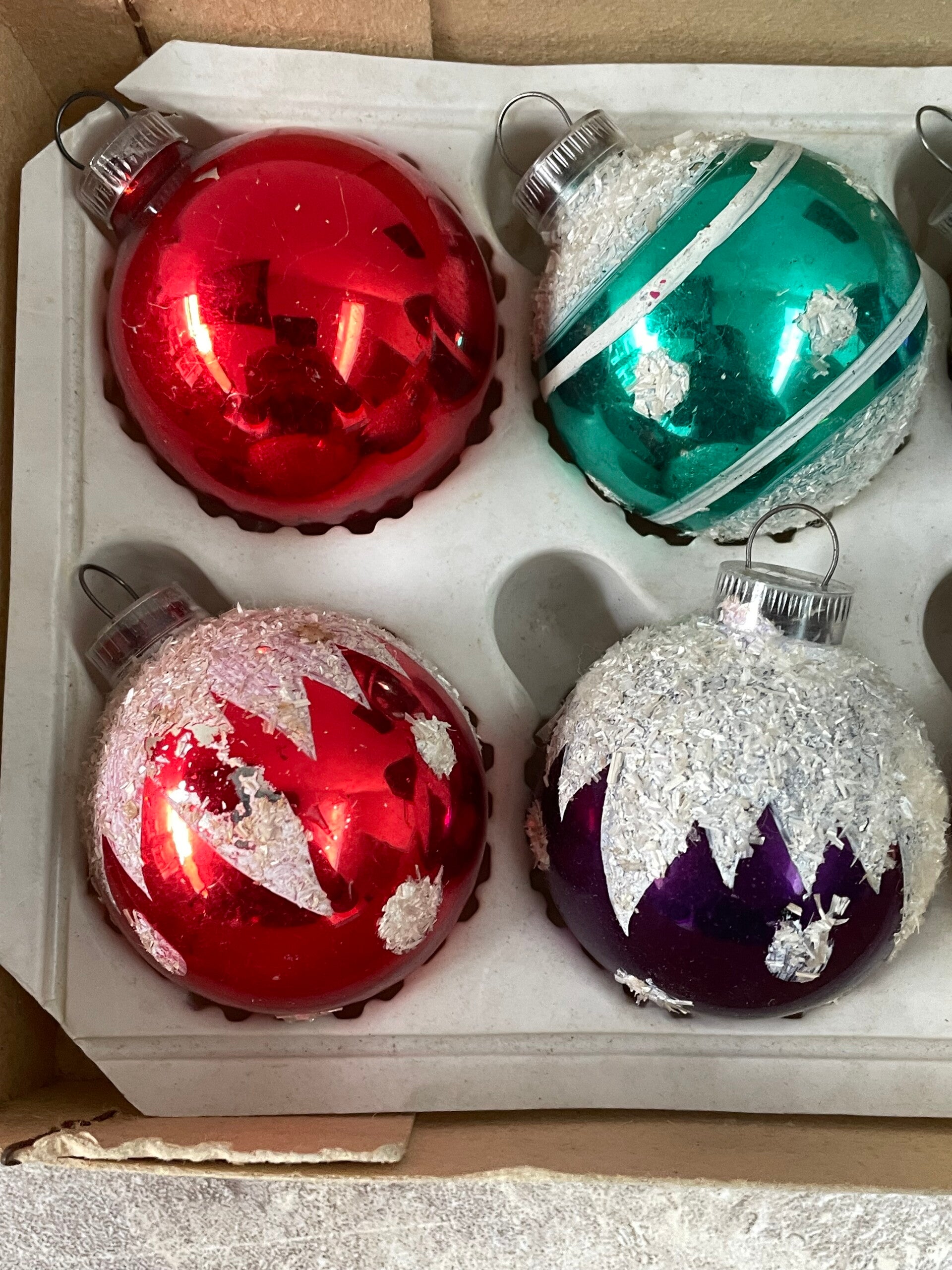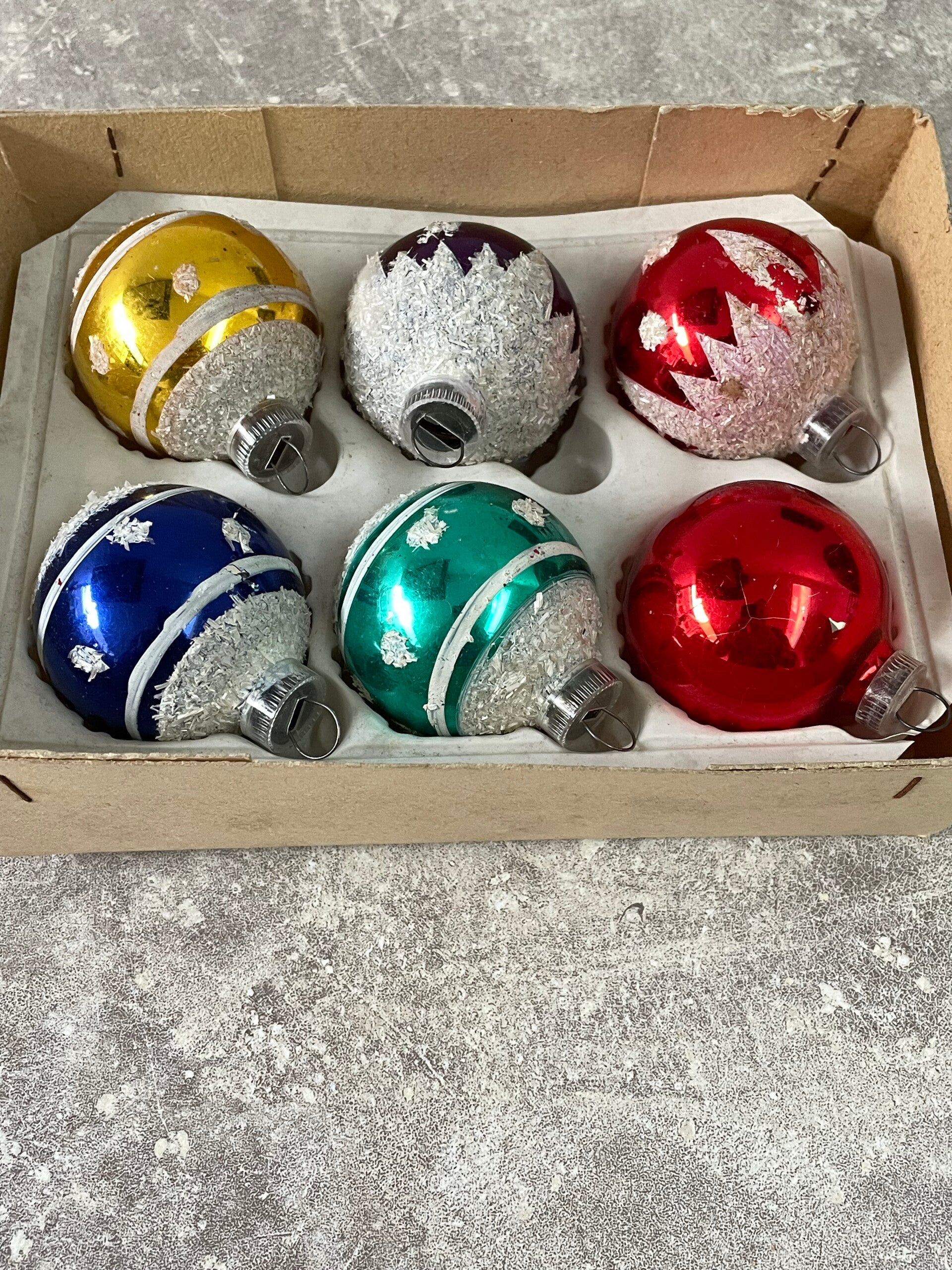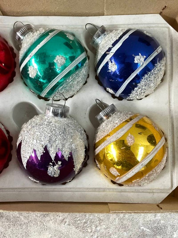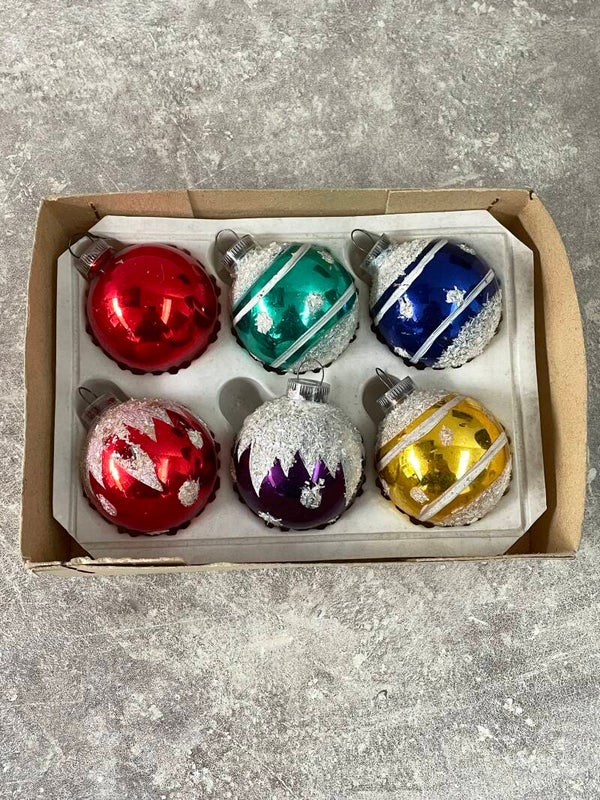Set van 6 Vintage Gekleurde Kerstballen met Sneeuw 5cm