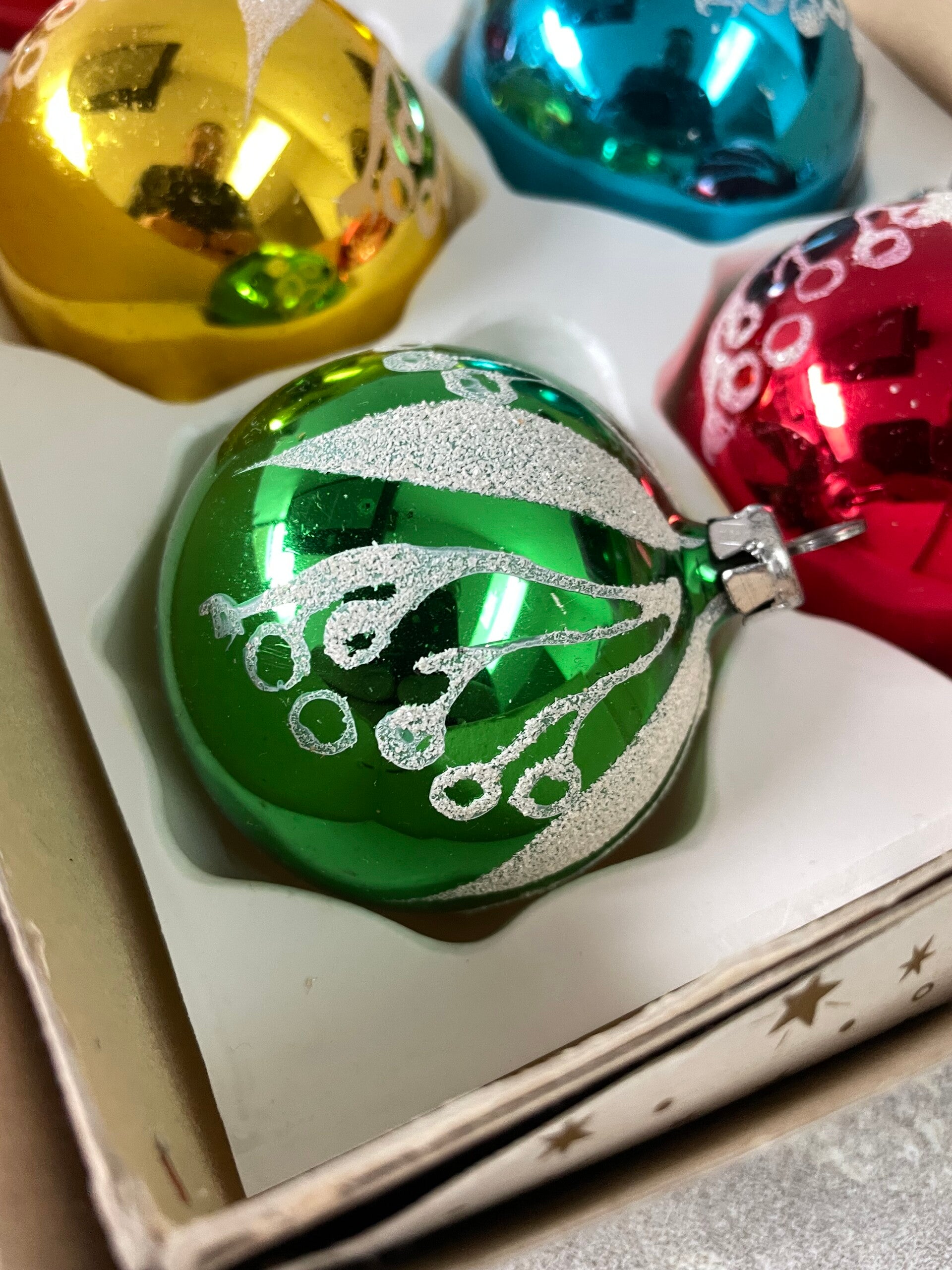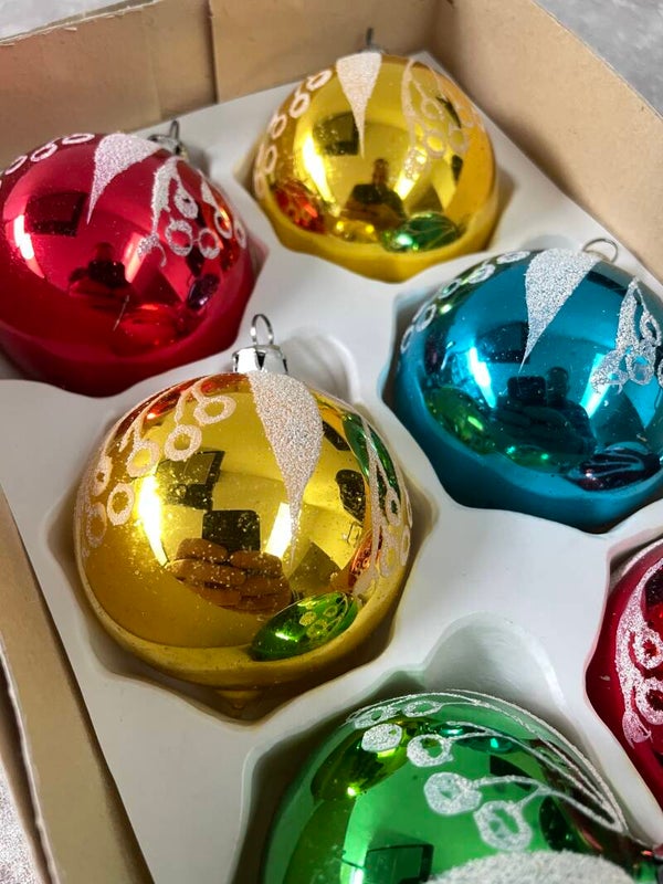 Oude Kerstballen Geel Blauw Groen Rood besneeuwd in originele doos doorsnee kerstbal 6cm