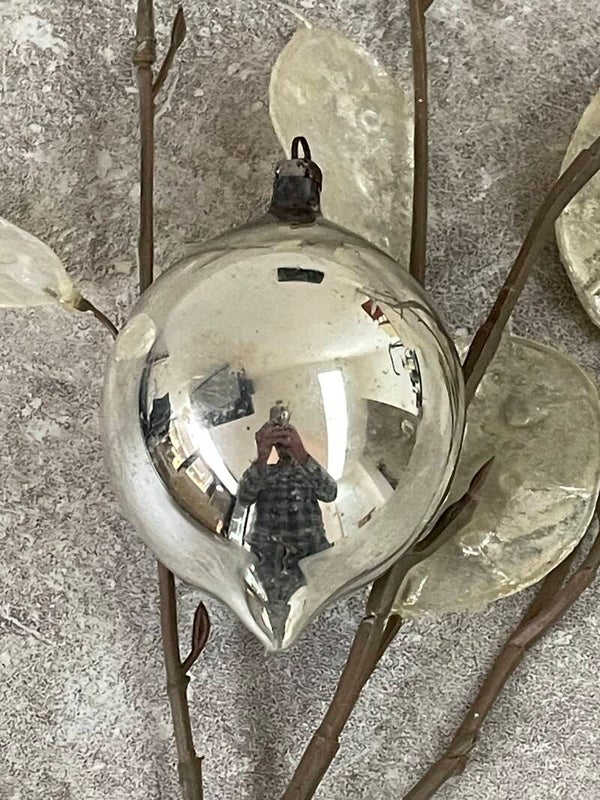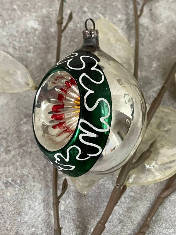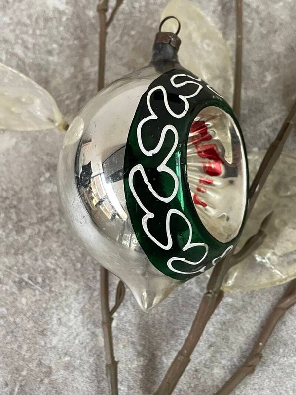 Antieke Kerstbal Deukbal Zilver Groen en Rood 9cm Hoog 6 cm doorsnee