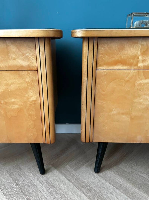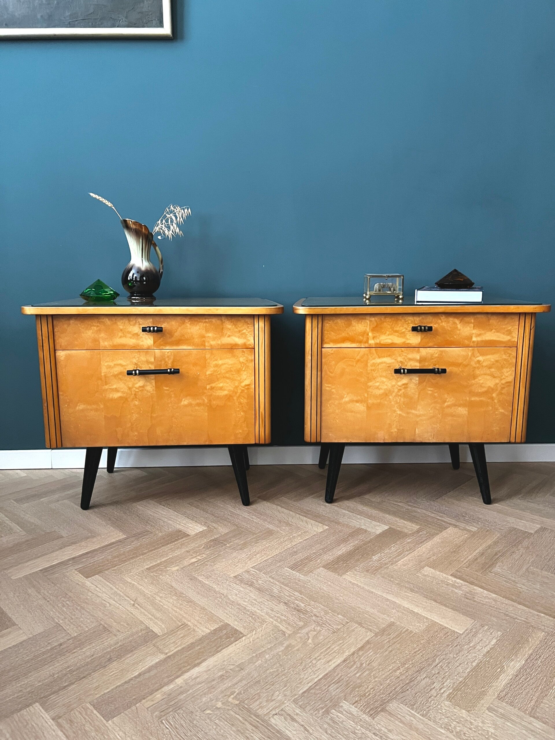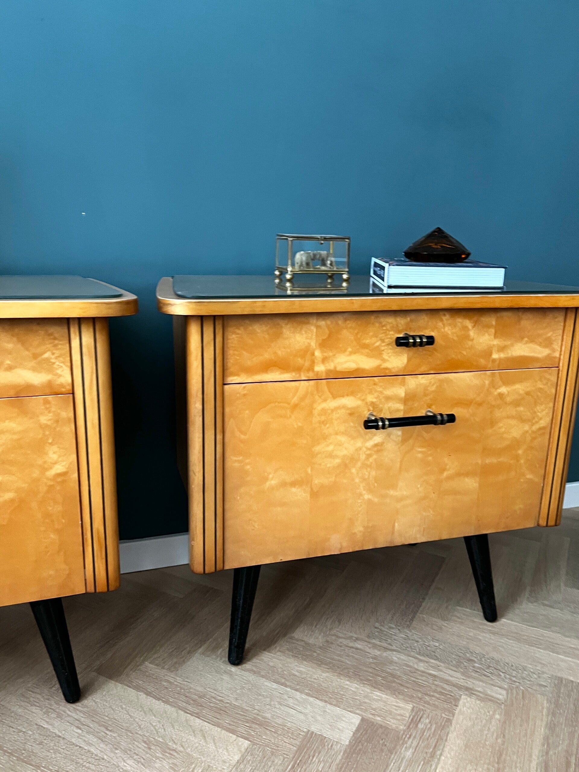 Deze vintage nachtkastjes (set) zijn toch helemaal geweldig! Ze staan op zwarte pootjes, zijn gefineerd en met zwarte streepjes afgewerkt. Bovenop zijn de glasplaten nog aanwezig.