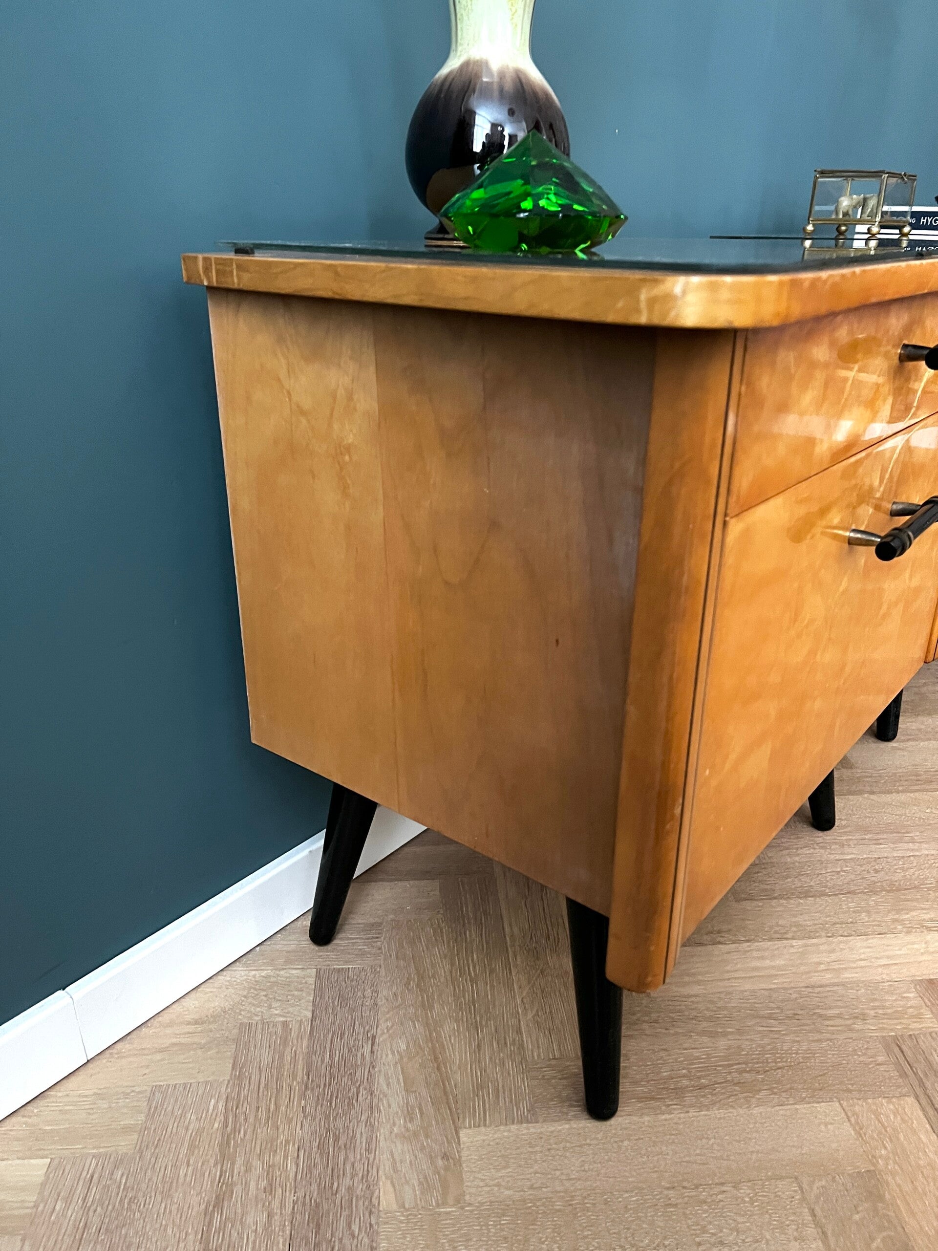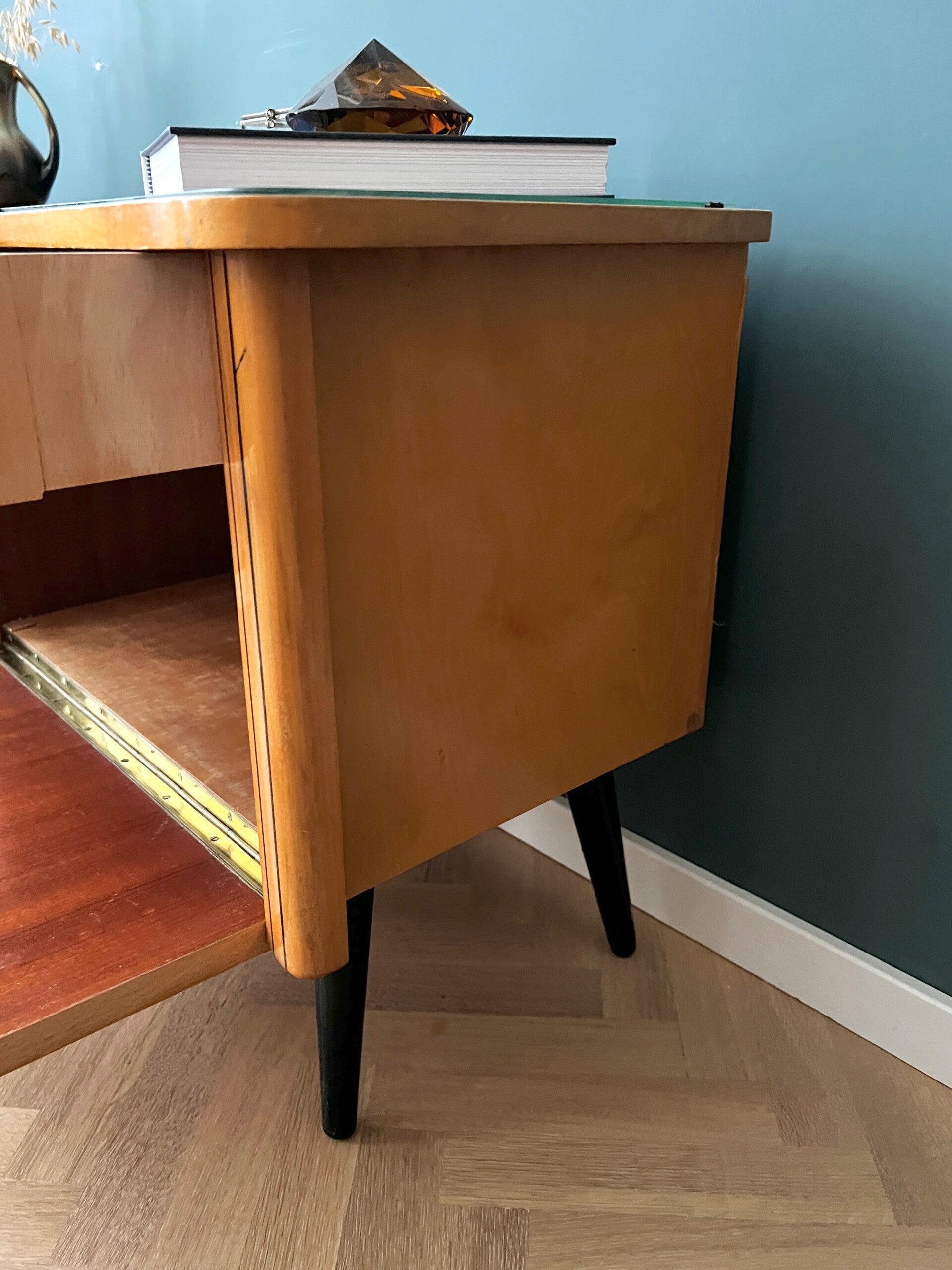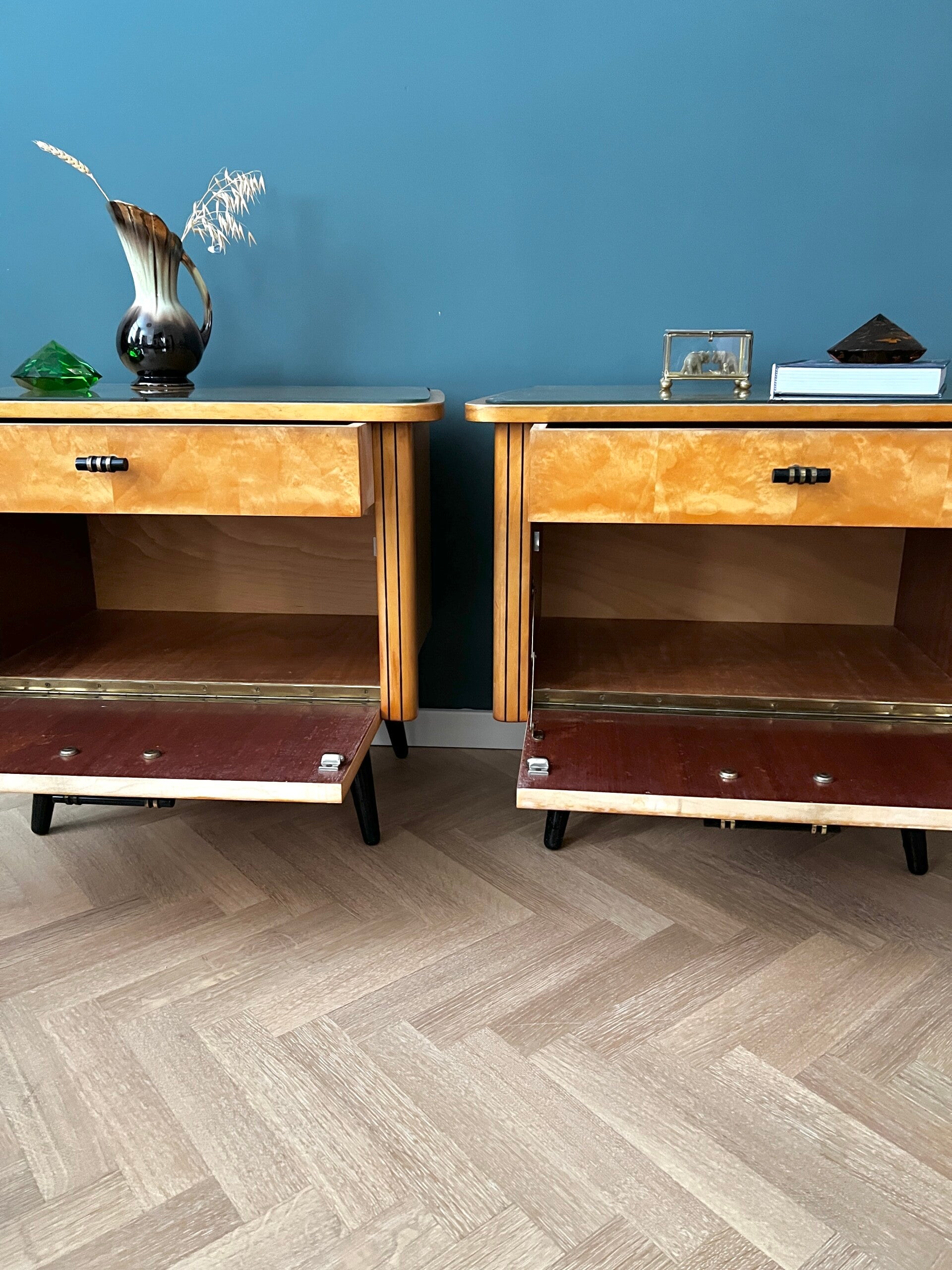 Deze vintage nachtkastjes (set) zijn toch helemaal geweldig! Ze staan op zwarte pootjes, zijn gefineerd en met zwarte streepjes afgewerkt. Bovenop zijn de glasplaten nog aanwezig.