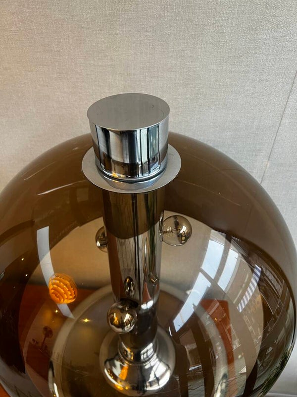 Grote space age Mushroom tafellamp uit de jaren 70. De lamp heeft een chromen voet en een bruine