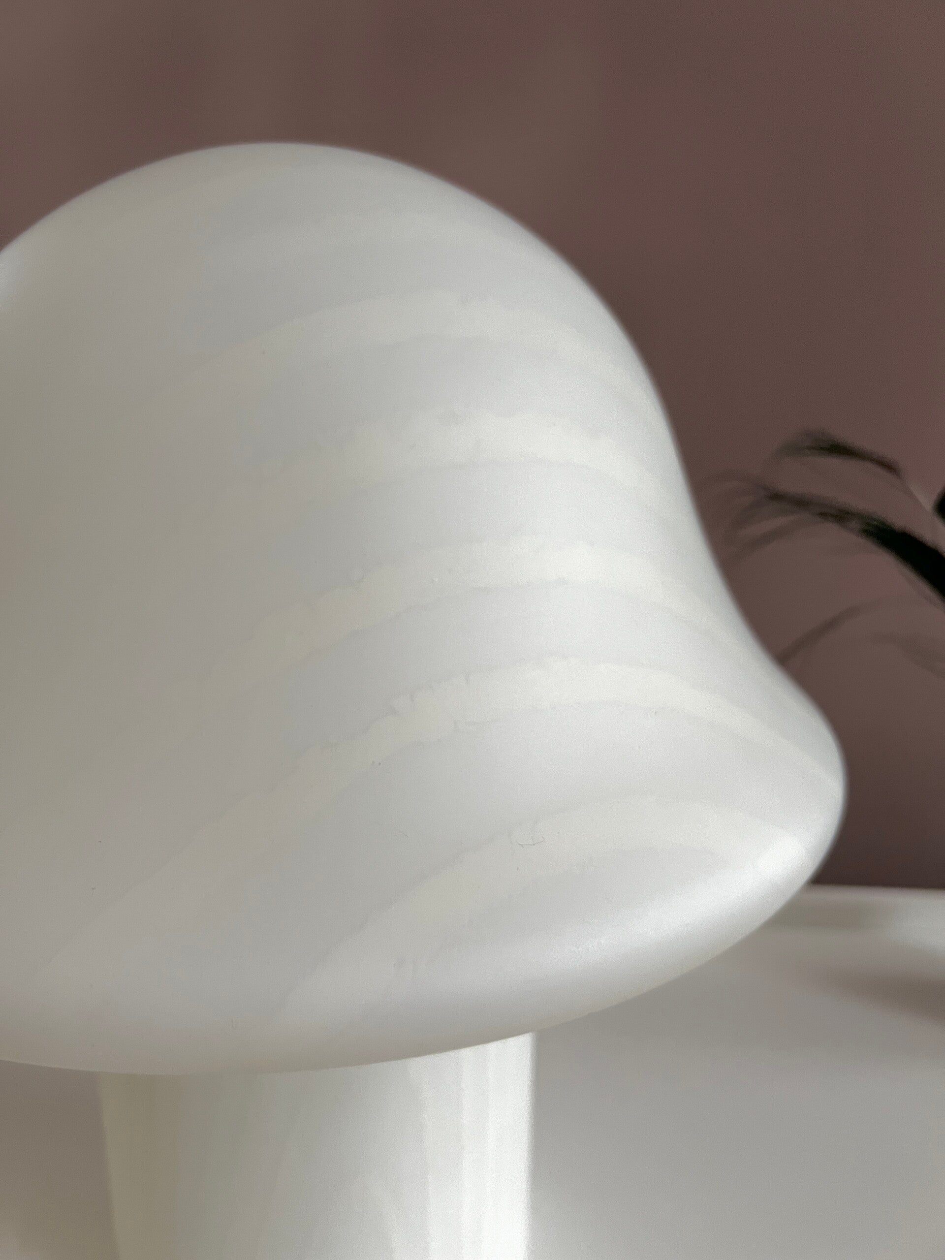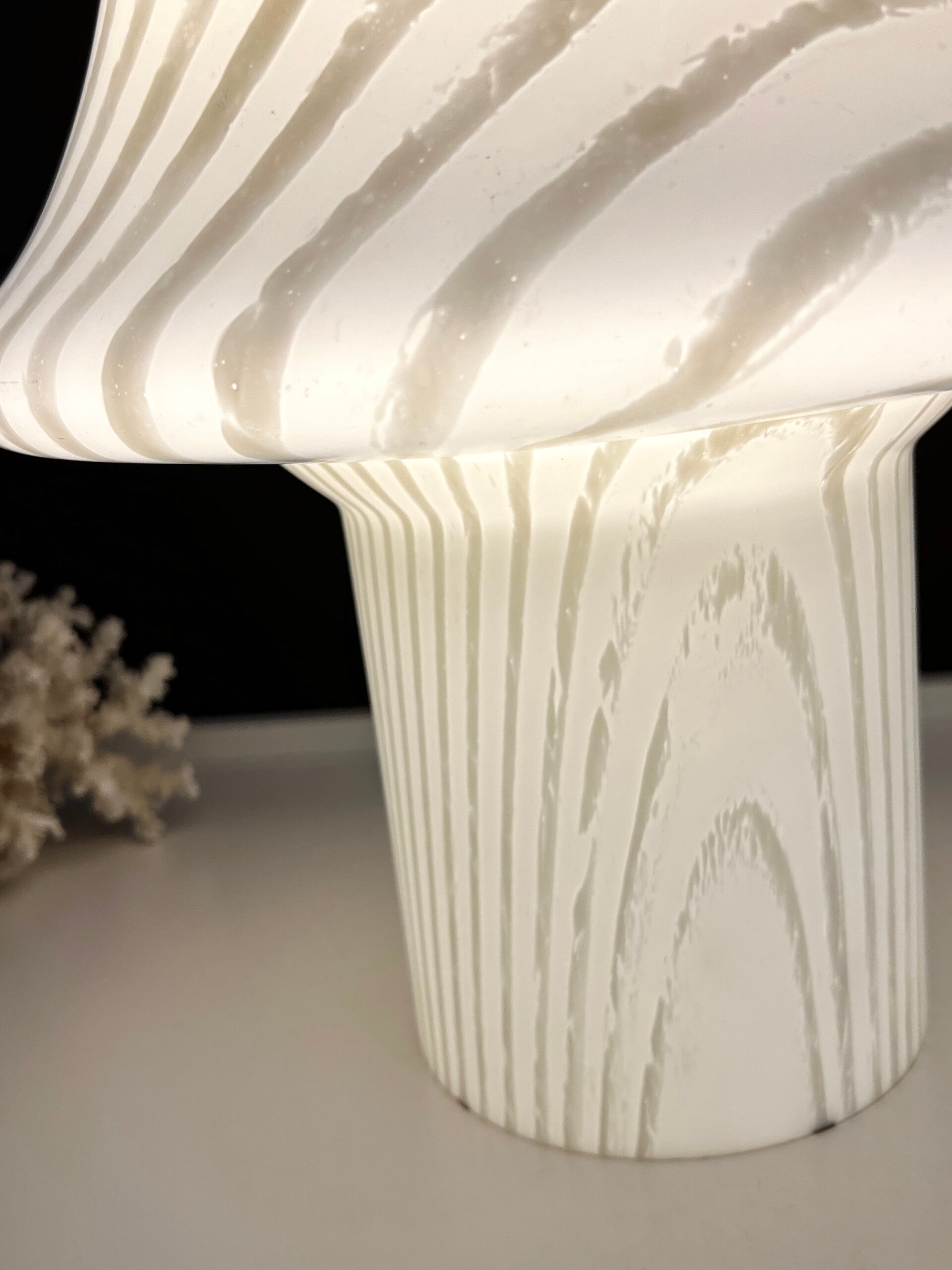 Beauty alert ❥ Hele gave XXL mushroom tafellamp van het bekende merk Peill & Putzler. Dit is een waar stijl icoon die vervaardigd is in de jaren 70. Hij is mondgeblazen uit een stuk gestreept opaalglas. De lamp geeft een mooi schaduwlicht op de muurෆ