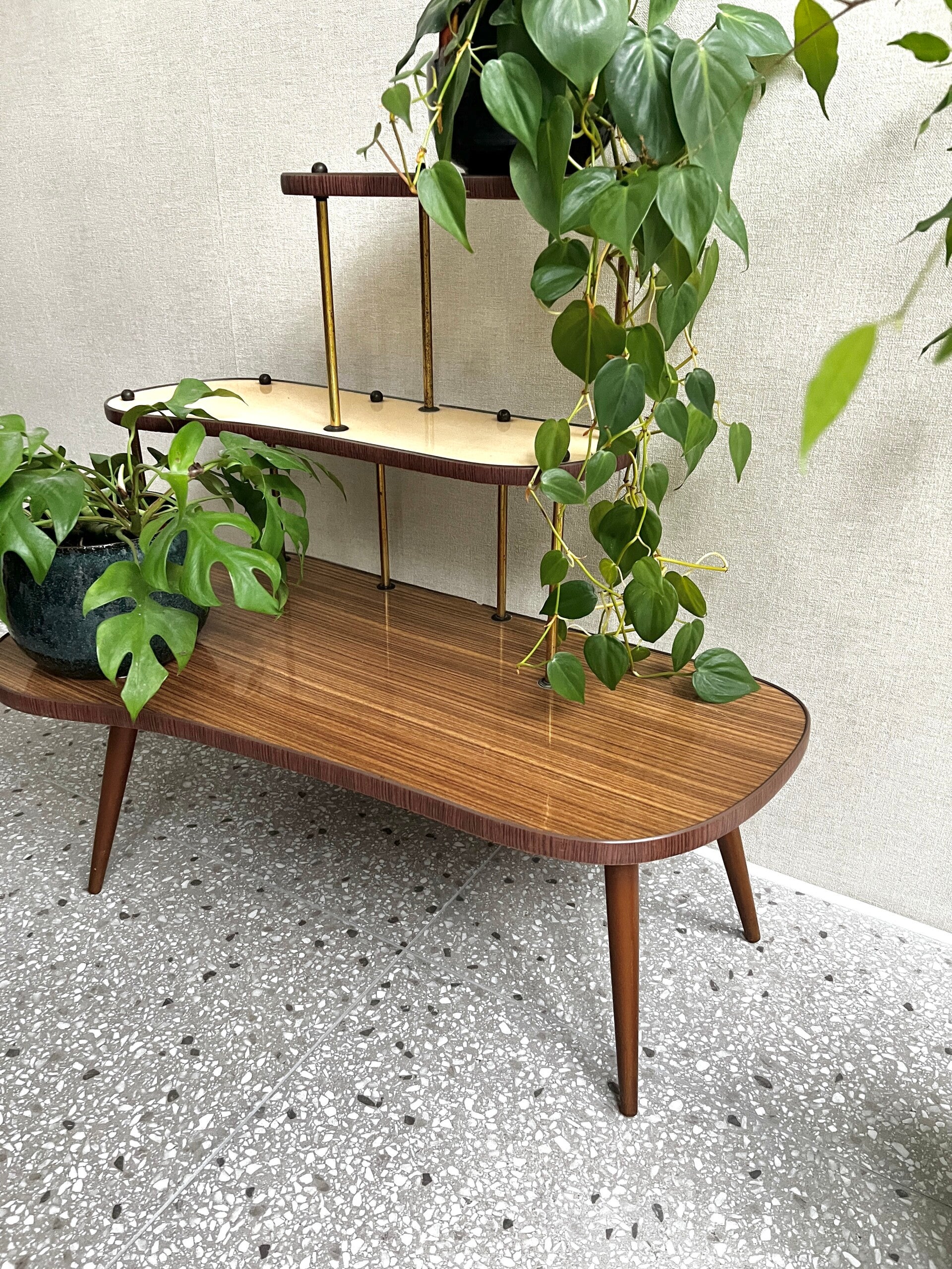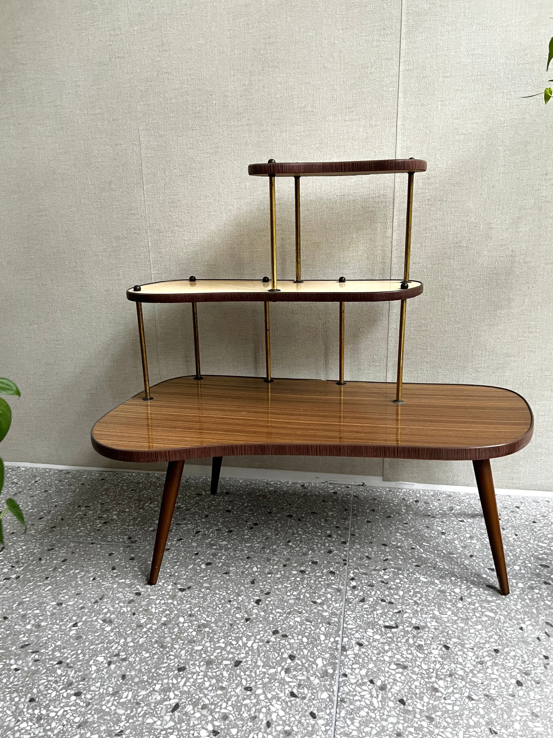Onwijs toffe mid-century planten-etagère/standaard, de bladen zijn van formica. Deze etagère is afkomstig uit de 50’s 60’s en verkeert nog in een mooie staat😍 Super leuk om mee te stylen🪴🌱