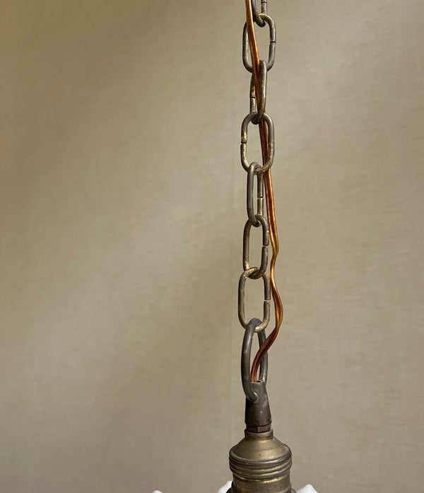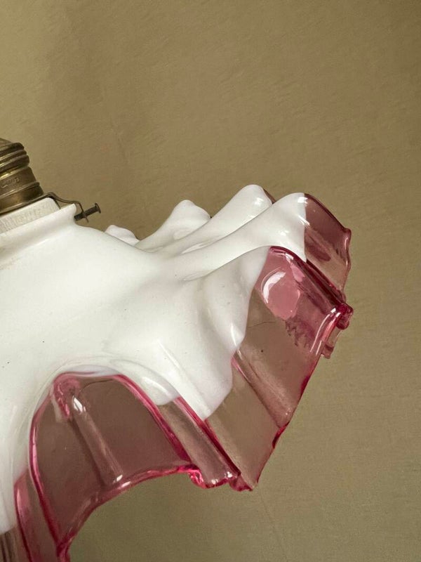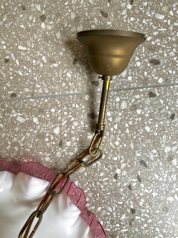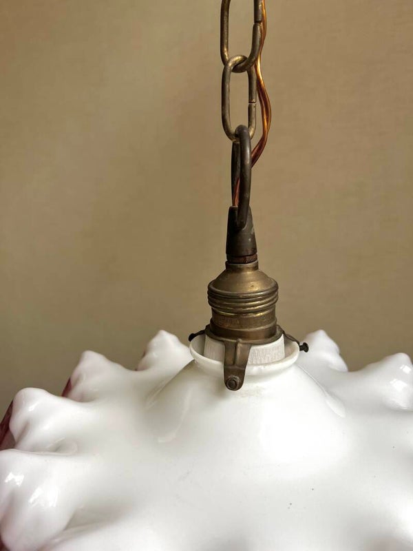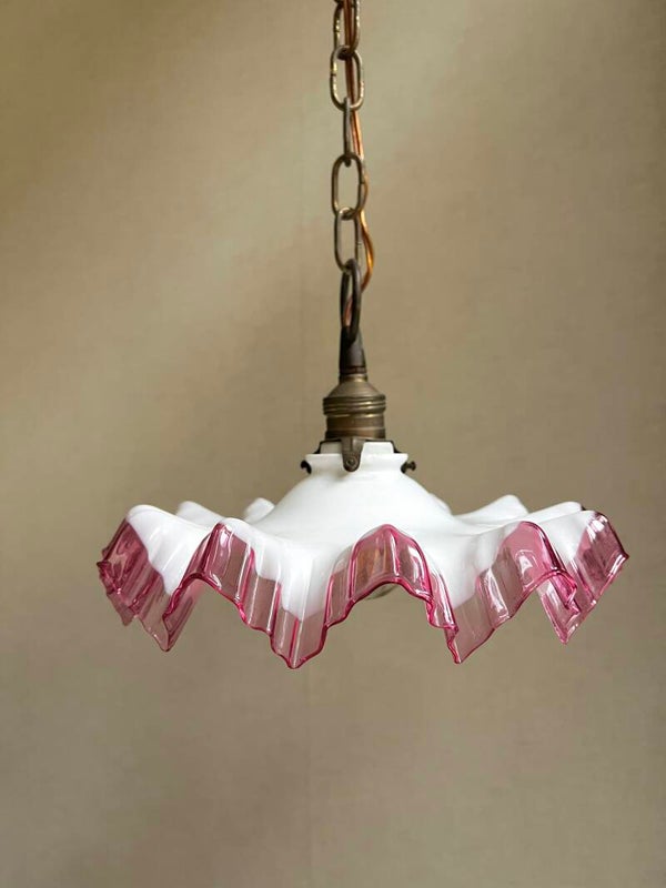 Unieke Piecrust hanglamp uit Frankrijk. Afkomstig uit de Art-Deco periode (1920/1930) De lamp is gemaakt van wit opaline glas en dit exemplaar heeft een roze rand. Compleet met ketting en plafondkap. Bedrading is nagekeken en oké bevonden. De vintage hanglamp is in een zeer goede vintage staat👌🏻
