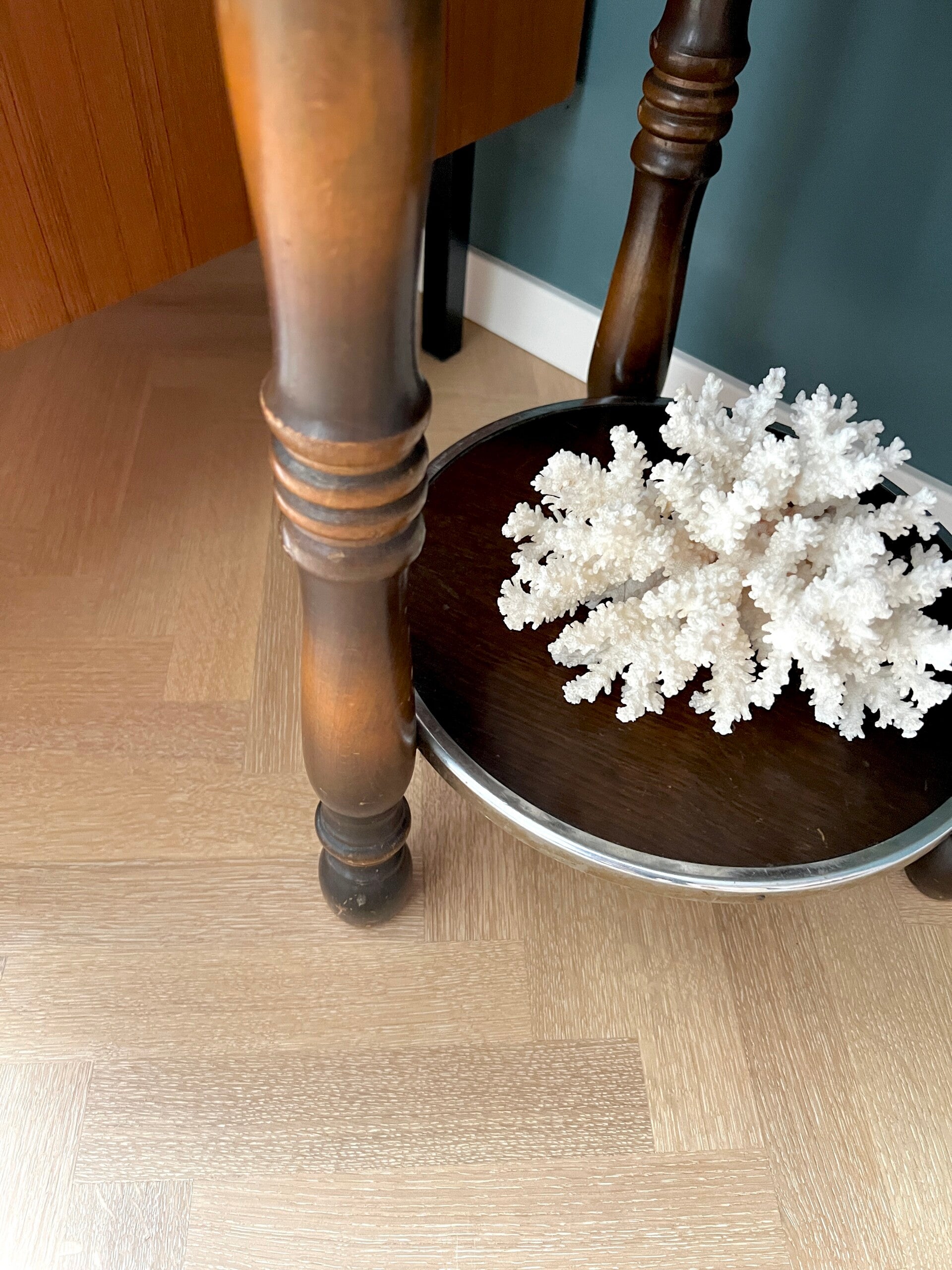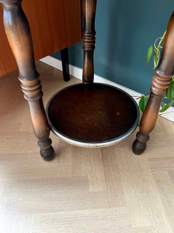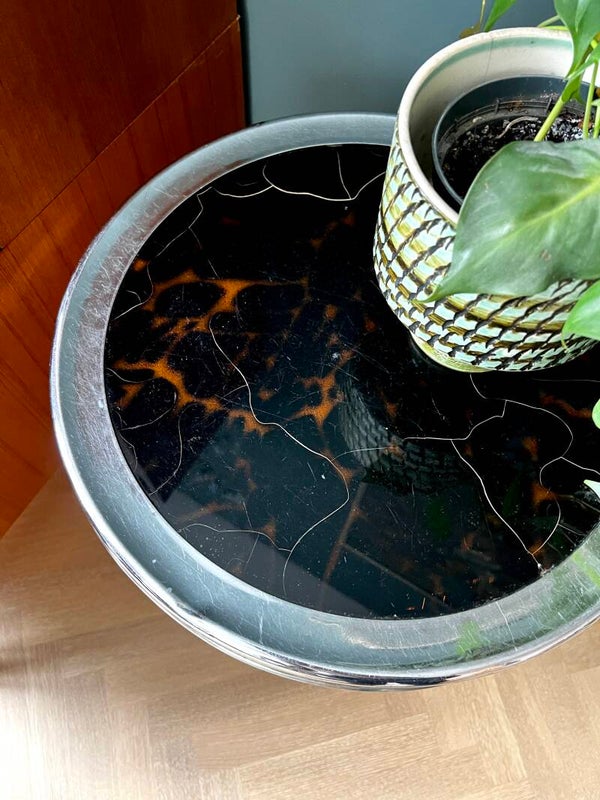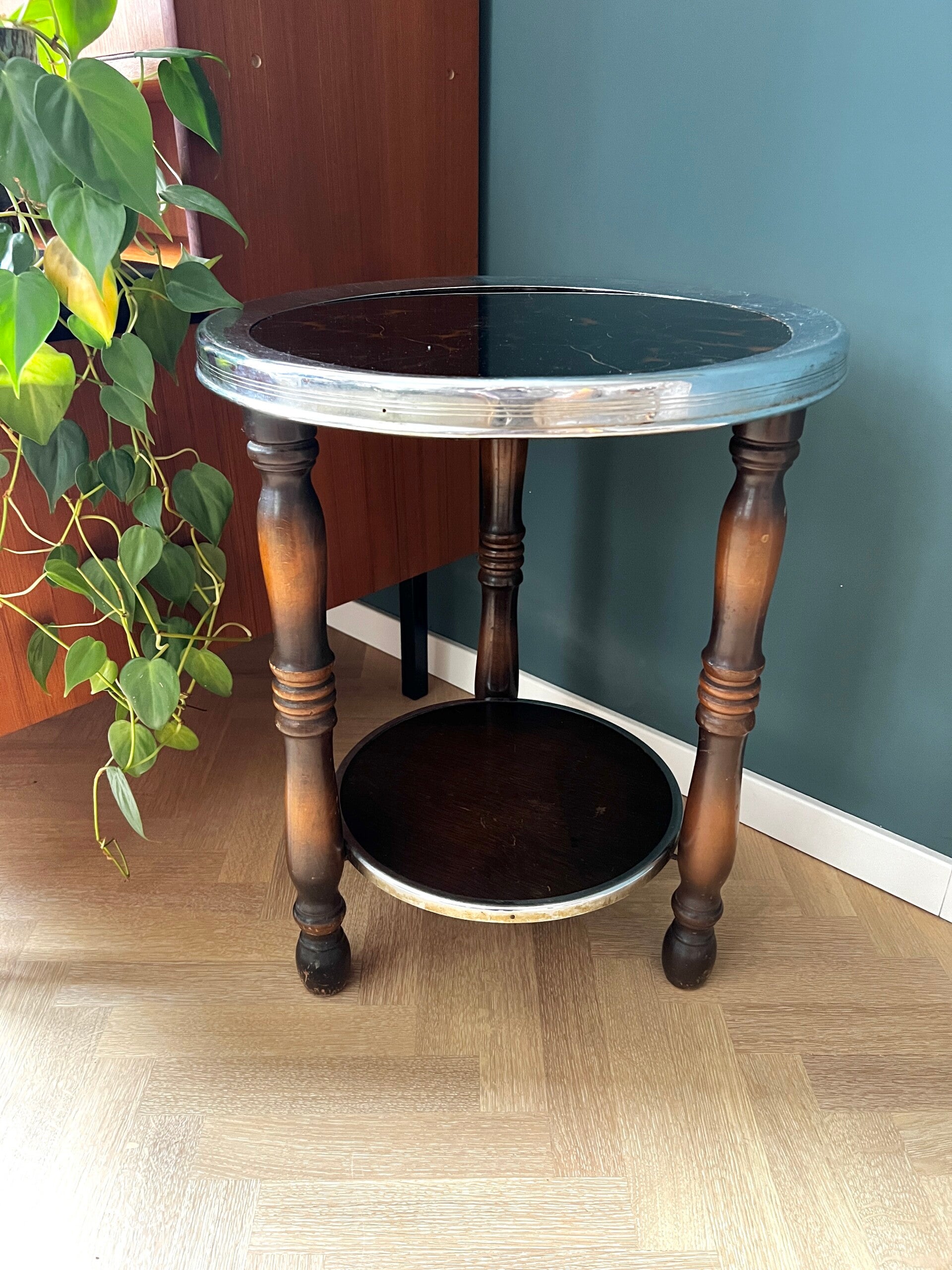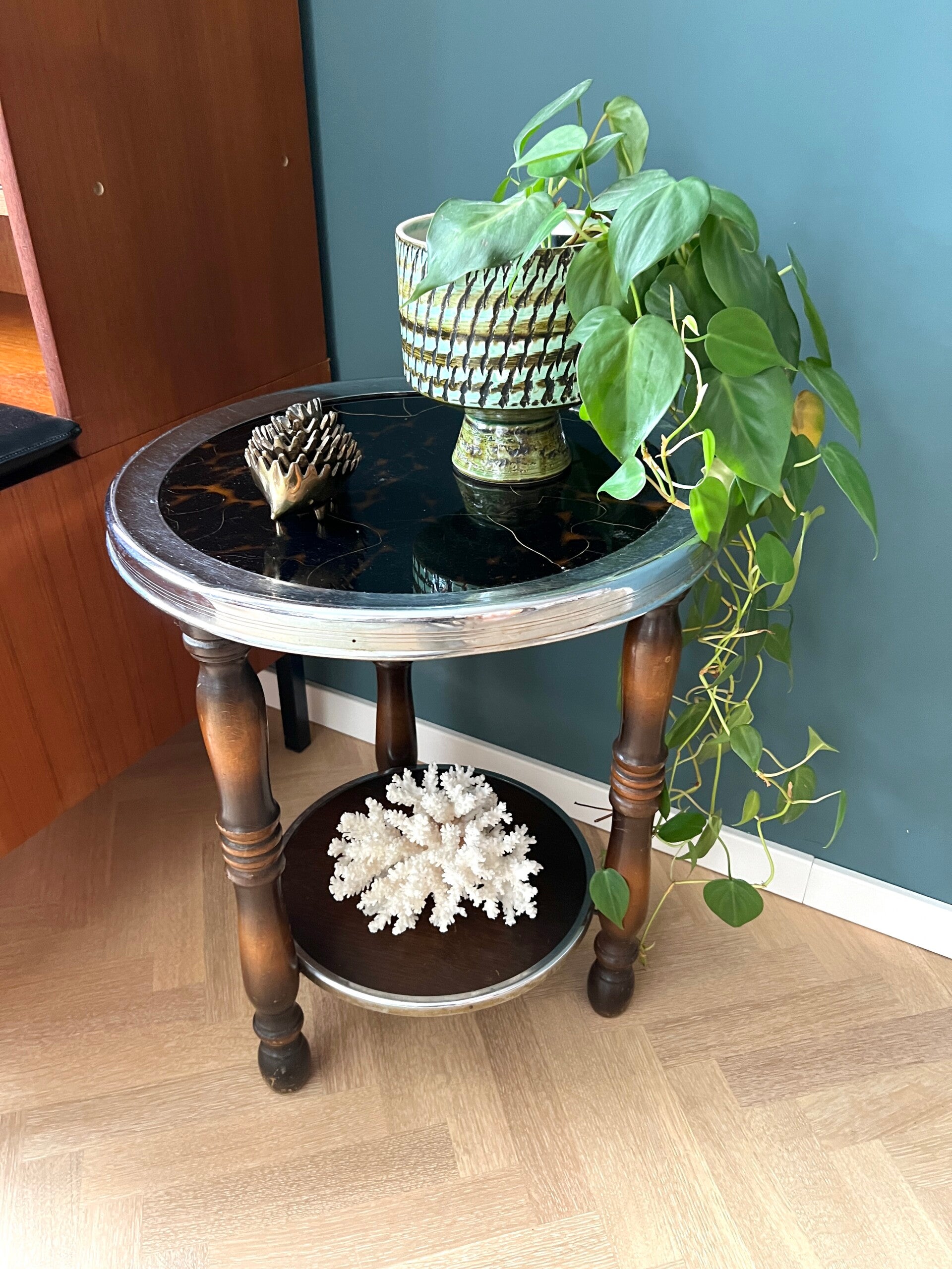 Art deco bijzettafeltje met glasplaat uit de jaren 40. Het bovenblad heeft een glasplaatje van zwart bruin glas met een craquelé achtige bewerking in onder het glas.❃H: 53cmD: 44cm❃