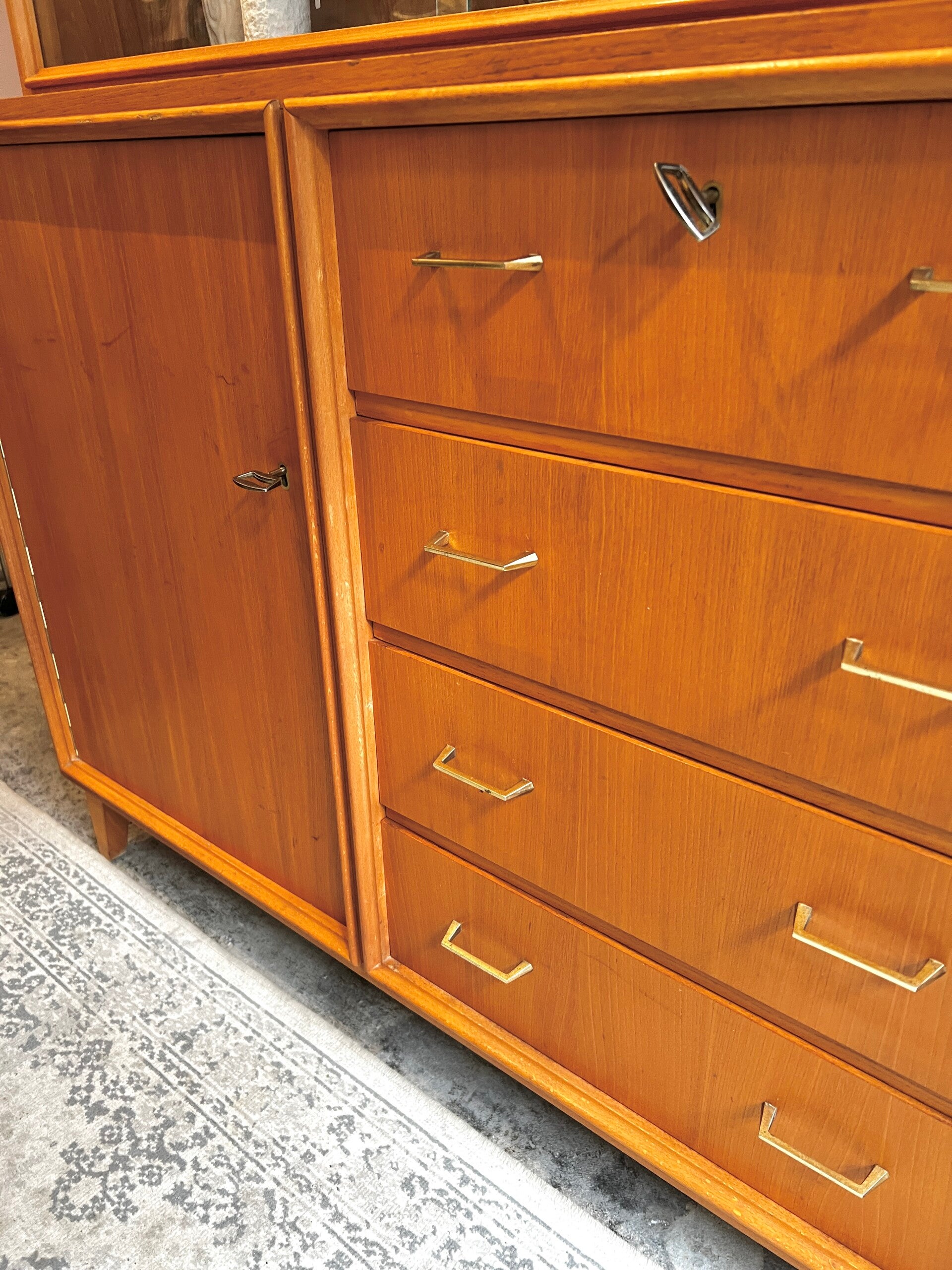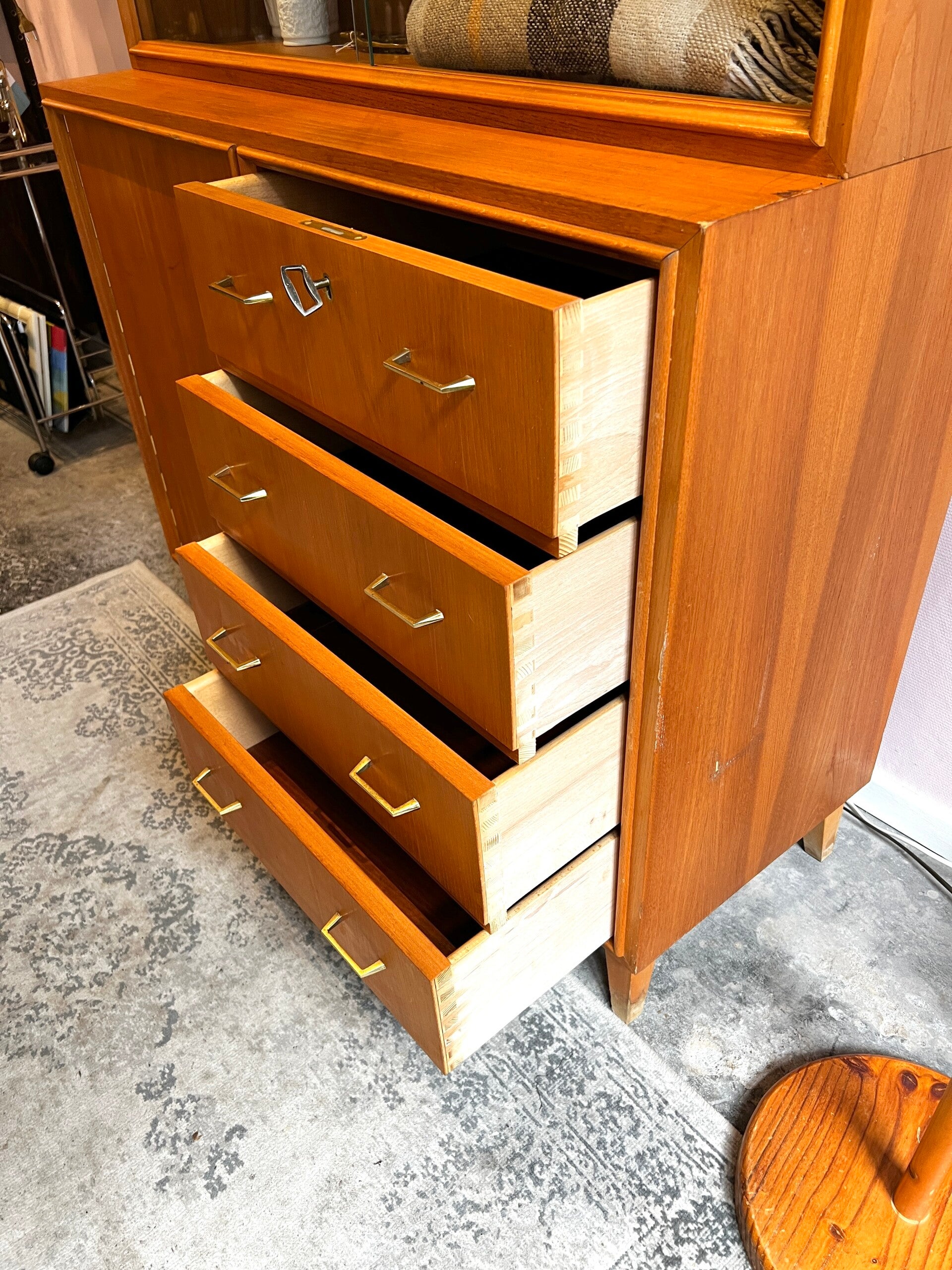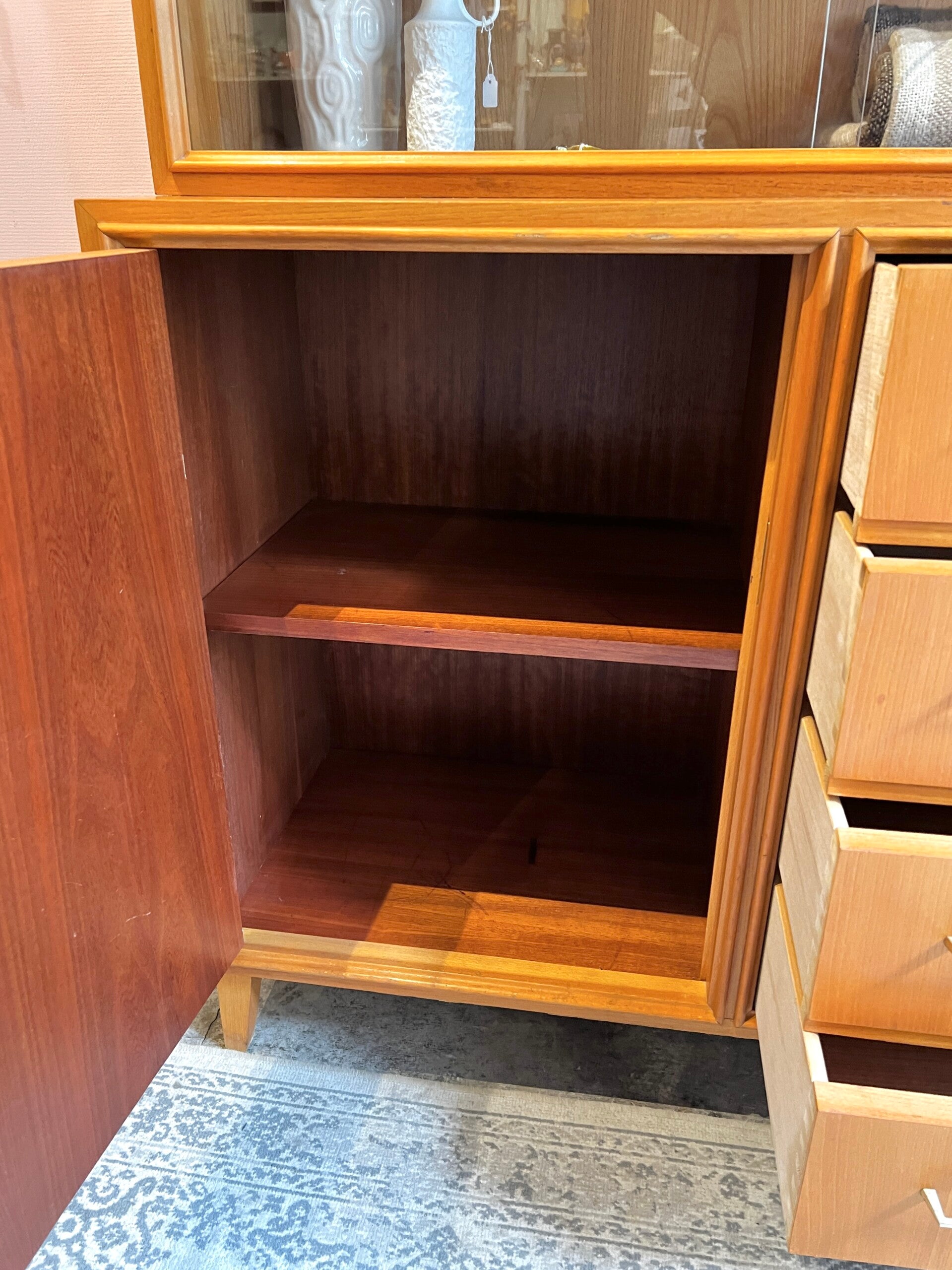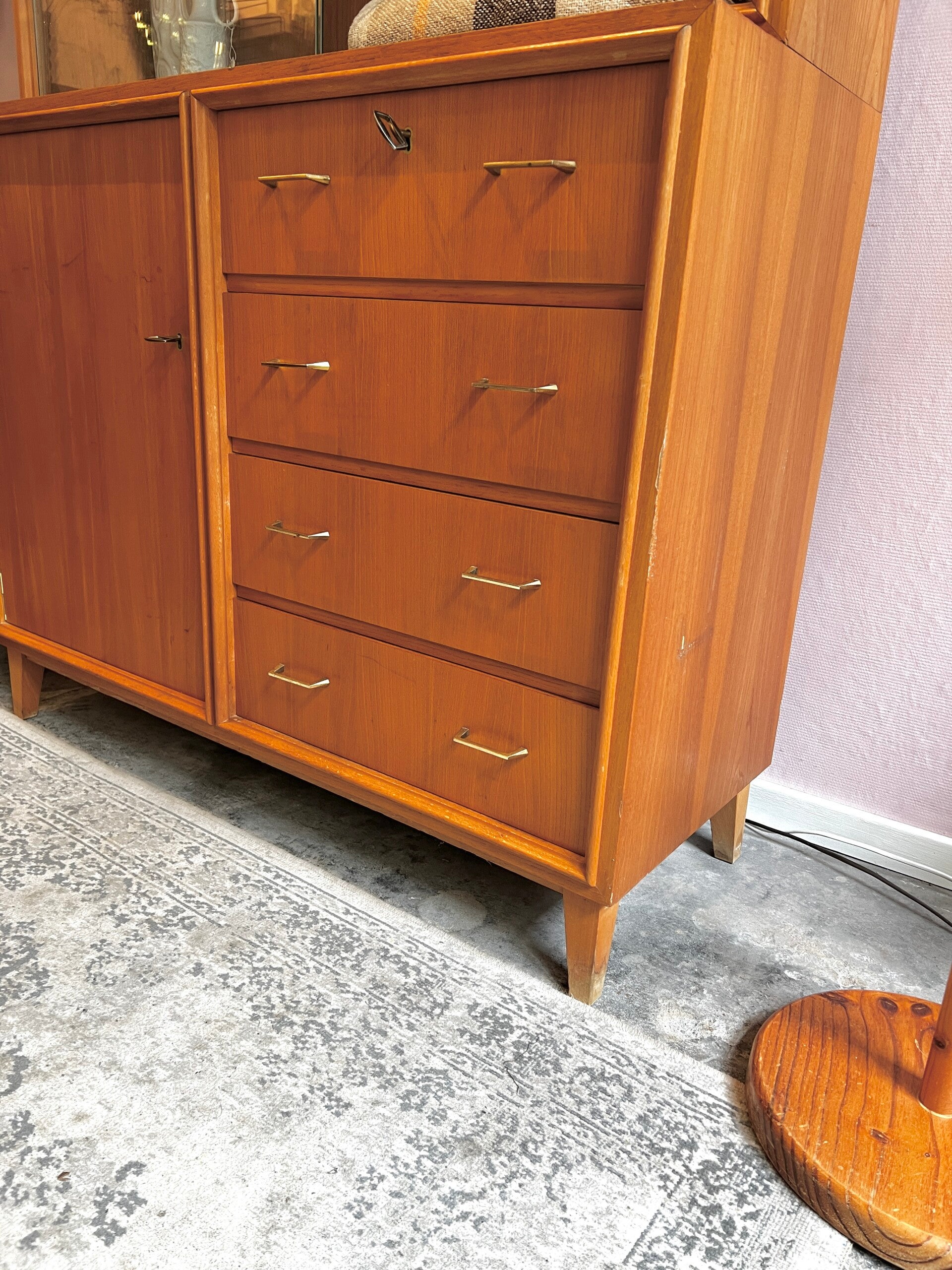 Toffe vitrinekast uit de jaren 50, voorzien van 2 glazen schuifdeuren en een legplank. In het onderste deel vier lades waarvan het bovenste afsluitbaar is met een sleutel en een deur met legplank. De kast verkeert nog in een hele mooi staat👌🏻