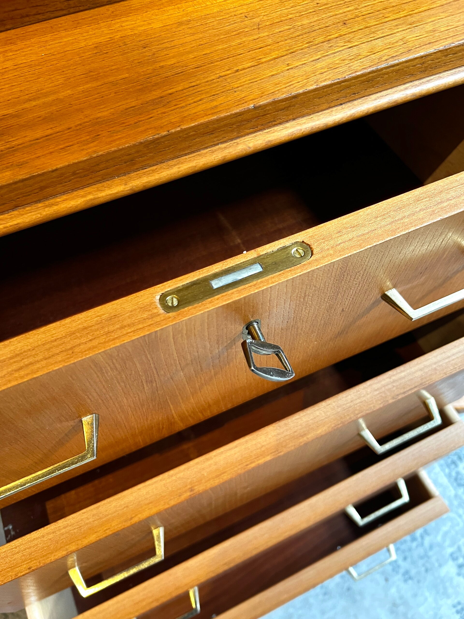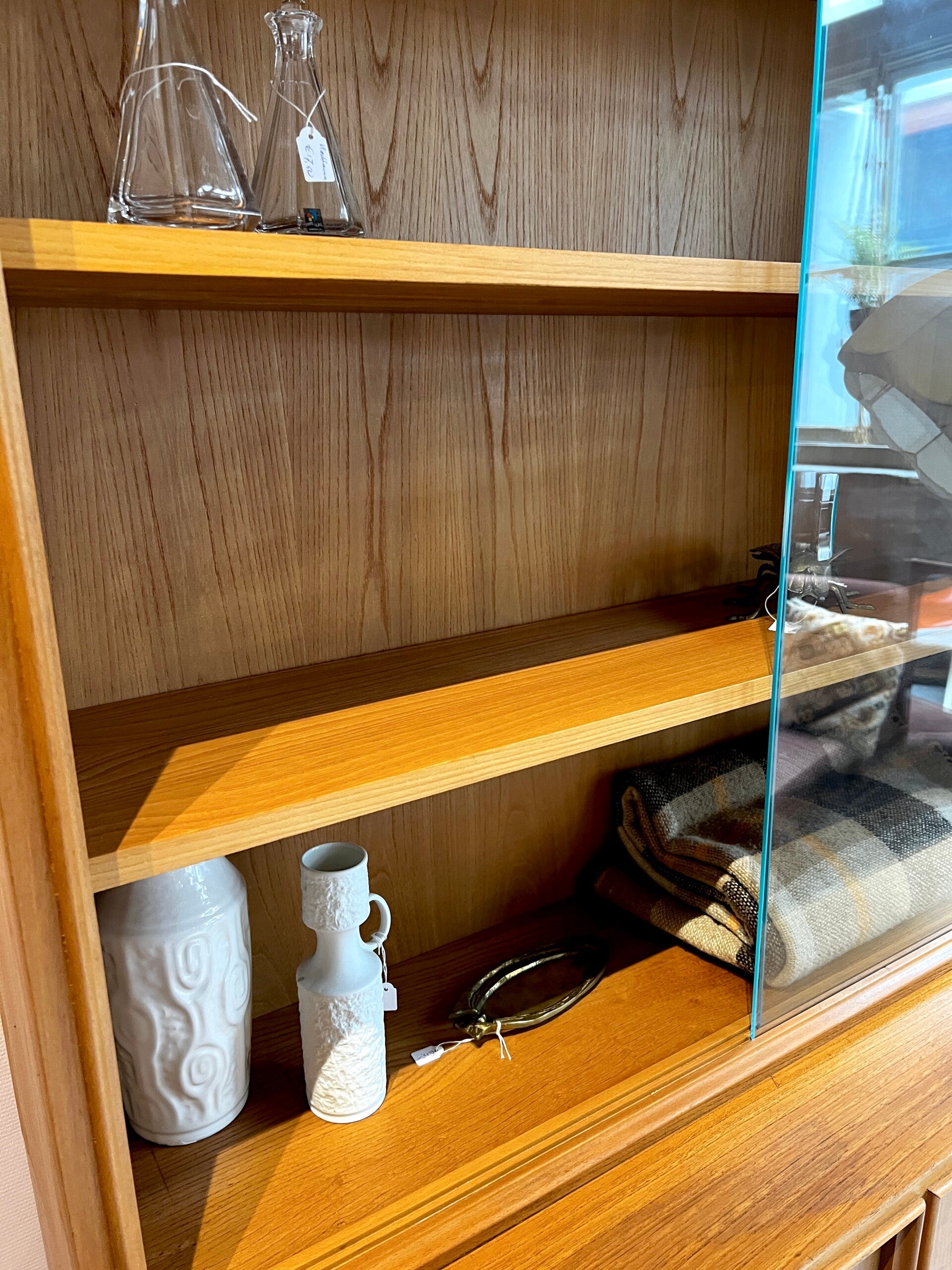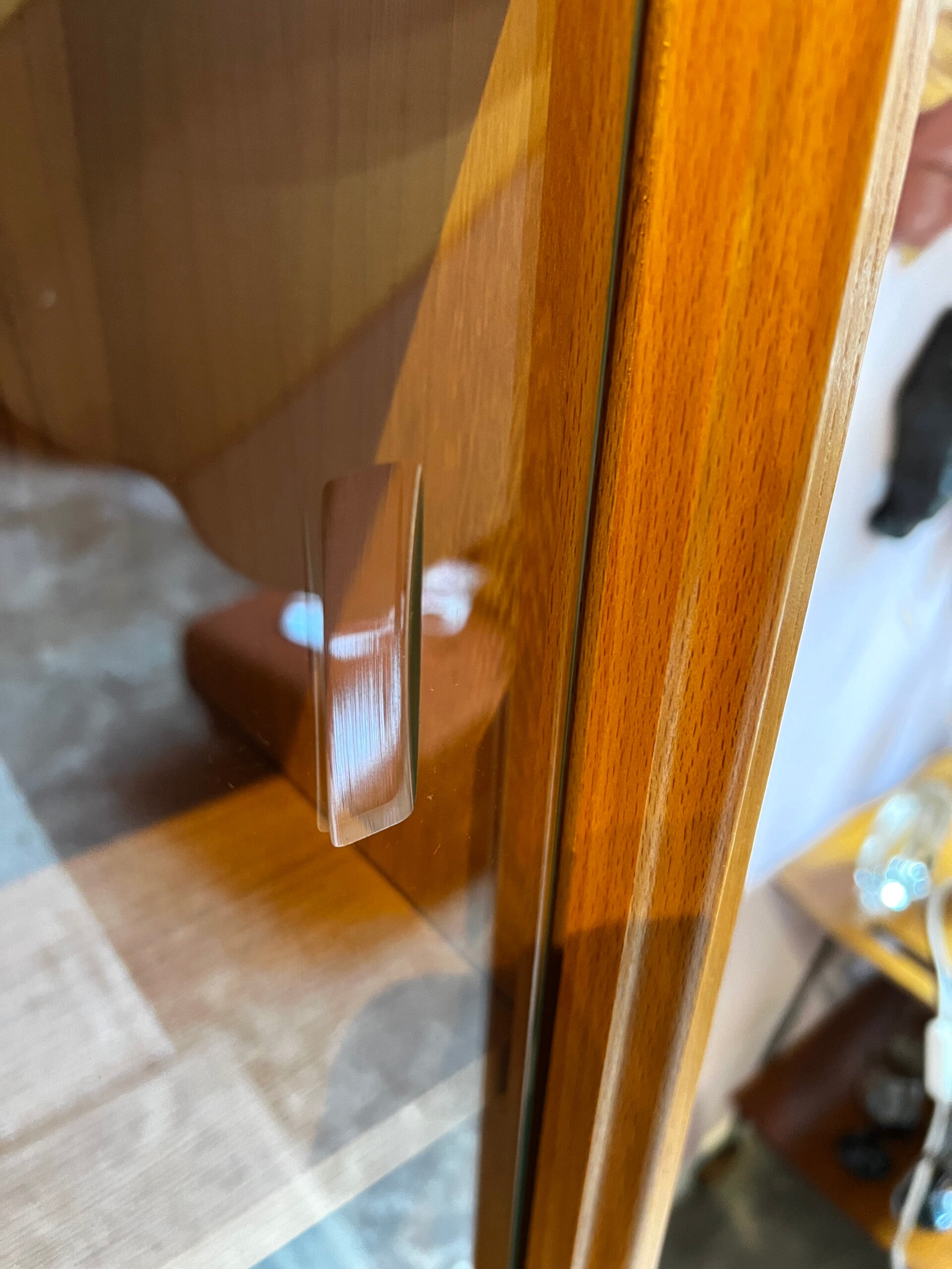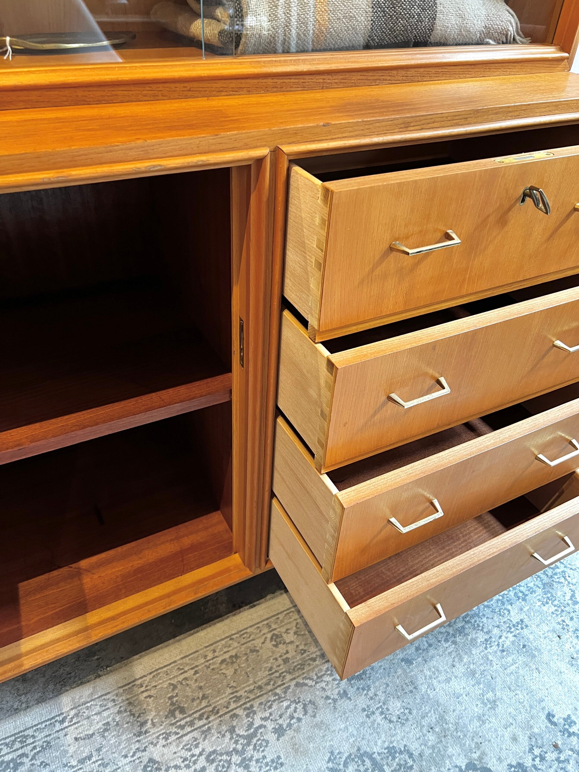 Toffe vitrinekast uit de jaren 50, voorzien van 2 glazen schuifdeuren en een legplank. In het onderste deel vier lades waarvan het bovenste afsluitbaar is met een sleutel en een deur met legplank. De kast verkeert nog in een hele mooi staat👌🏻