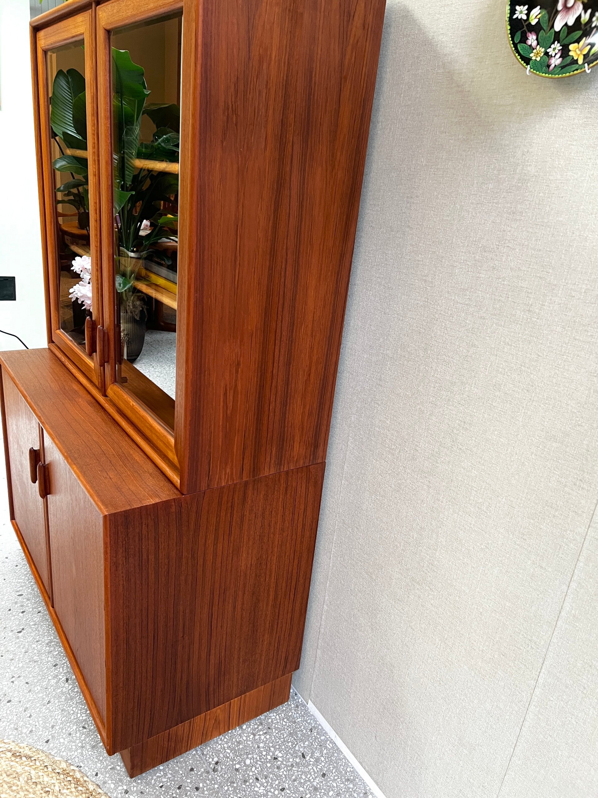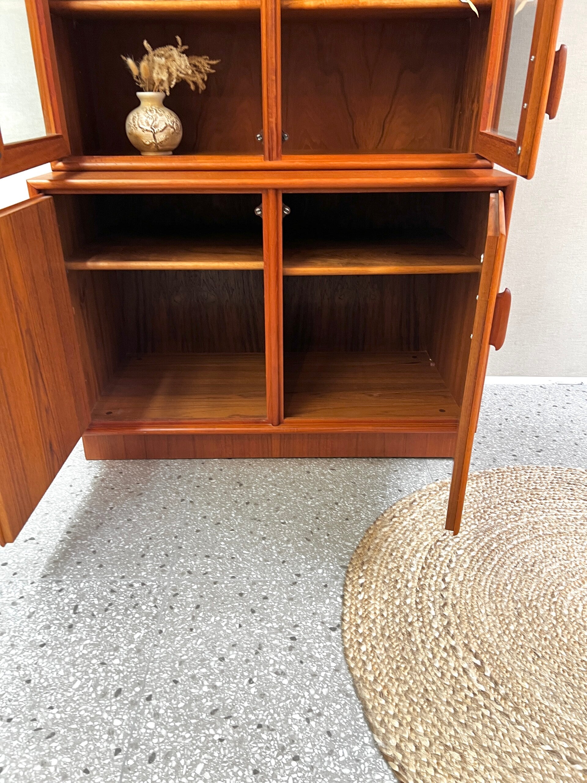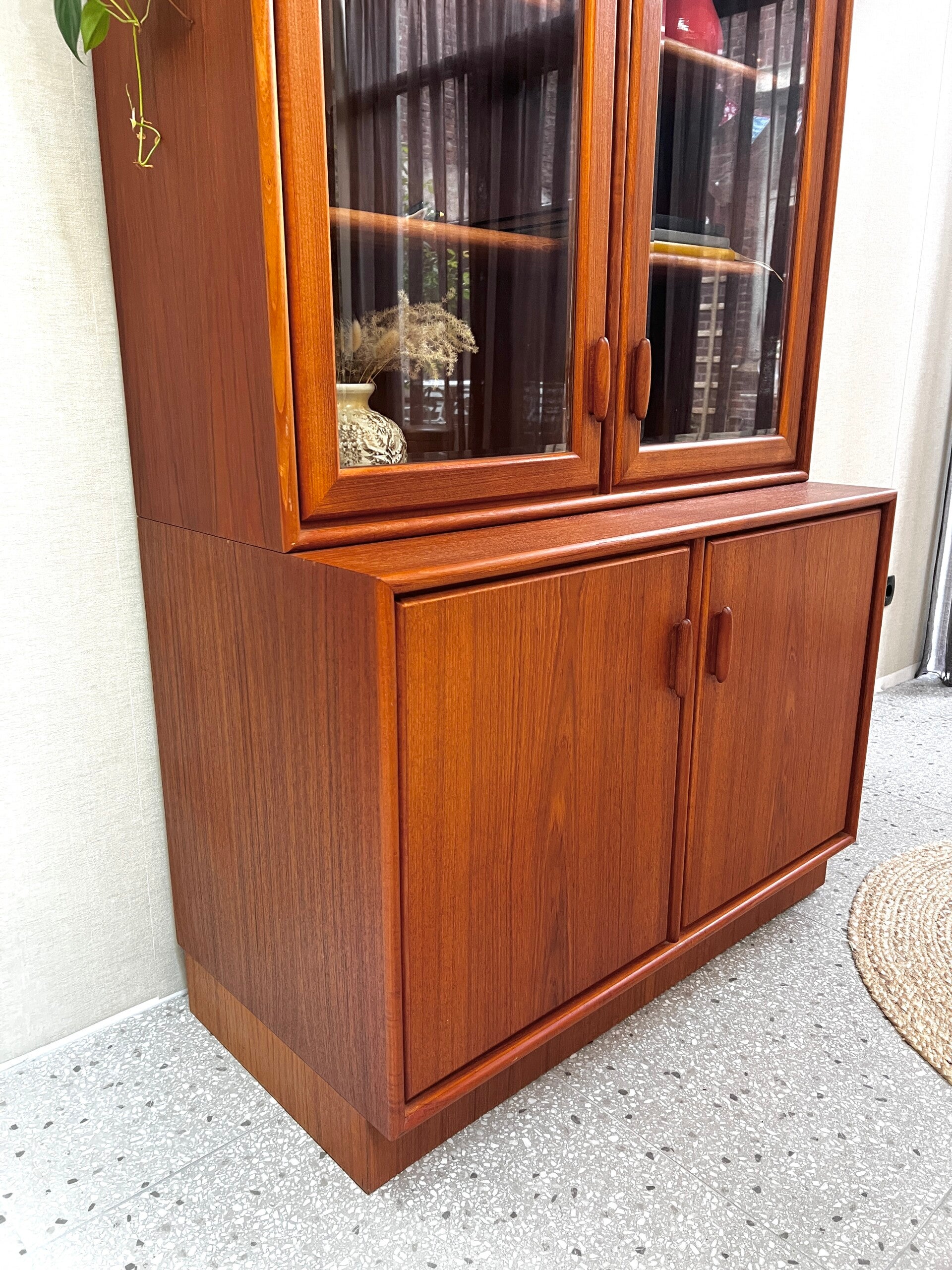 Onwijs mooie 2 delige massief teak houten buffetkast ontwerp van Heinrich Riestenpatt door RT moebel. De kast heeft voldoende opberg mogelijkheden. Vitrine gedeelte met 2 legplanken en onderkast met legplanken. De kastdeurtjes sluiten middels magneet knopjes, en heeft mooie afgeronde greepjes.