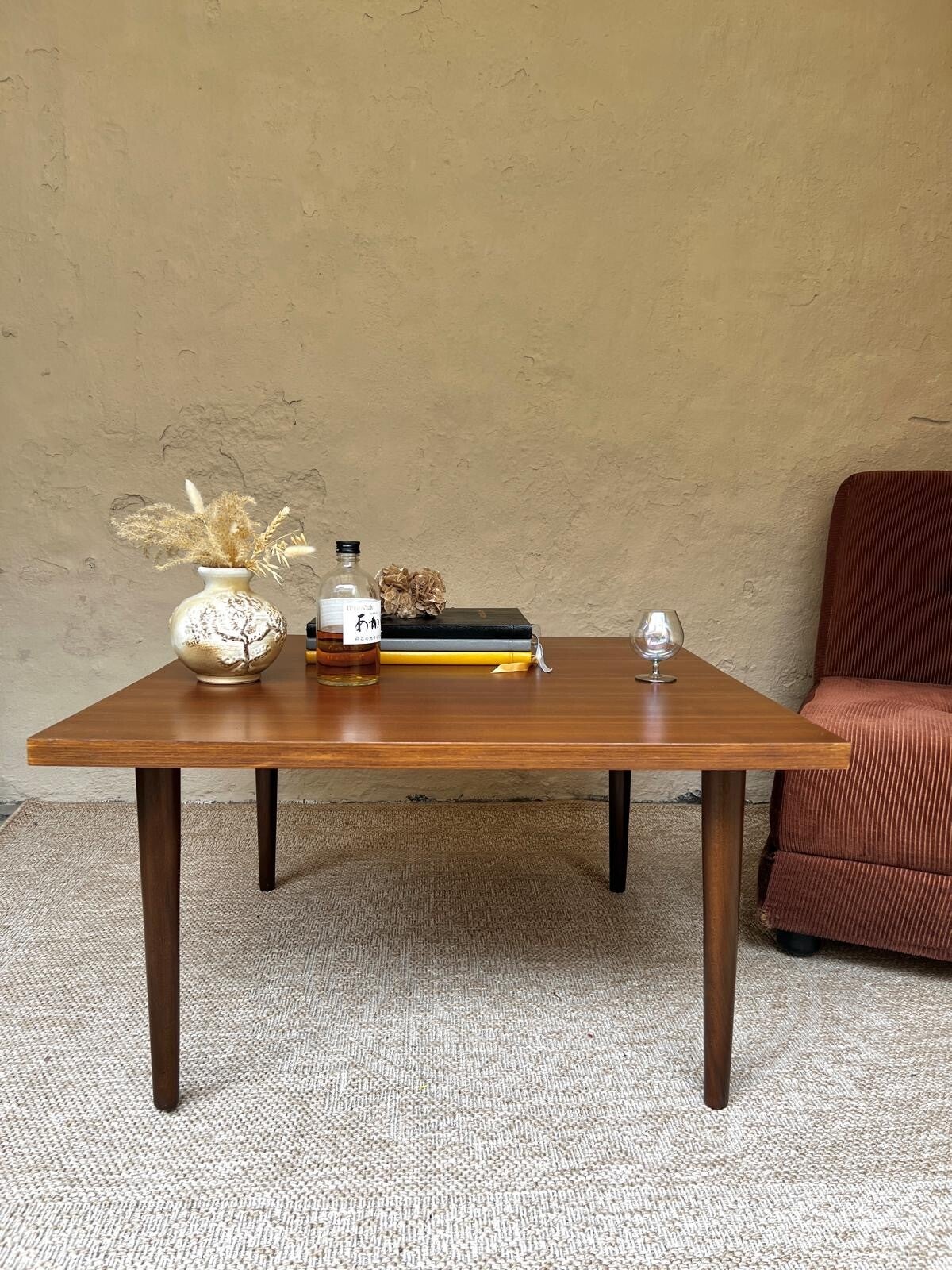 Super toffe vintage salontafel simpel maar tijdloos desing. Vierkant blad met ronde spits toelopende massief houten poten🧡