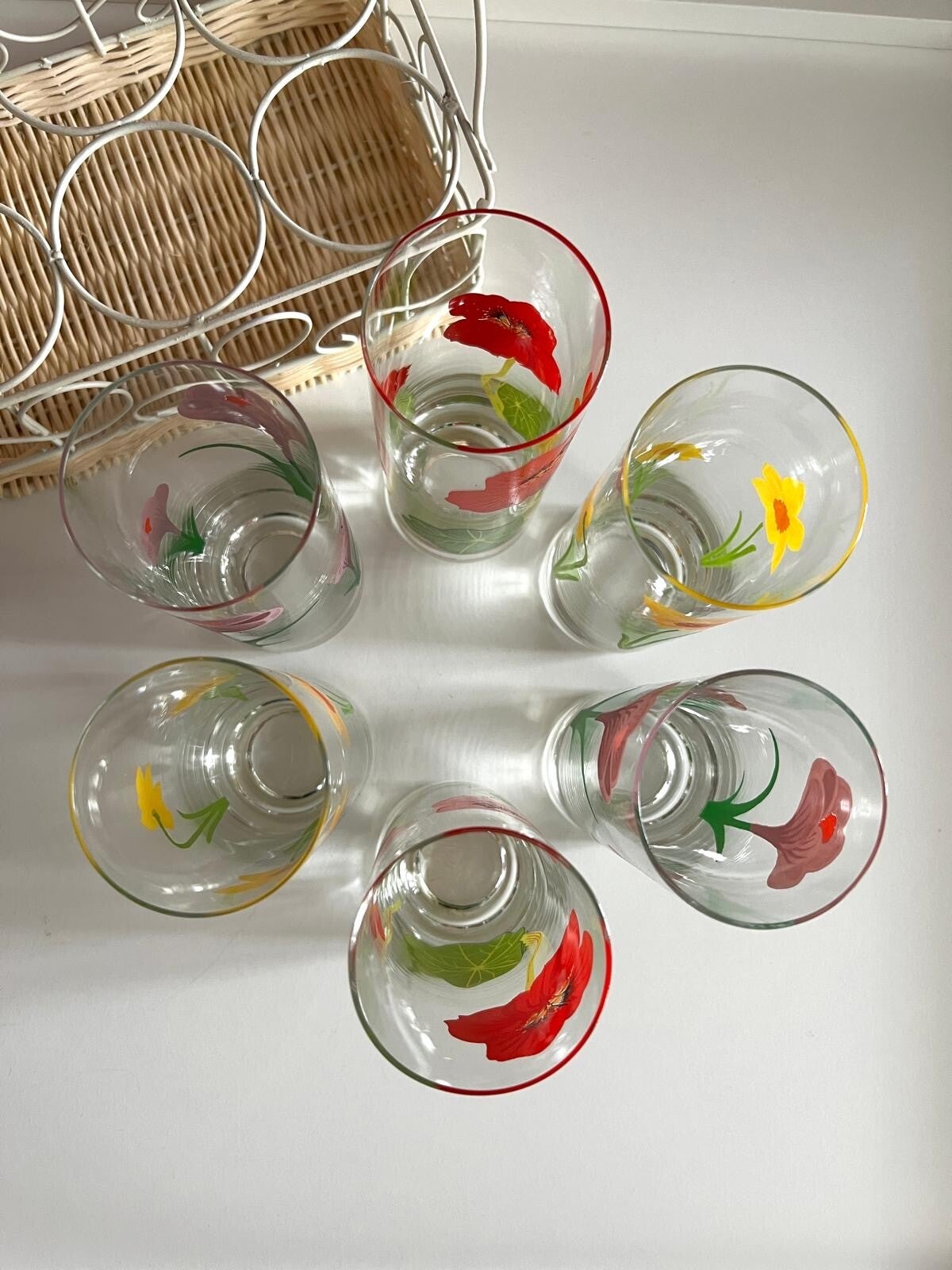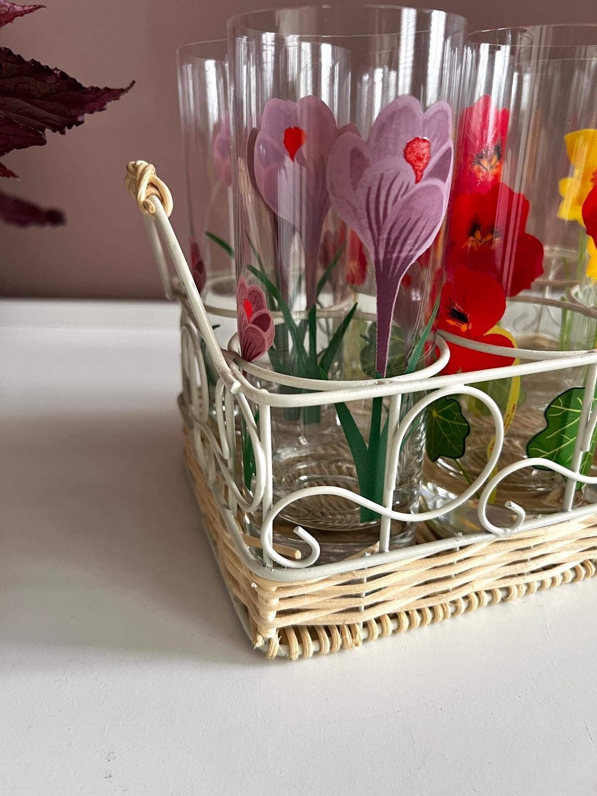 Prachtige Zomerse set Vintage Limonadeglazen in houder met afbeeldingen van Klaproos Narcis en krokus.