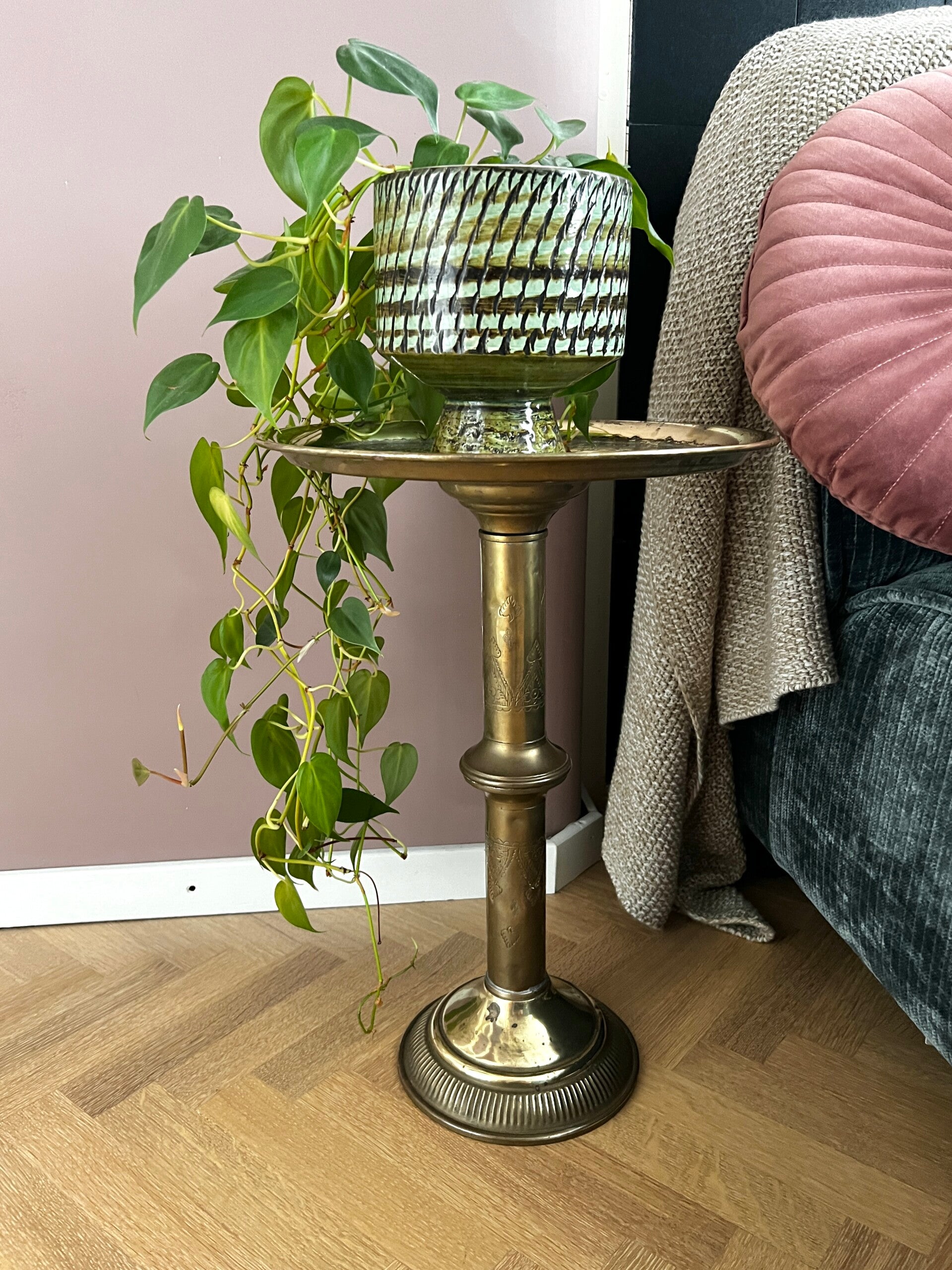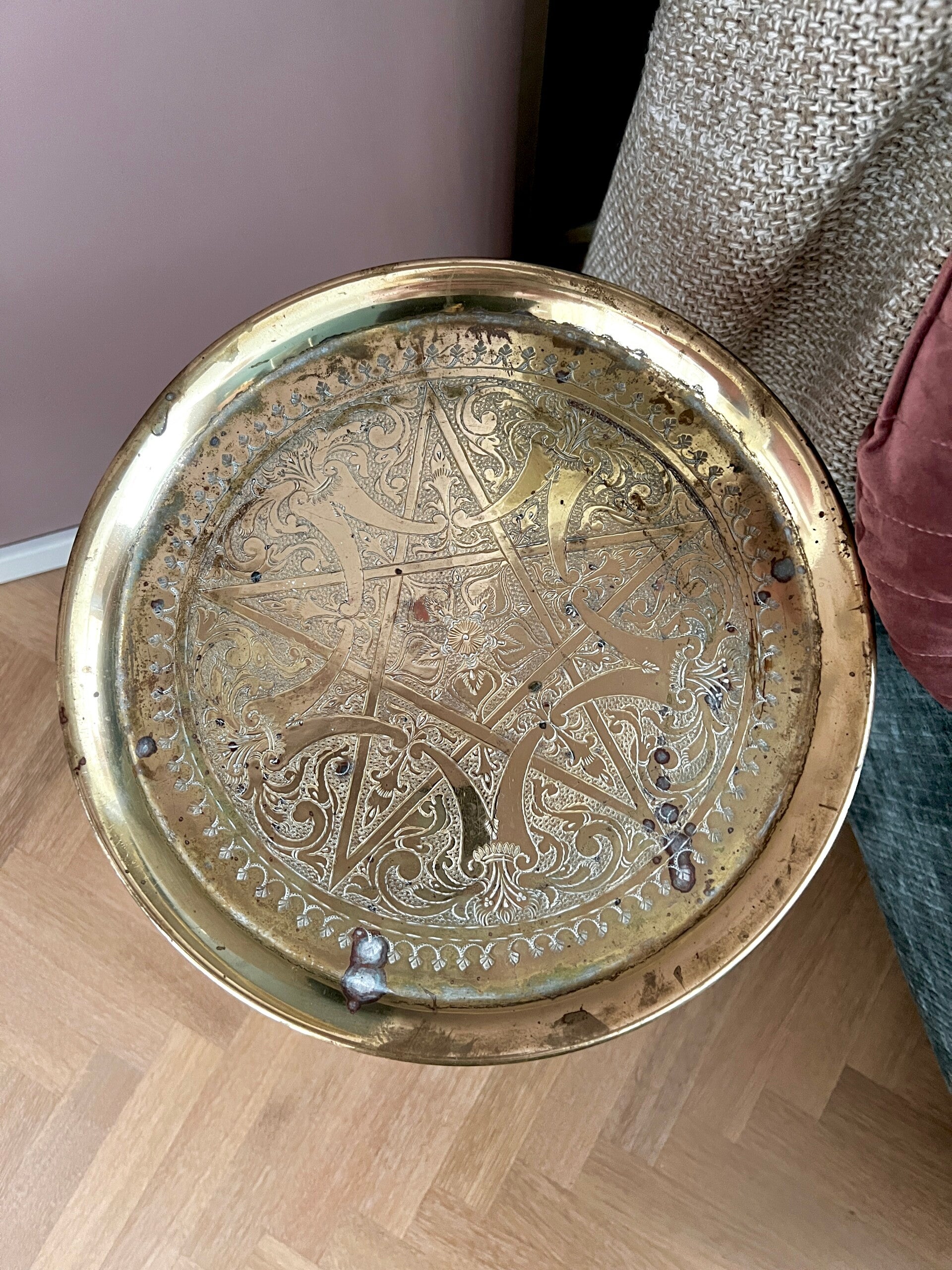 Decoratief Marokkaans bijzettafeltje van messing. Mooi met een plantje erop, ook handig als tafeltje voor een kopje koffie.