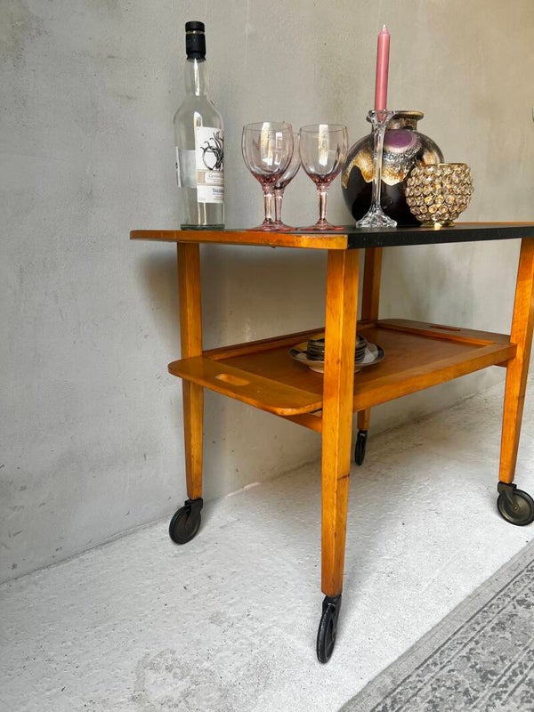 Toffe barcart van het merk Bauhaus uit de jaren 60. De barcart heeft aan de onderkant een afneembaar dienblad, welke je er eenvoudig op en af kan schuiven. De piano wieltjes en het zwarte bovenblad maken deze serveerwagen een echte eyecatcher🧡