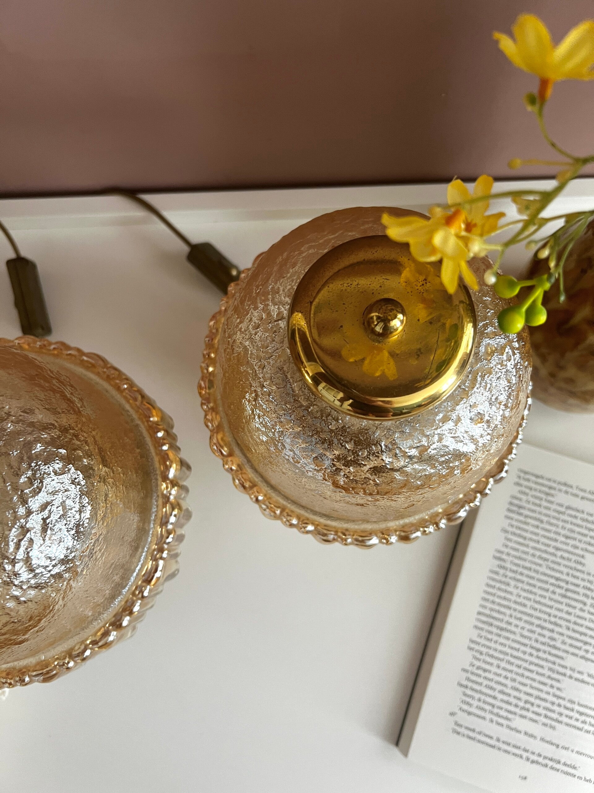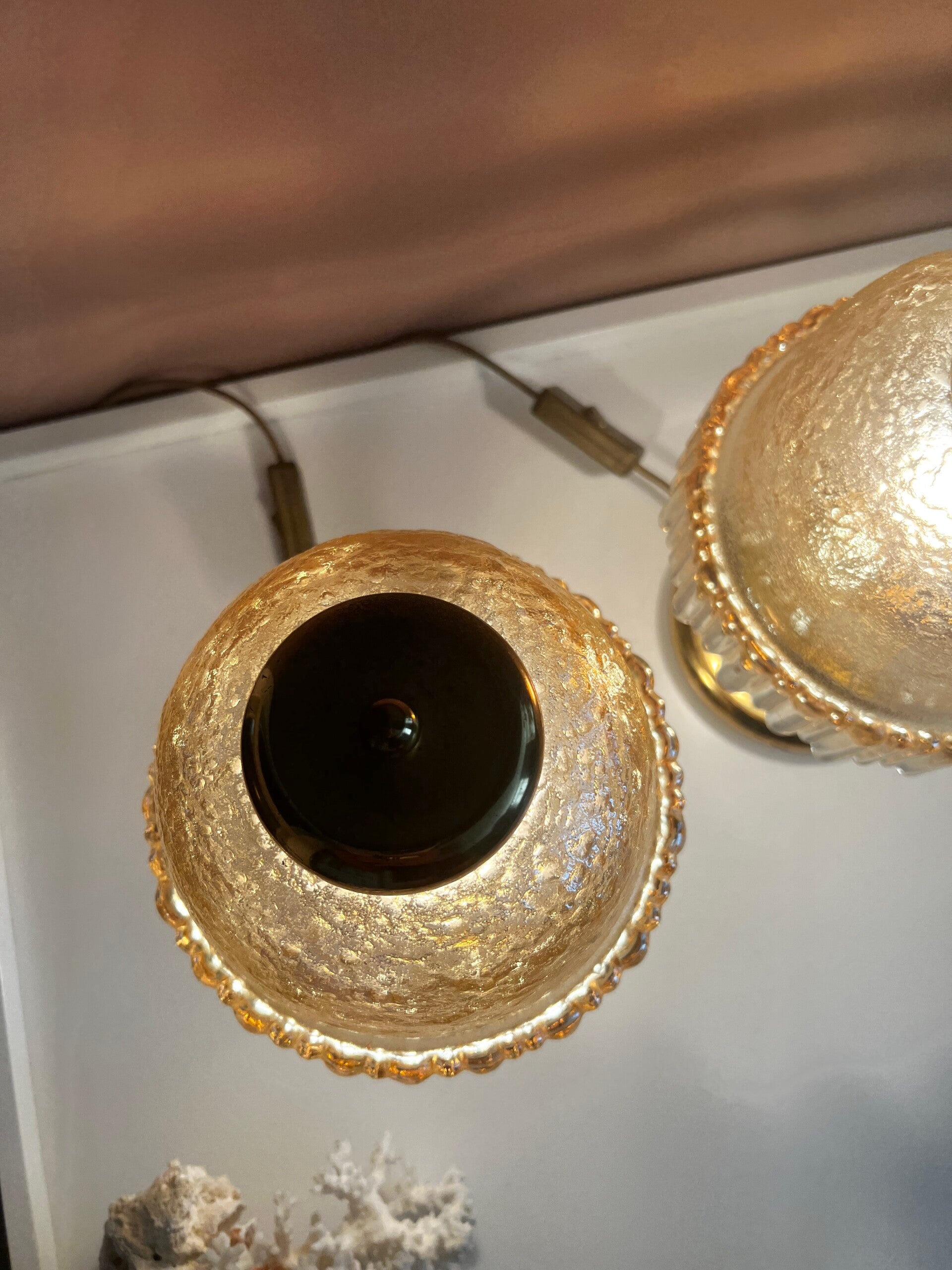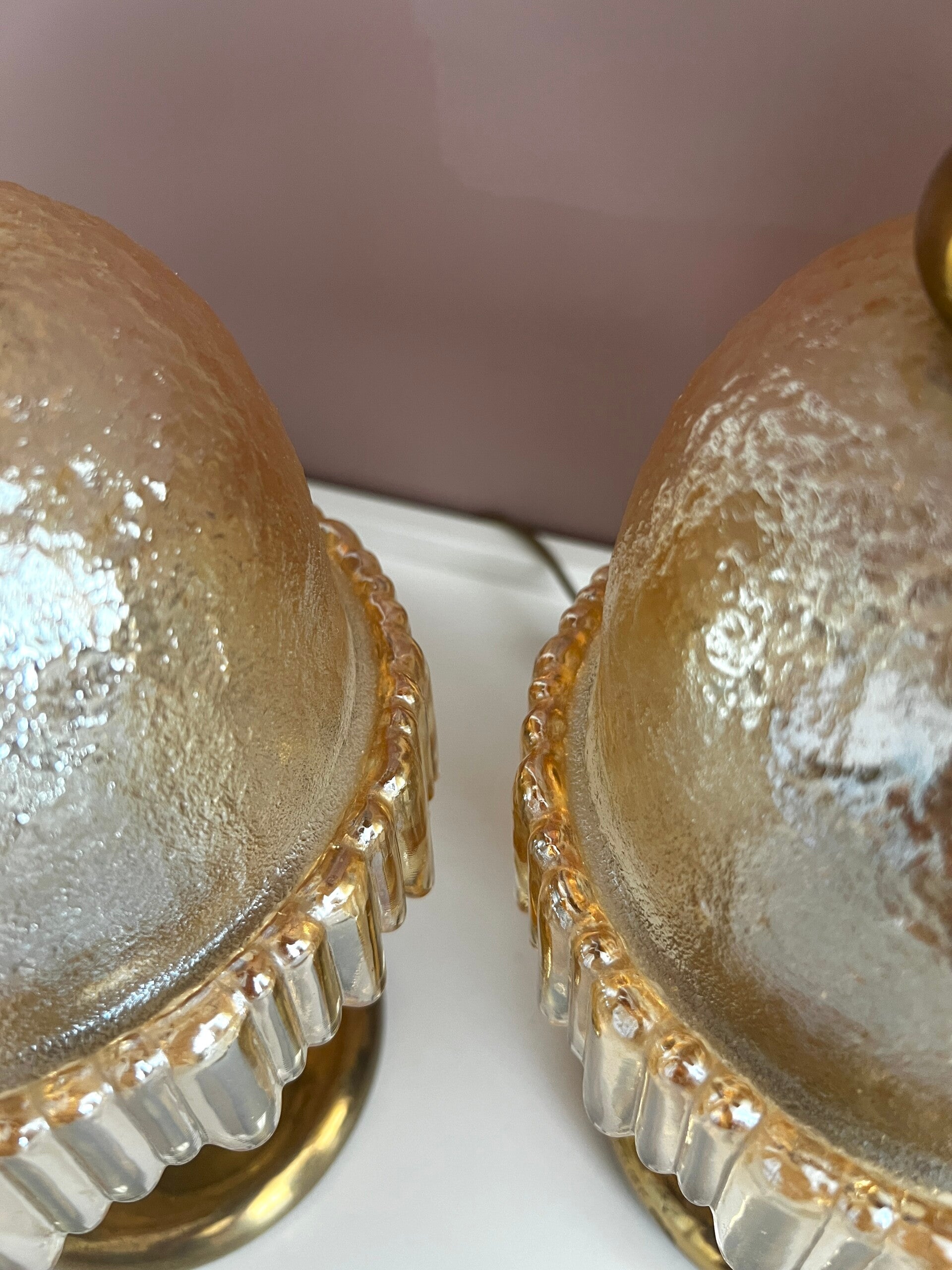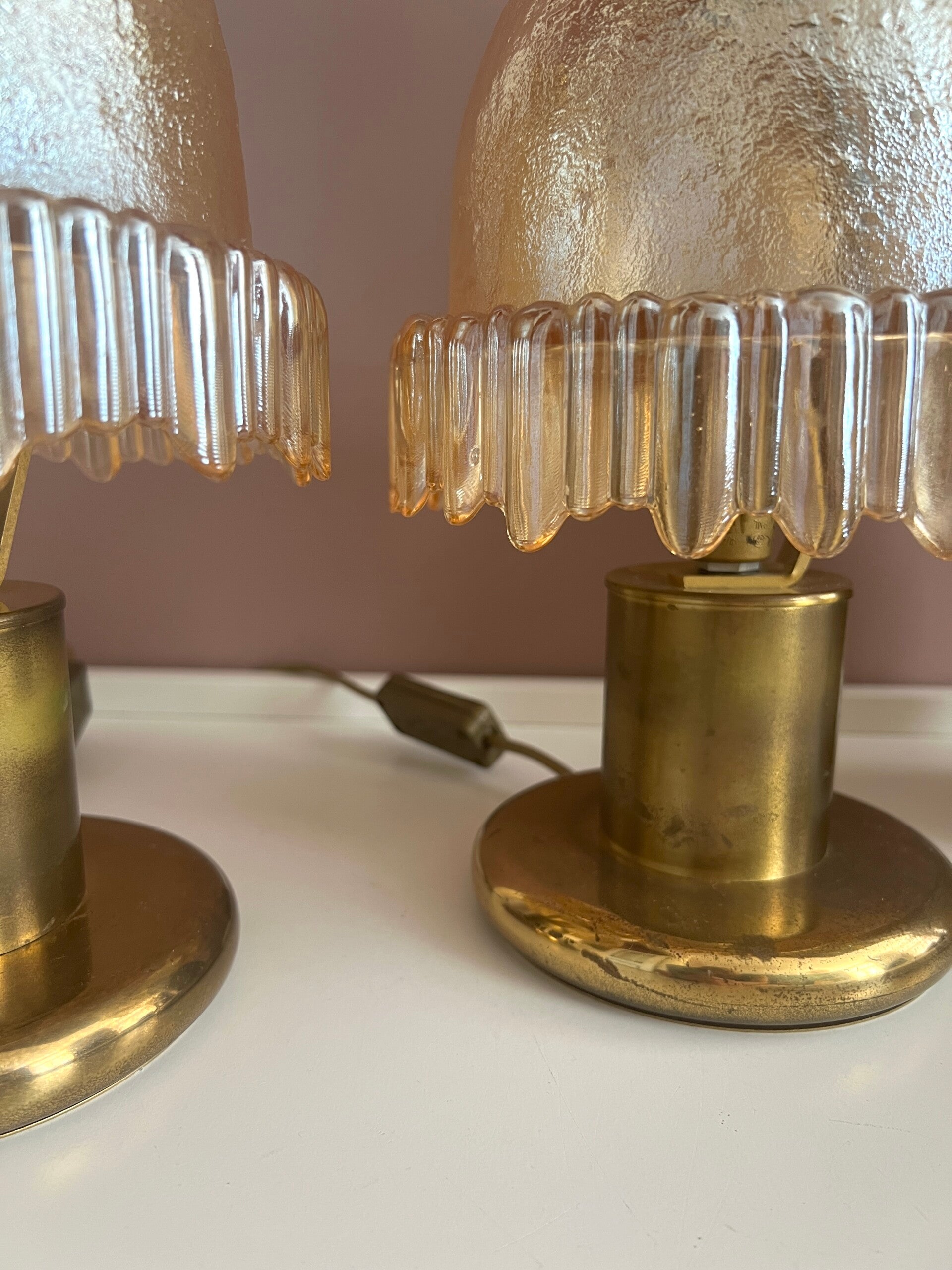 Twee amber kleurige Murano tafellampjes/nachtlampjes. De lampen hebben een messing voet en een prachtige glazen kap van zware kwaliteit. De lampjes functioneren naar behoren✨