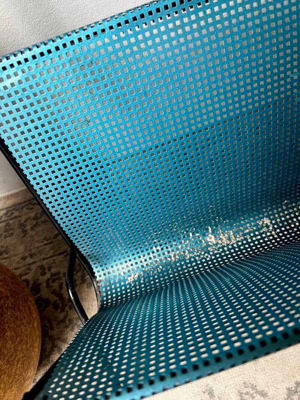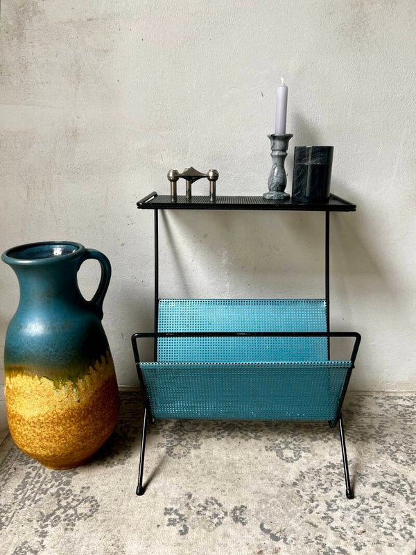 Vintage Pilastro tijdschriftenrek/bijzettafelBlauw en zwart gelakt geperforeerd metaal, afkomstig uit de jaren vijftigGebruikssporen passend bij de leeftijd!