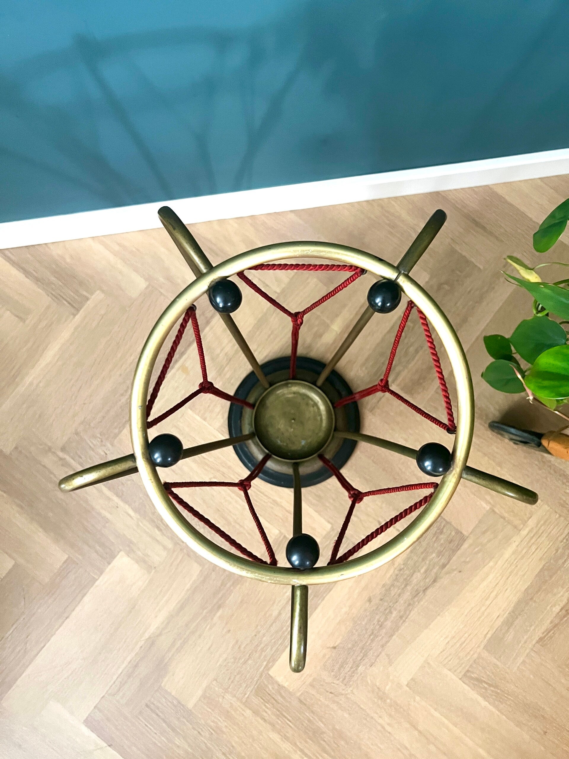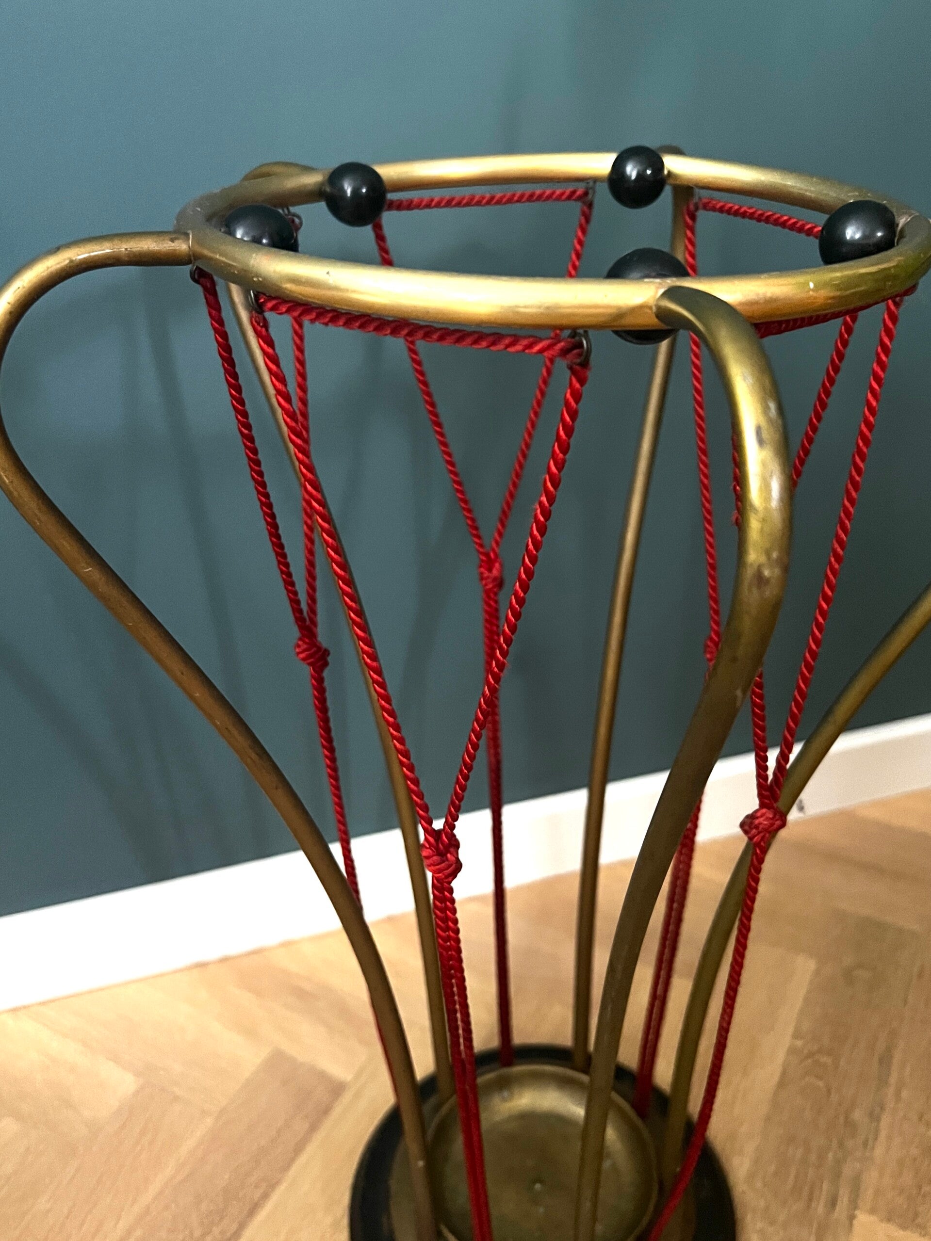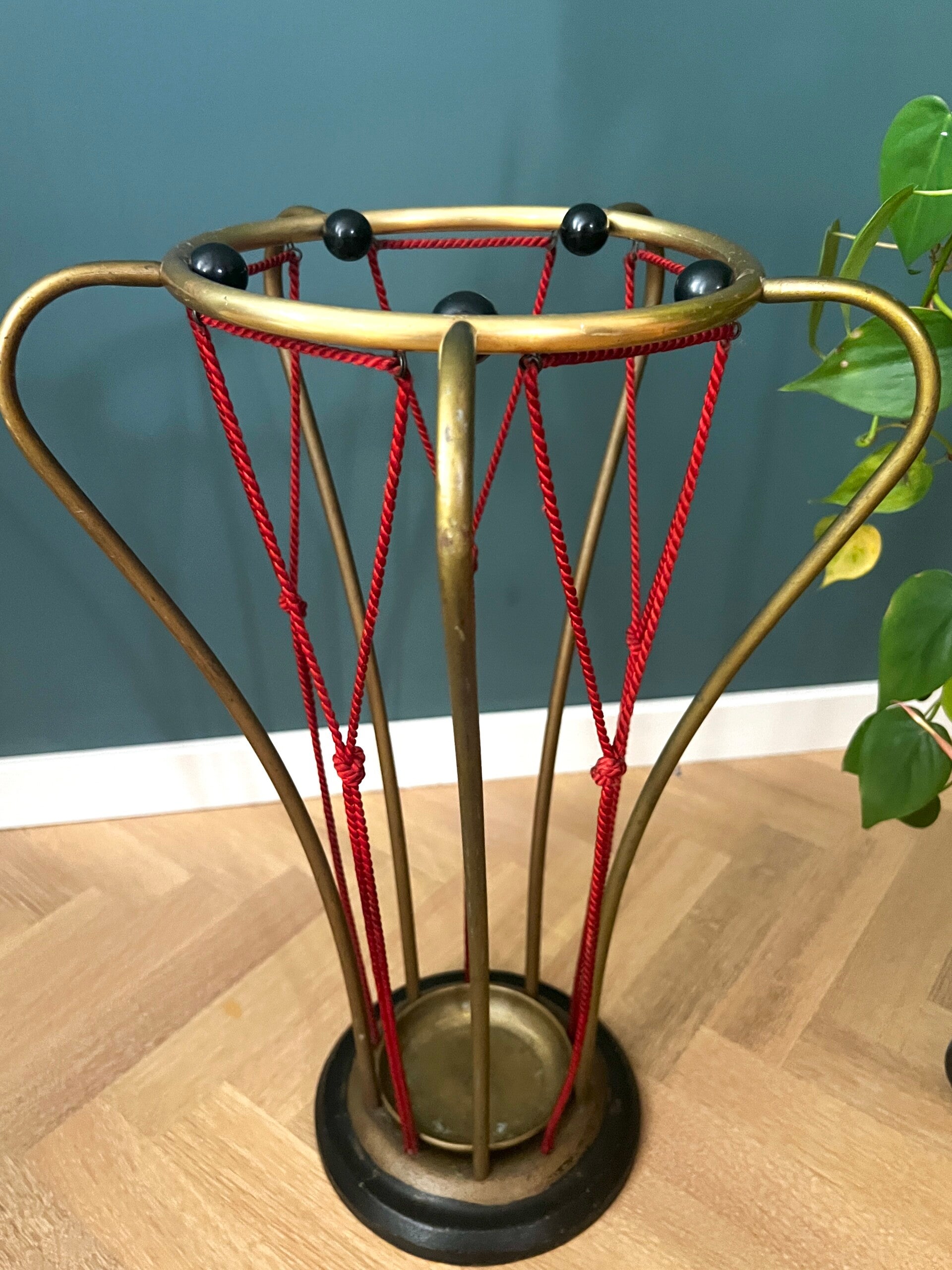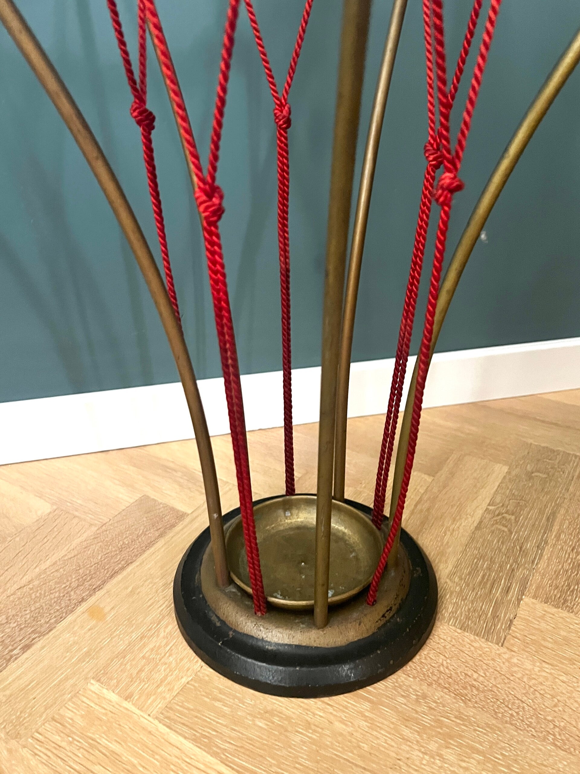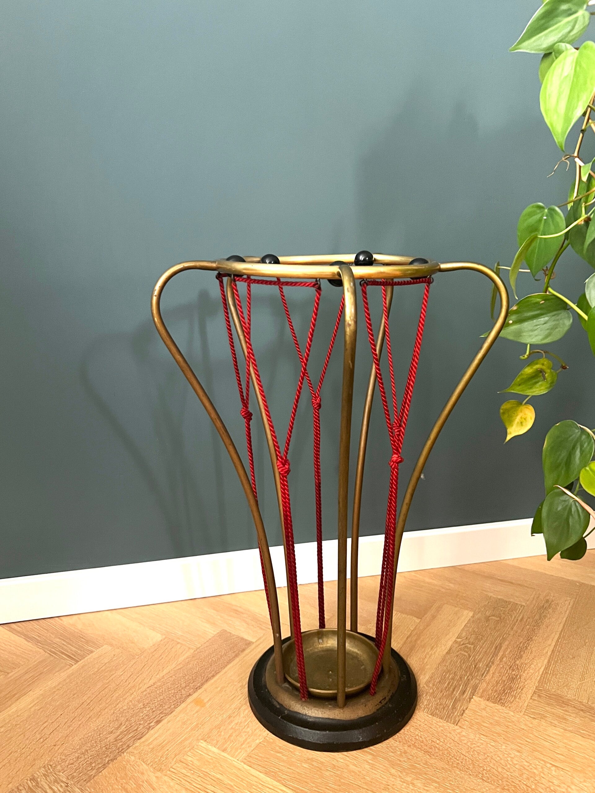 Hoe gaaf is deze paraplubak afkomstig uit de jaren 50/60 Een echte aanwinst voor in je hal, het is een zwaar model met gietijzeren voet, rode touwtjes en een messing frame ෆ