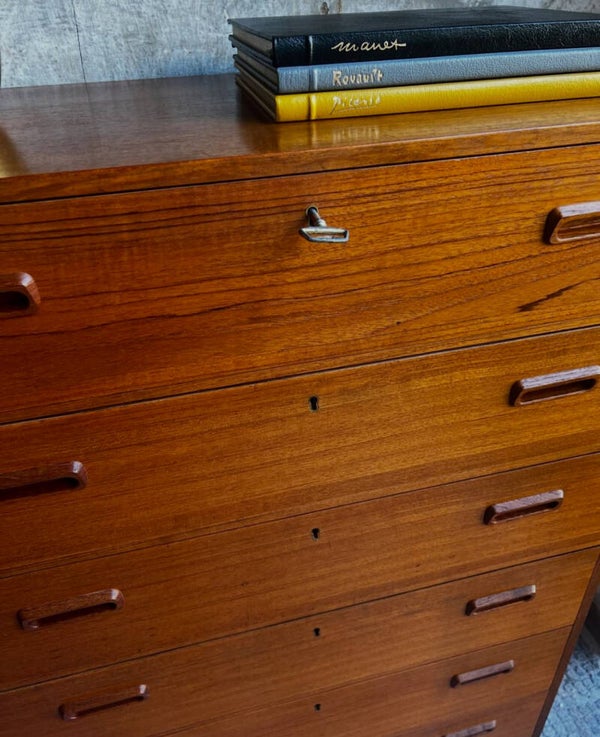 Deze mooie minimalistische ladekast komt helemaal uit Denemarken. Materiaal: teak hout. Periode: jaren 50. Zeer mooi exemplaar door zijn strakke lijnen en prachtige houttekening. De kast is voorzien van 6 afsluitbare lades, bijzonder mooi detail zijn de handgrepen. Gezien de leeftijd nog in goede vintage staat. Prachtig in de woonkamer om je spullen in op te bergen. Uiteraard ook gewoon leuk voor tegen de wand met een vaas of kandelaar. Opgeruimd staat netjes met deze Deense beauty!