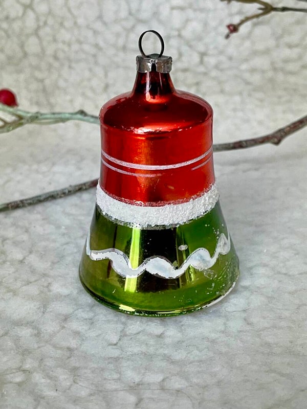 Oude Vormbal Klokje Groen Rood met klepel 7.5cm Hoog 5cm Dia