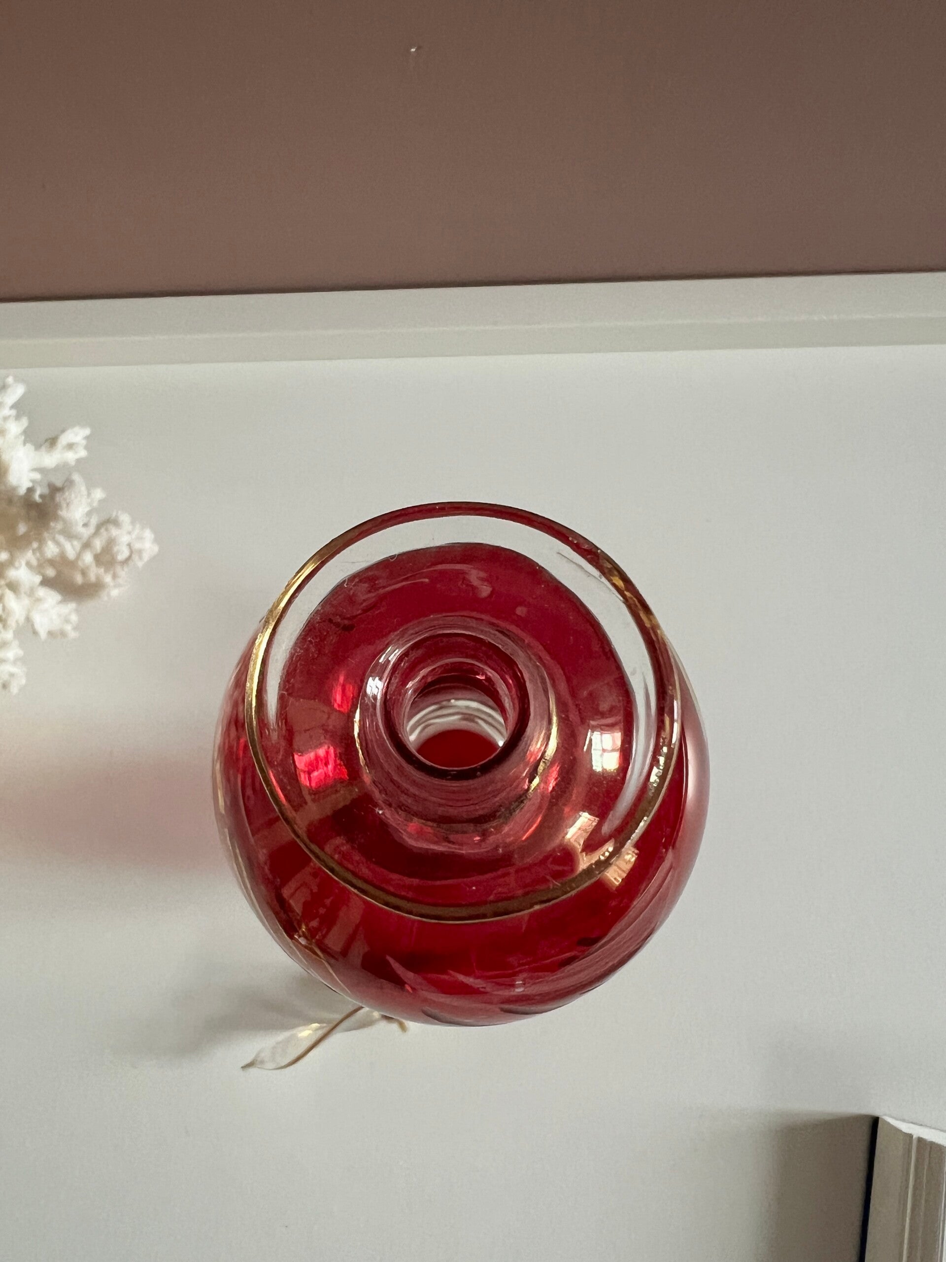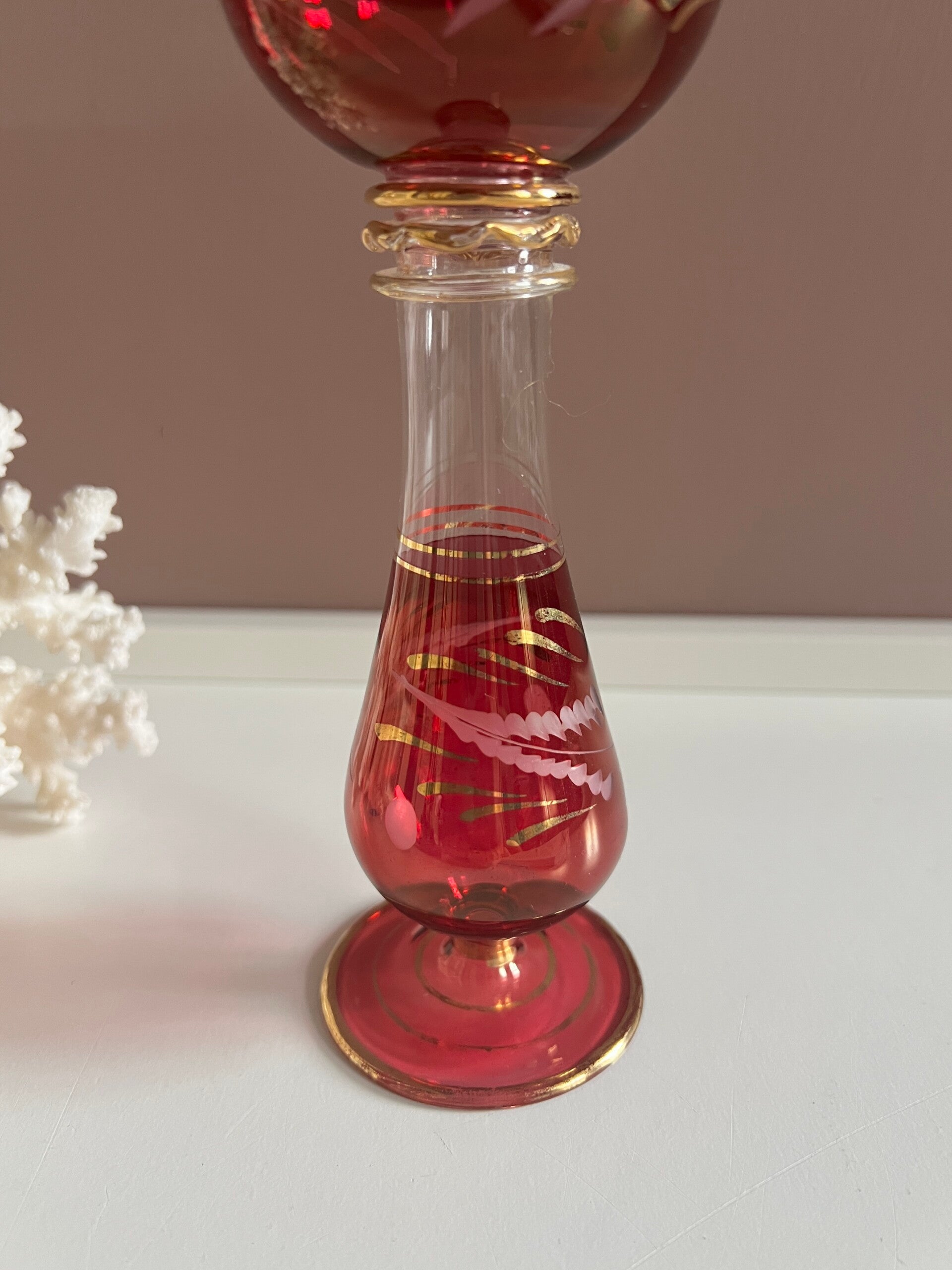 Heel mooi mondgeblazen dun gekleurd glas met gouden accenten.