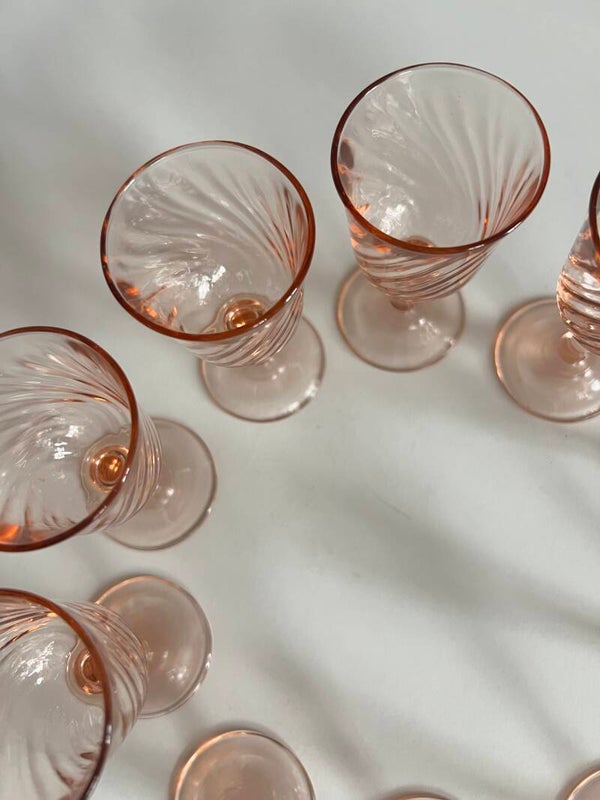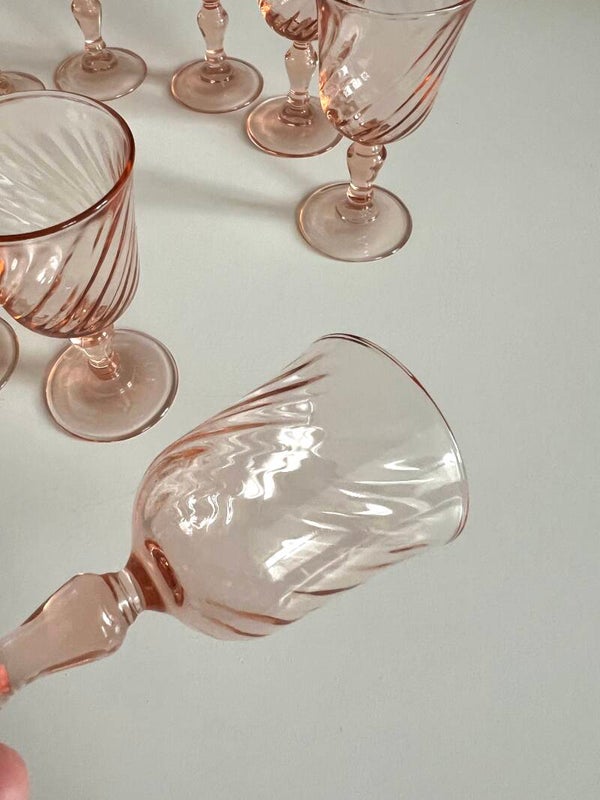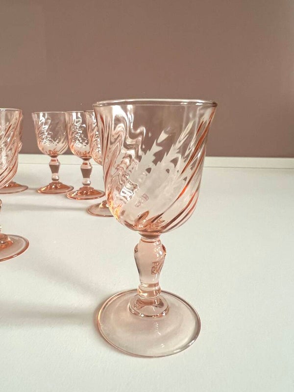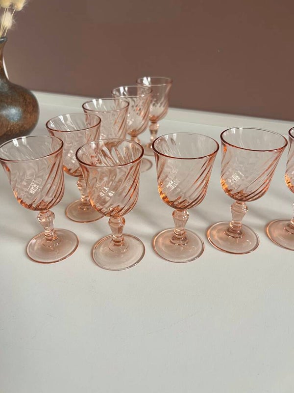 Mooie Franse Arcoroc Rosaline borrelglazen. Prachtige glazen in een mooie roze kleur💗 Deze glazen zijn uit de Rosaline collectie. Afkomstig uit de jaren 70/80. Prachtige set van 10 glaasjes met een swirl afwerking.