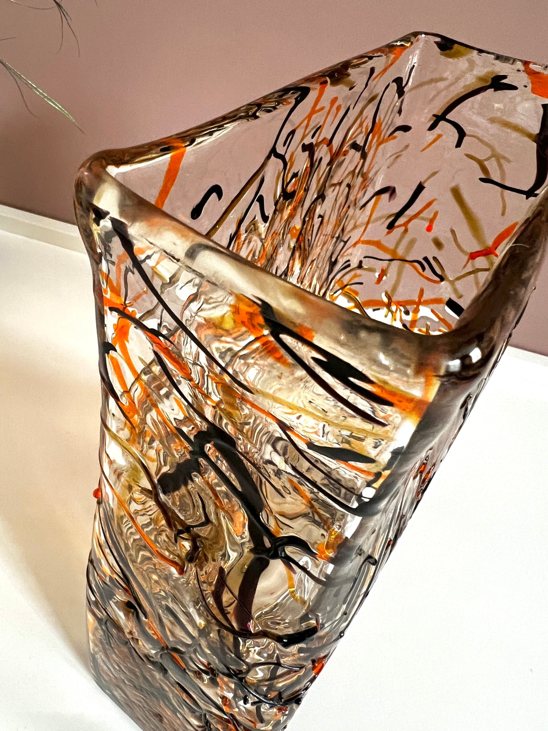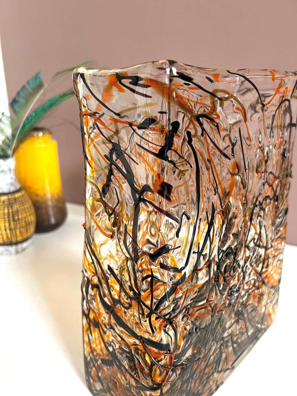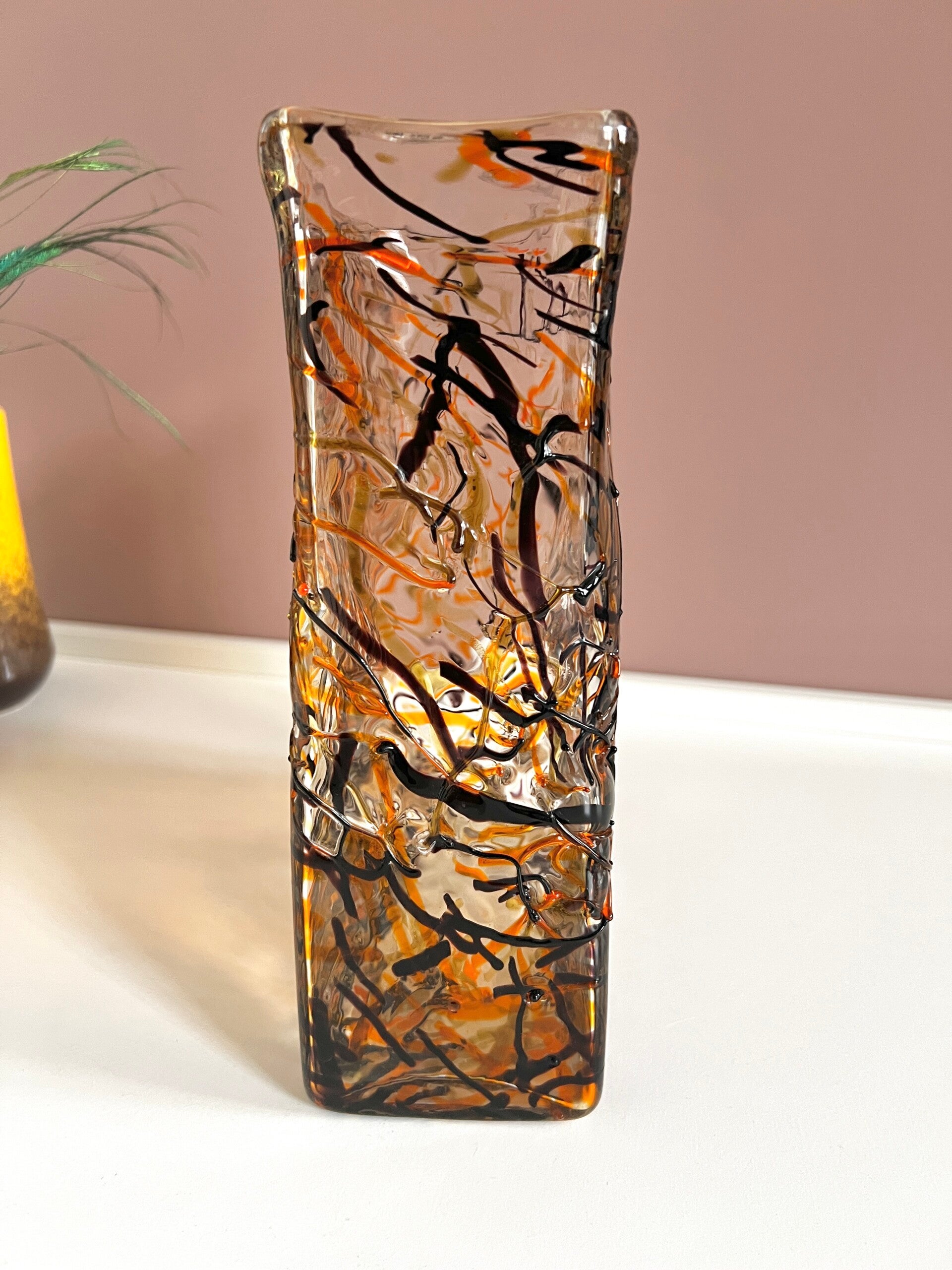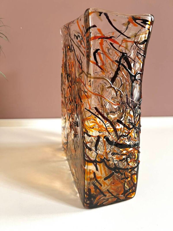 Onwijs mooie rechthoekige designer vaas. Prachtig ontwerp met handmatig bewerkte kleuren erop. De vaas heeft heel dik glas, en verkeerd nog in een super goede staat. Leuk voor jezelf of om iemand cadeau te doen.