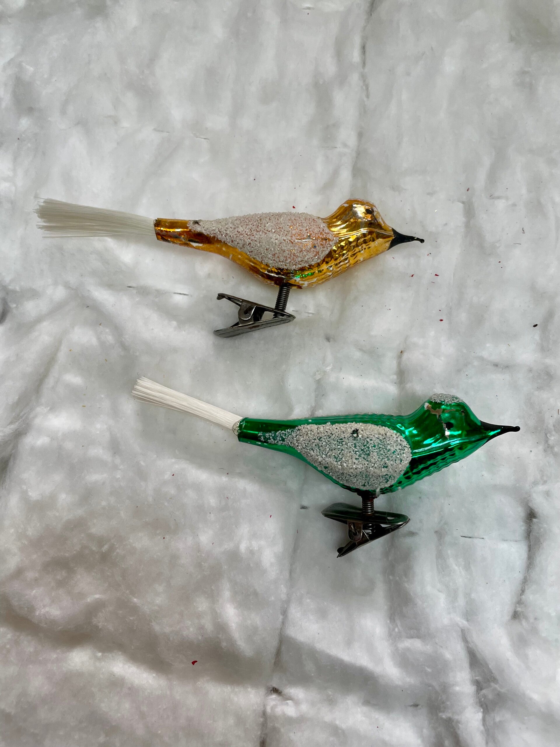 Oude Kerst Vogel op Knijper Geel of Groen L: 12cm