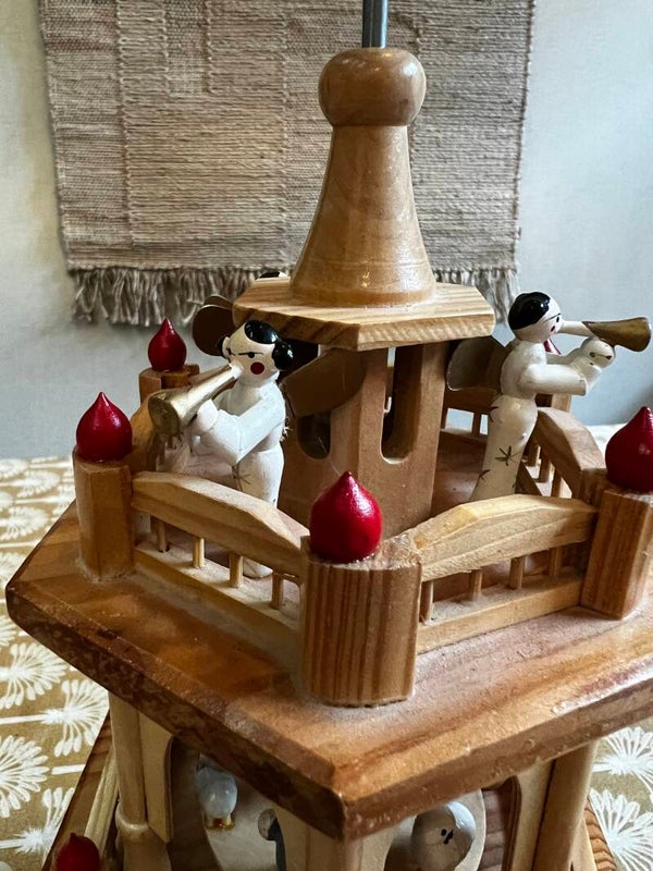 Een kerstpiramide “kerststal” met het kindje Jezus, de drie koningen, herders en vrolijke engelen wordt gepresenteerd over 3 niveaus. Er kunnen 6 piramidekaarsen rond worden verspreid, zodra deze branden beginnen de wielen te draaien.