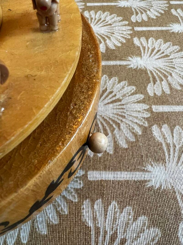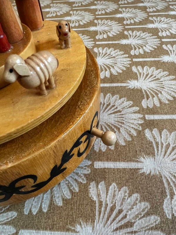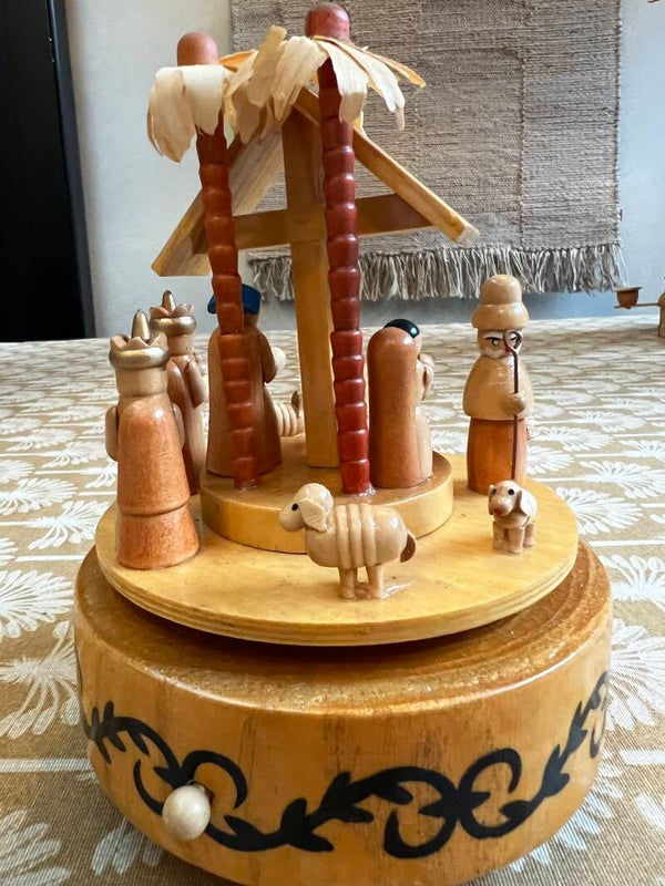 Heel mooi muziek doosje met het kindje Jezus, Jozef en Maria in de stal bij Betlehem. Het muziekdoosje kun je opdraaien dan speelt het ‘t liedje van Beethoven Für Elise. Je kunt het liedje ook stoppen door het dopje in te drukken. De staat van dit alles is nog super mooi.