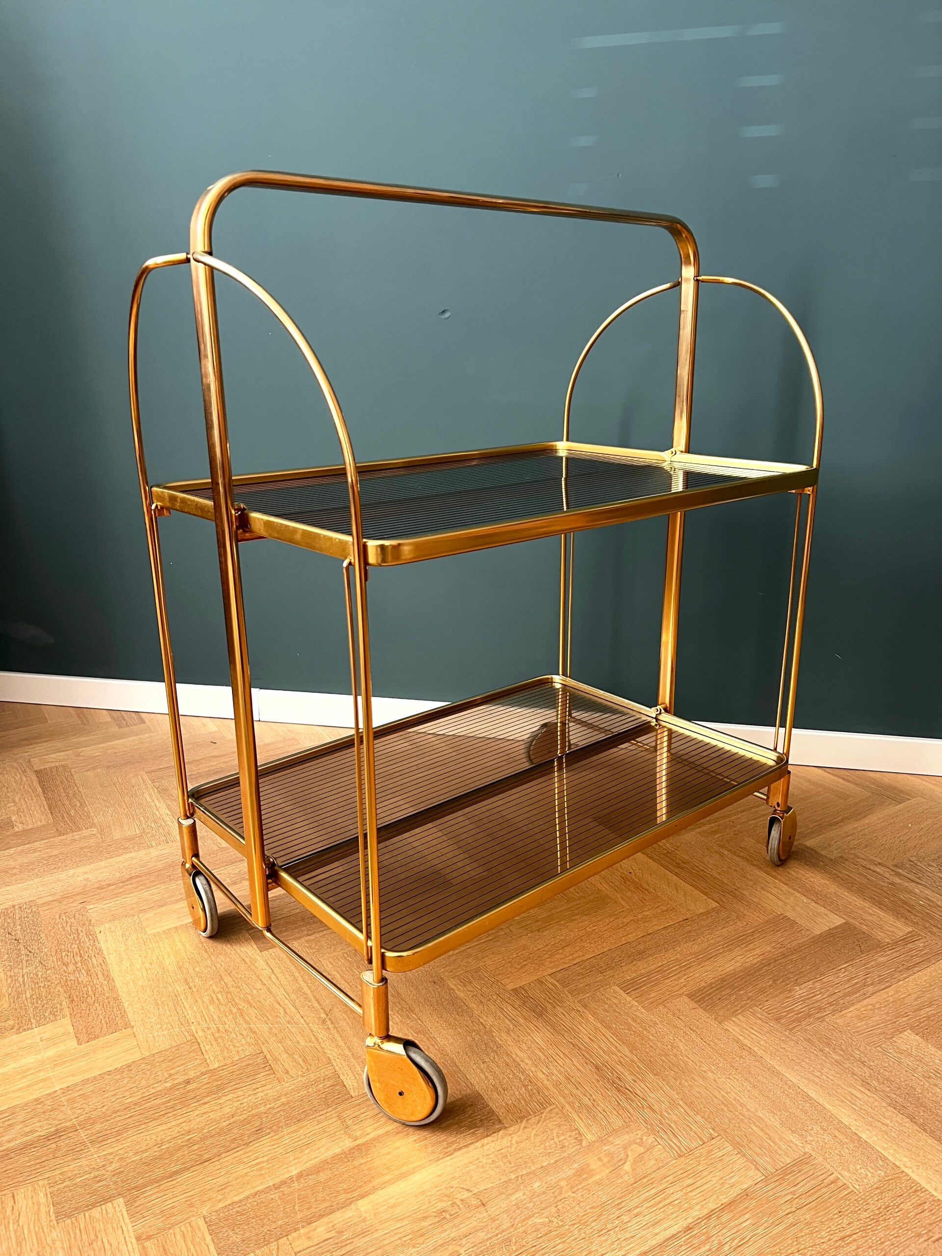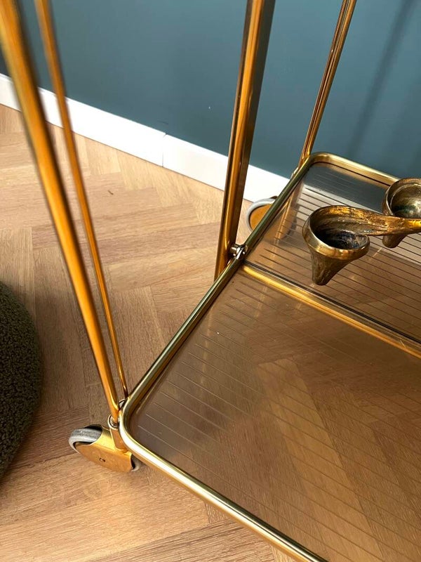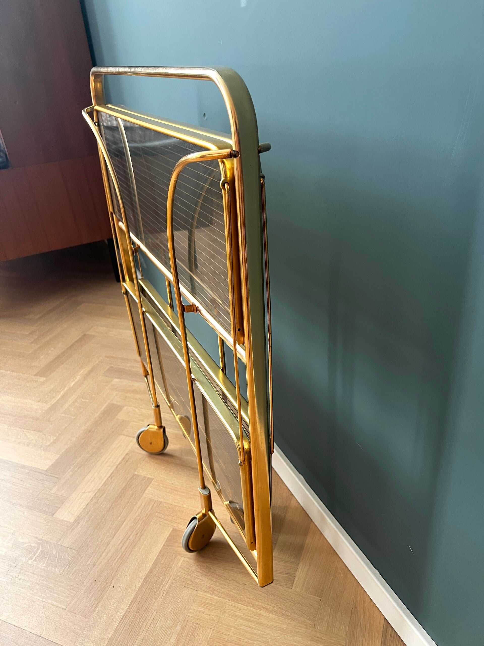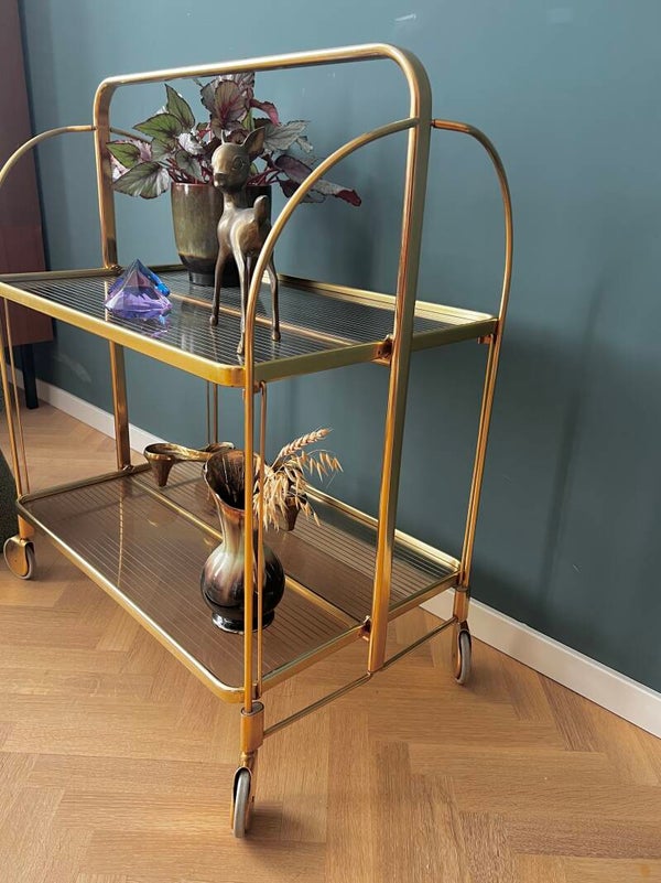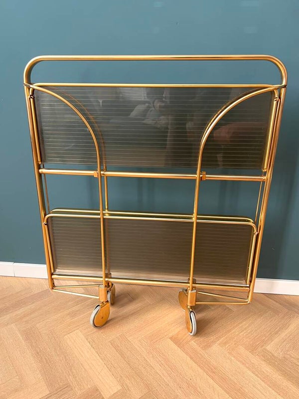 Super toffe messing barcart van het merk Bremshy met kunstoffen boven en onderbladen. Deze barcart kun je eenvoudig inklappen als je hem niet meer nodig hebt of als je hem wil vervoeren. Je kunt hem ook half uitklappen mocht geheel te groot zijn.