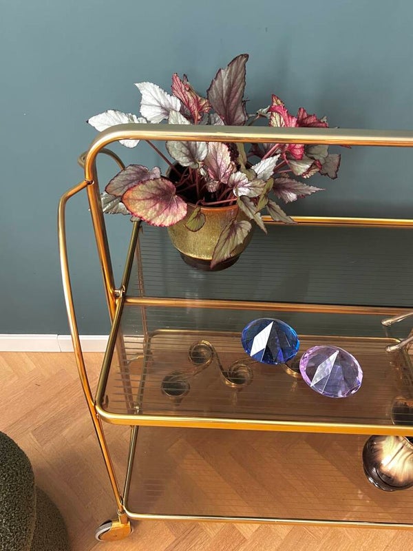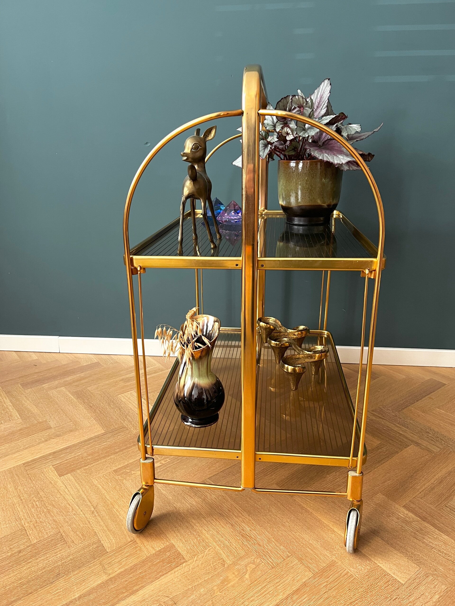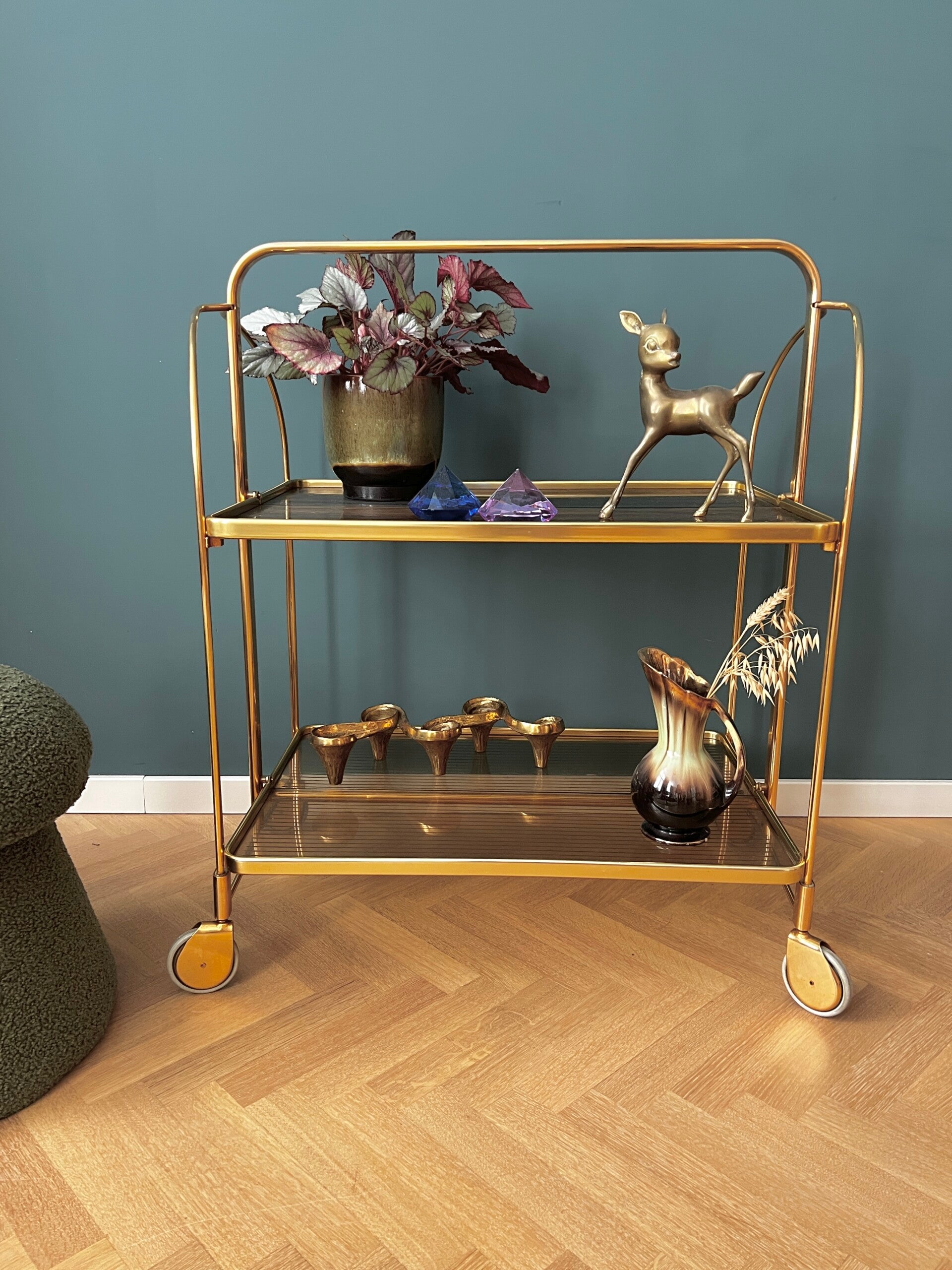 Super toffe messing barcart van het merk Bremshy met kunstoffen boven en onderbladen. Deze barcart kun je eenvoudig inklappen als je hem niet meer nodig hebt of als je hem wil vervoeren. Je kunt hem ook half uitklappen mocht geheel te groot zijn.