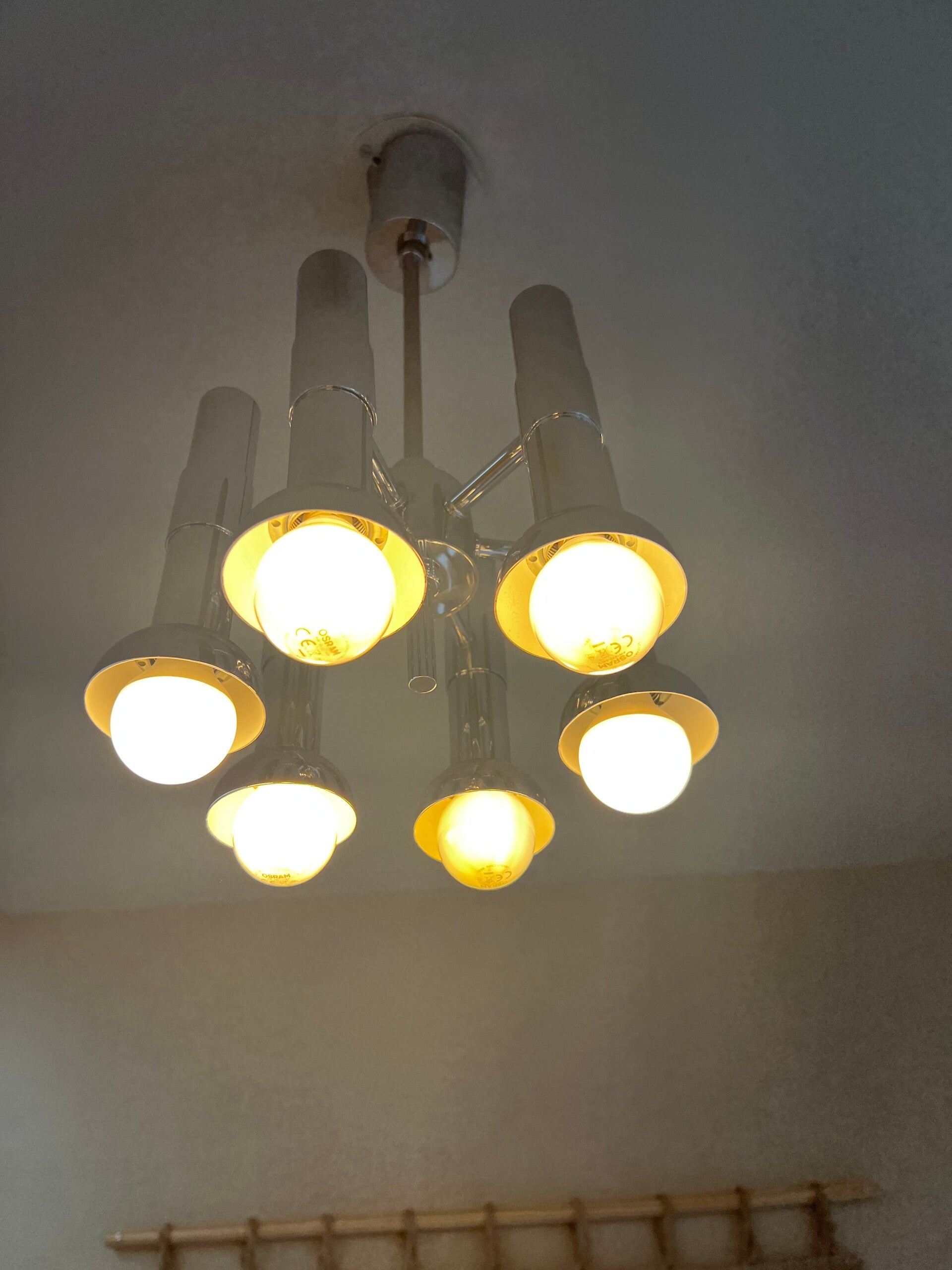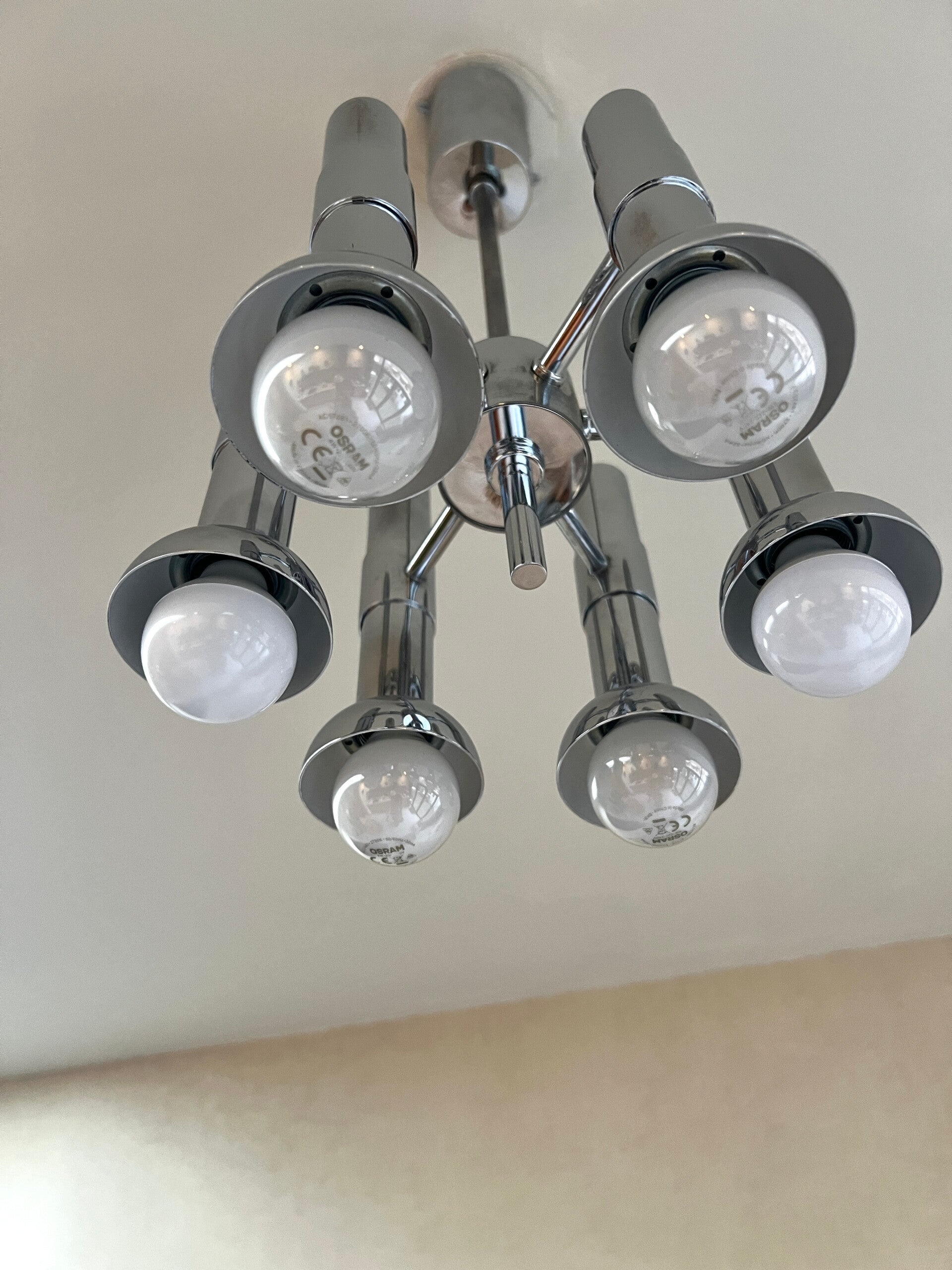 Space age verchroomde design hanglamp uit de jaren 60/70. Ontwerp en productie door Hustadt Leuchten Duitsland. Het Chroom is nog in perfecte staat en de lamp is getest zie foto’s.