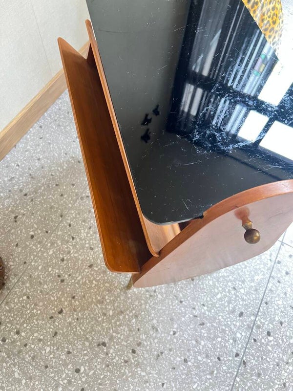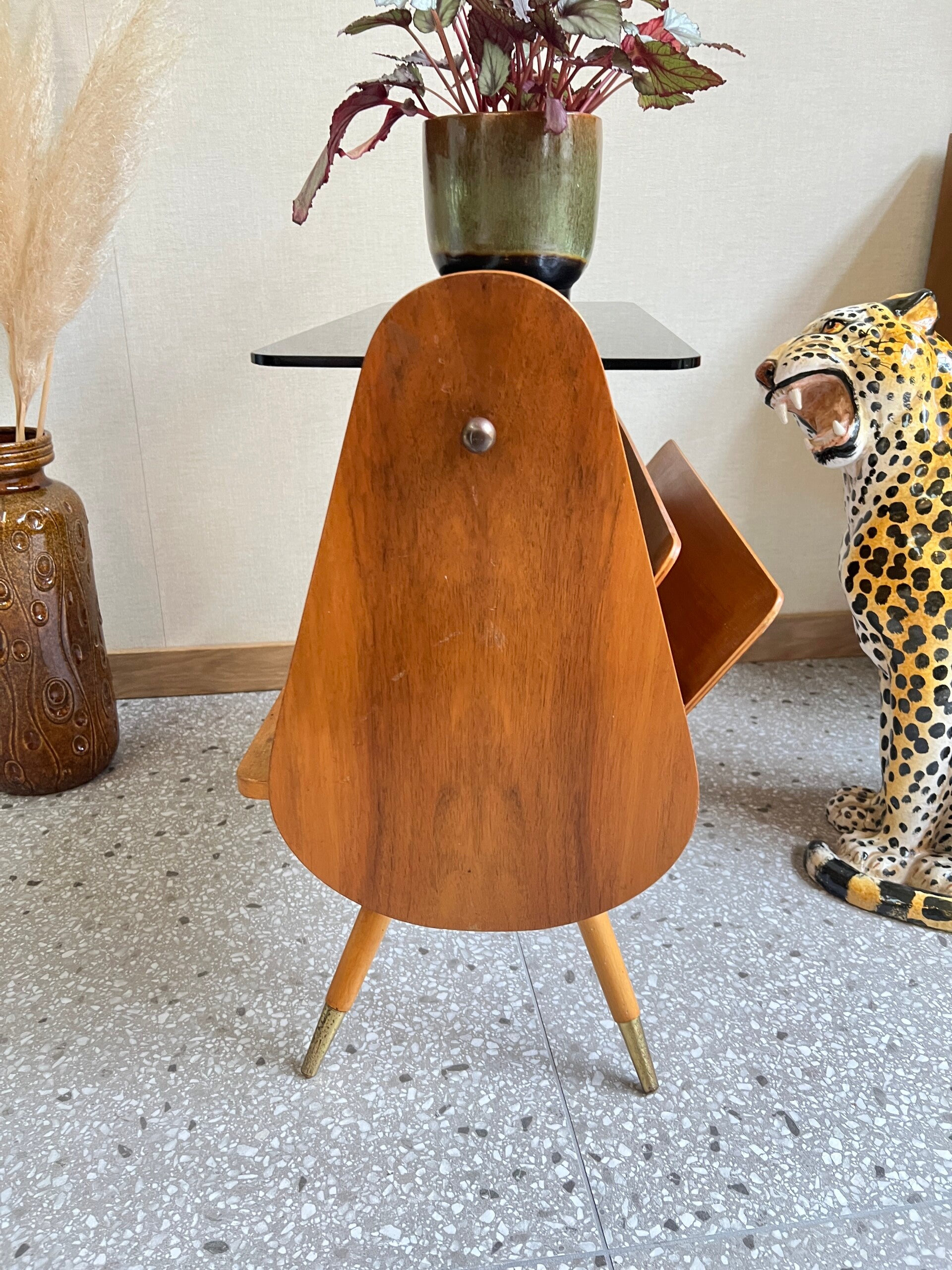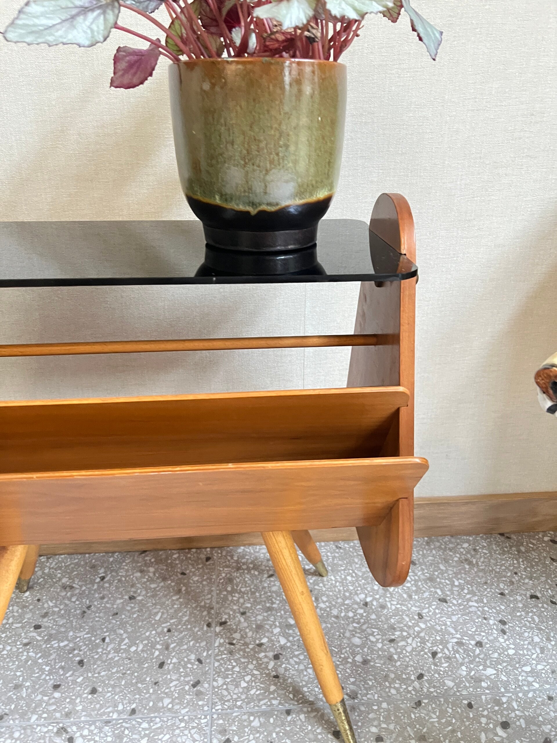 Deze Lectuurbak is ook handig in gebruik als bijzettafeltje. Het heeft een zwart glazen bovenblad en houten onderstel, aan een kant is het een lectuurbak en aan de andere zijde een open ruimte om bv iets leuks op te zetten.