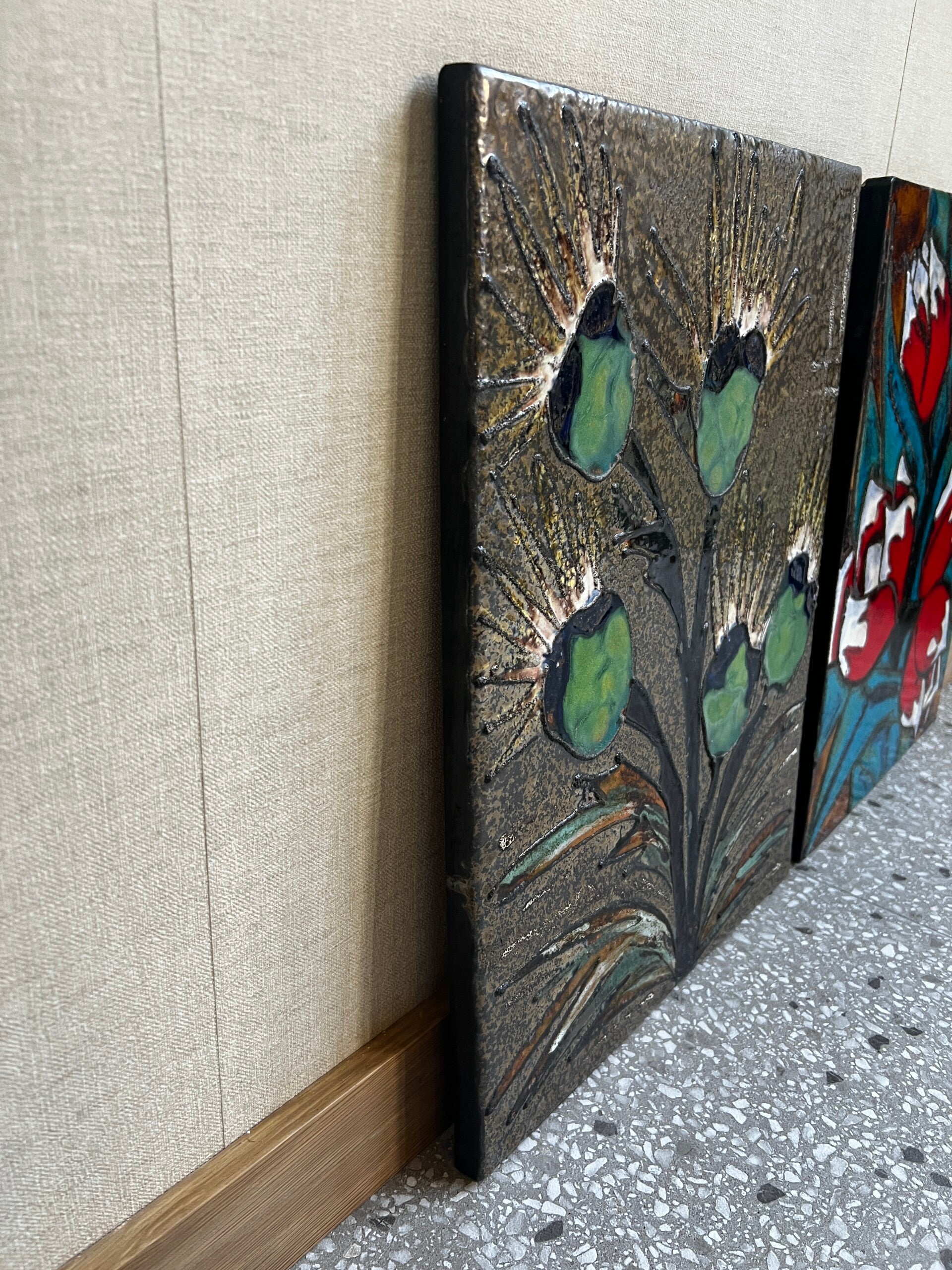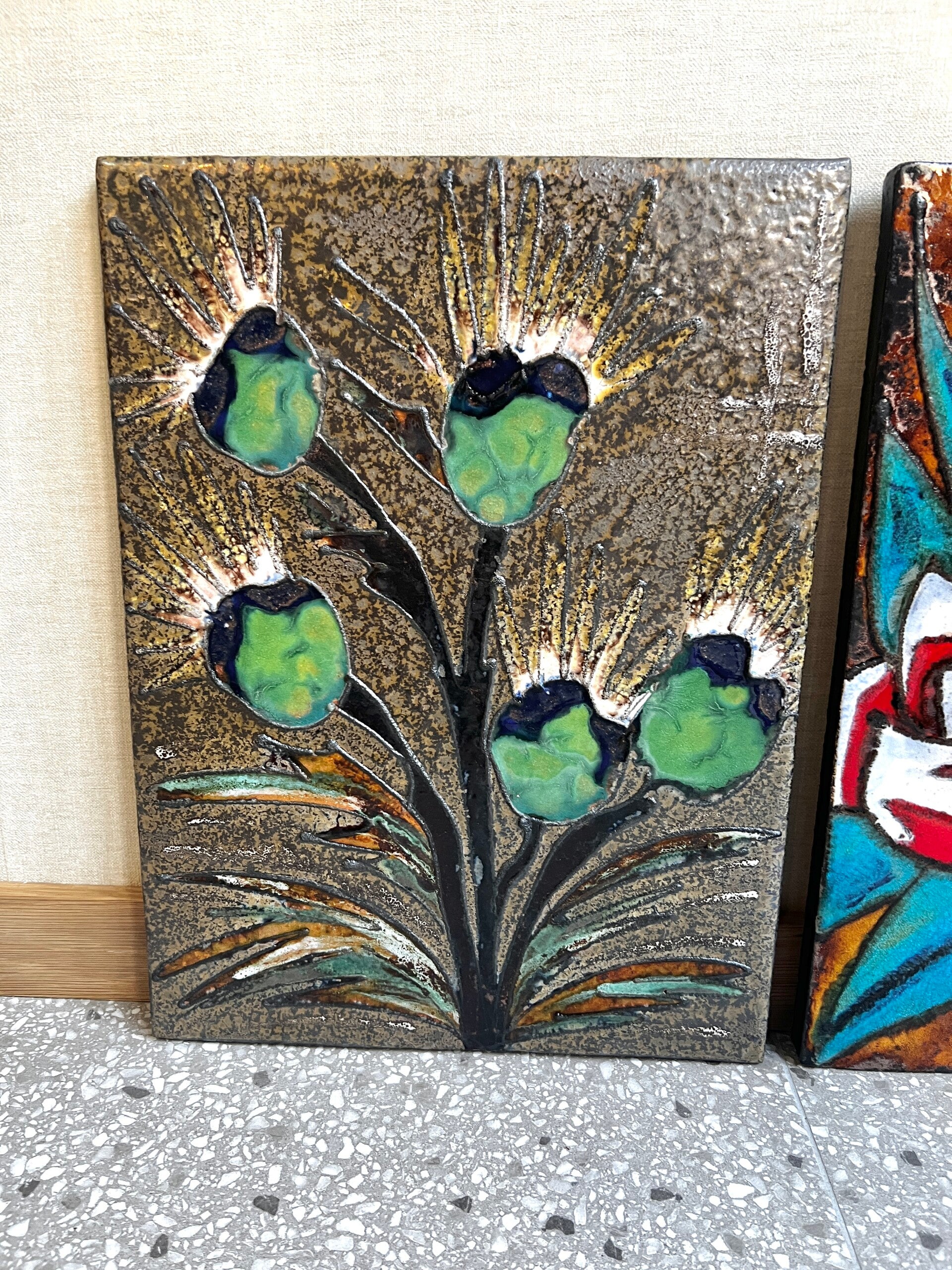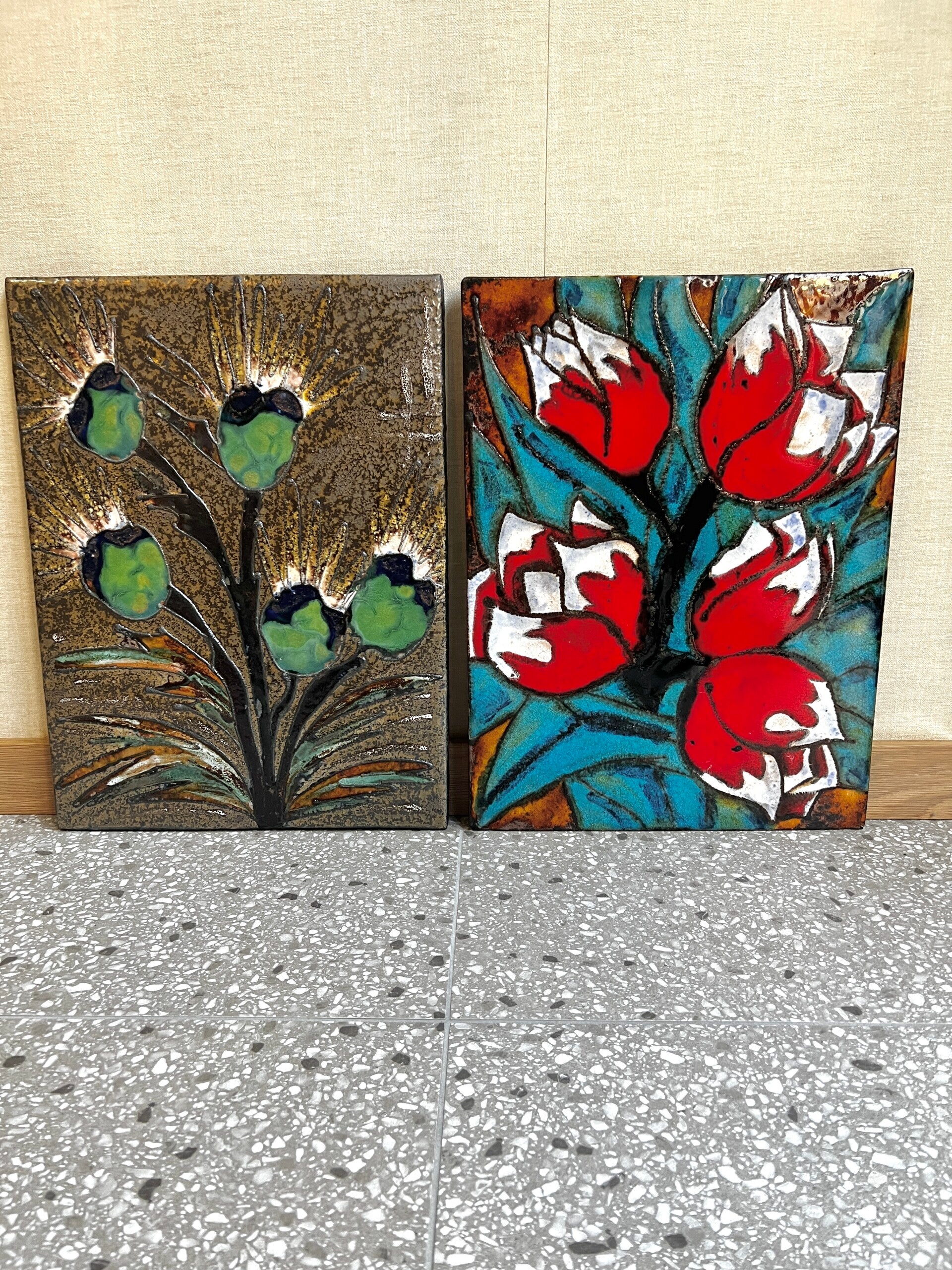 Het linker wandbord is voornamelijk in groen tinten en het rechter wandbord voornamelijk rood tinten. Aan de achterzijde zit een metalen Metalen haak om hem aan op te hangen.