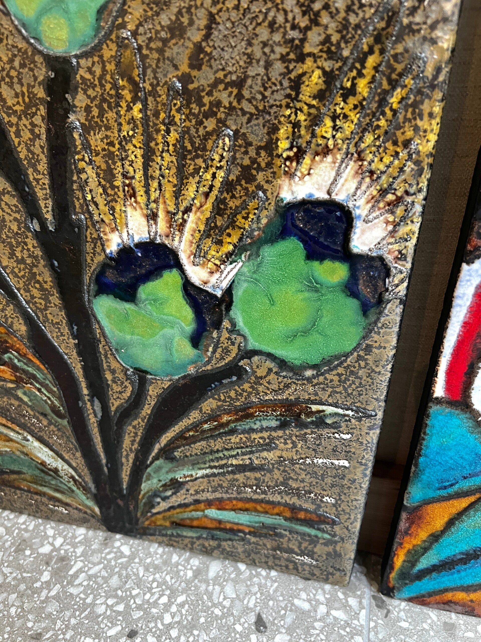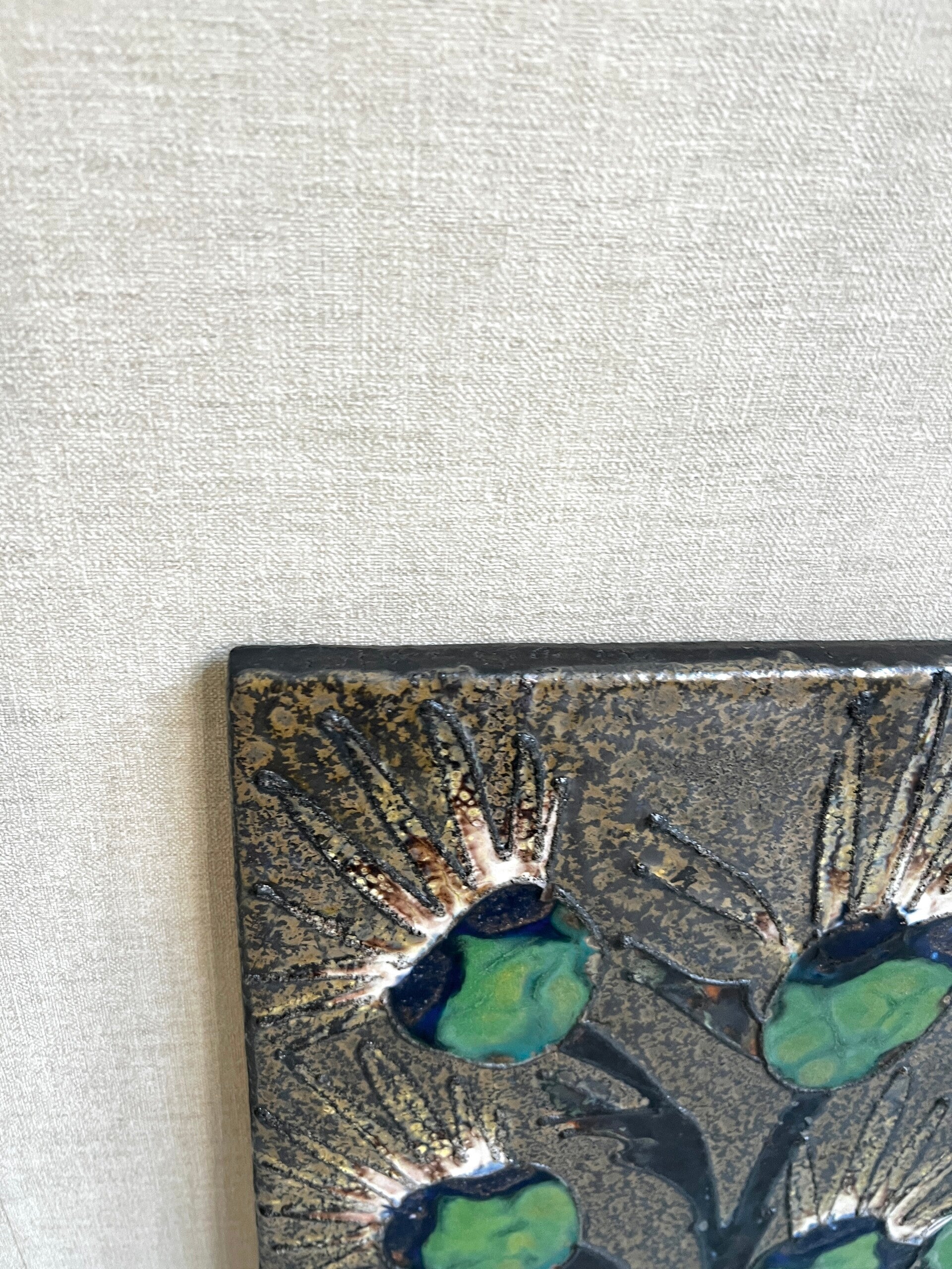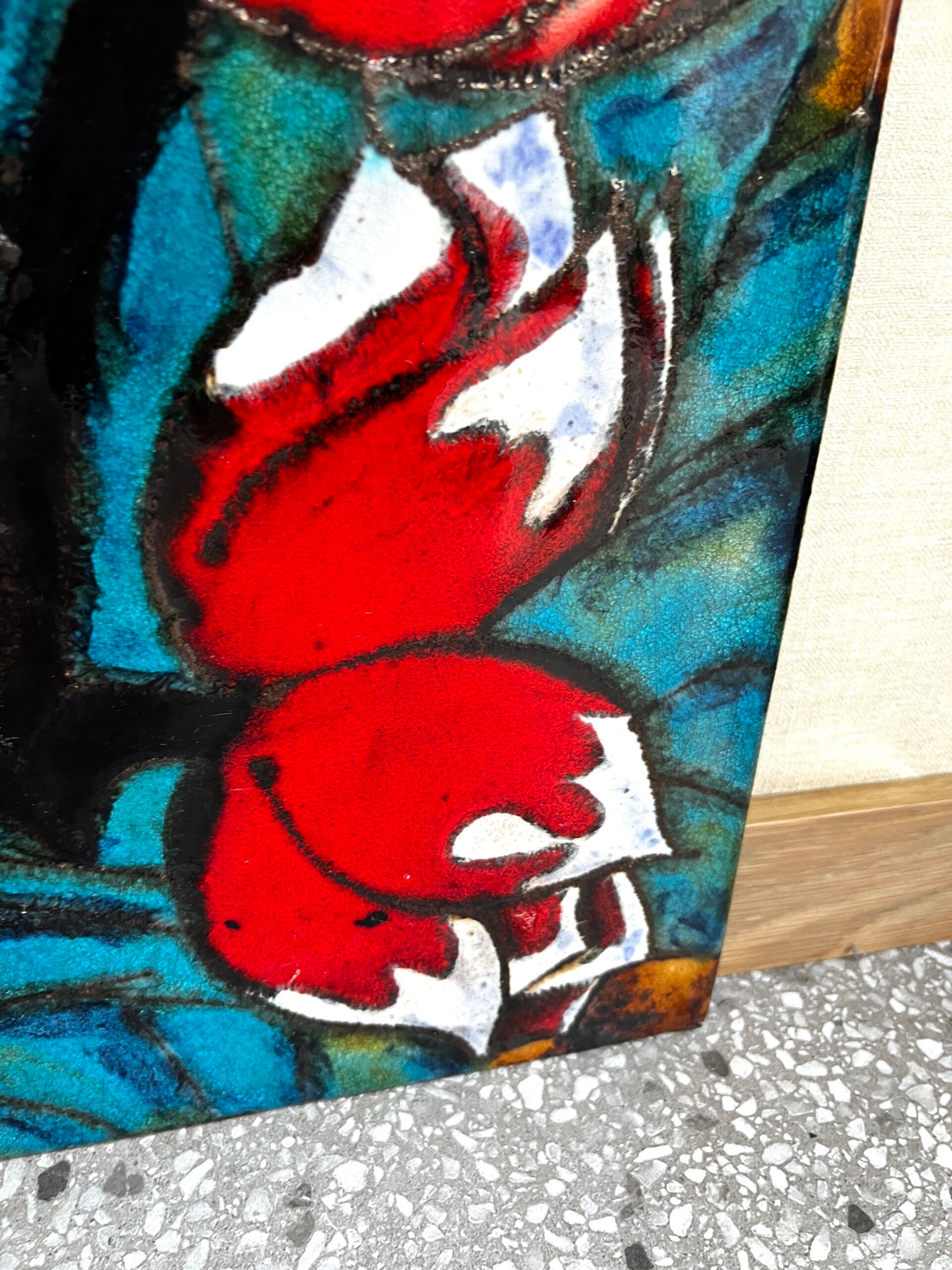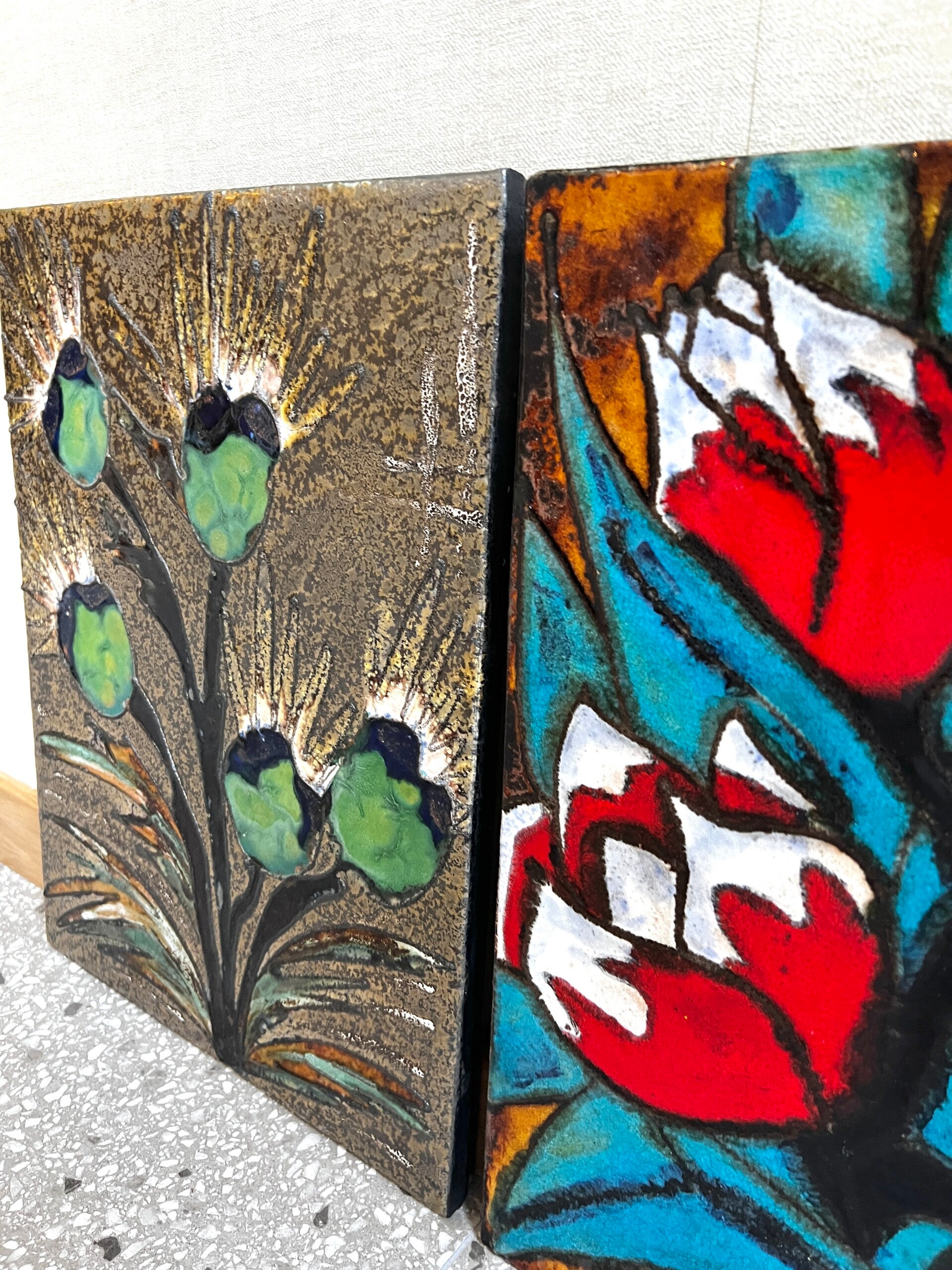 Het linker wandbord is voornamelijk in groen tinten en het rechter wandbord voornamelijk rood tinten. Aan de achterzijde zit een metalen Metalen haak om hem aan op te hangen.