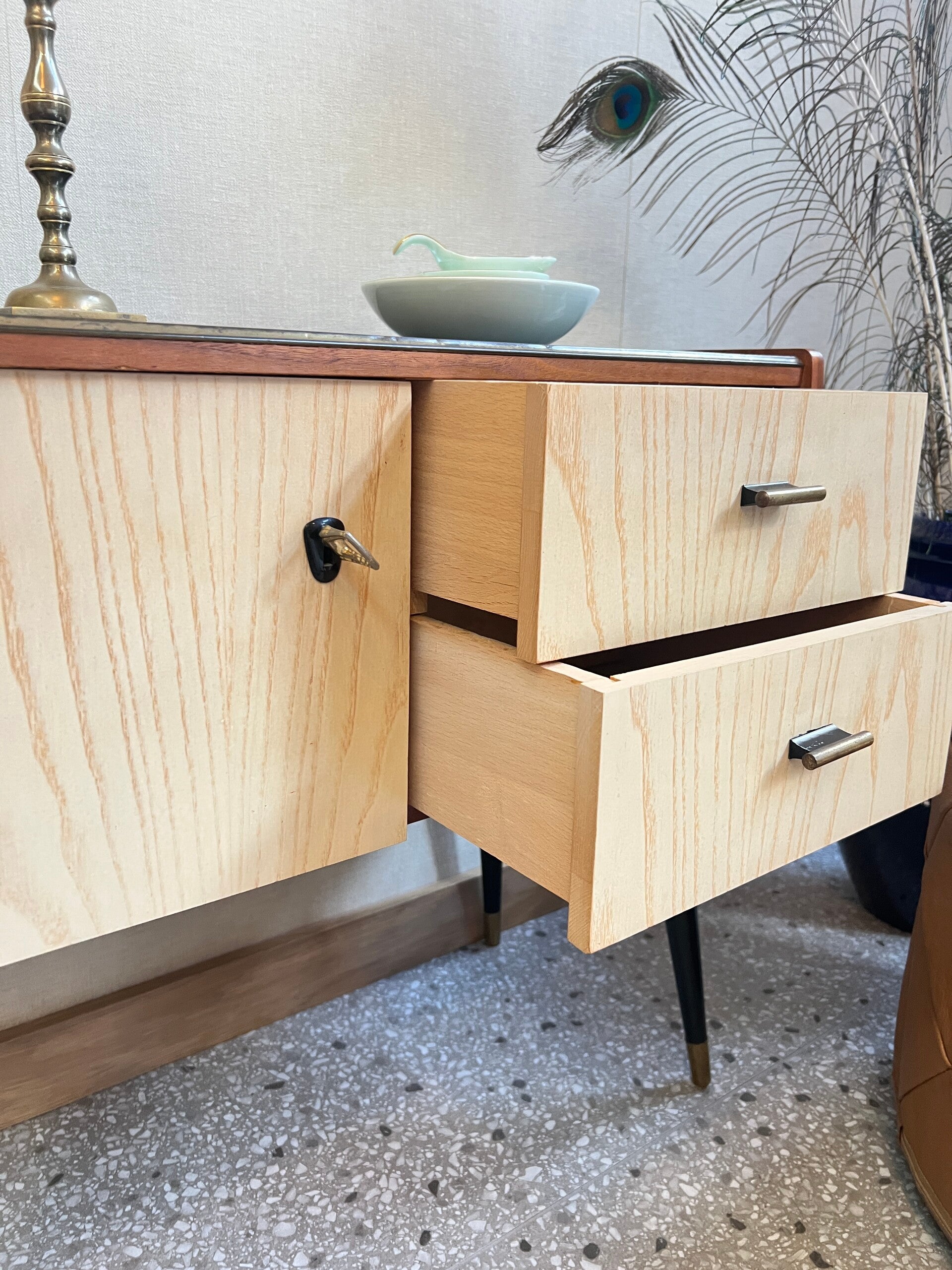 Leuk kastje met zwart bovenblad. Aan een kant twee laatjes en aan de andere kant een deurtje. Het kastje heeft hoge pootjes en messing sokjes.