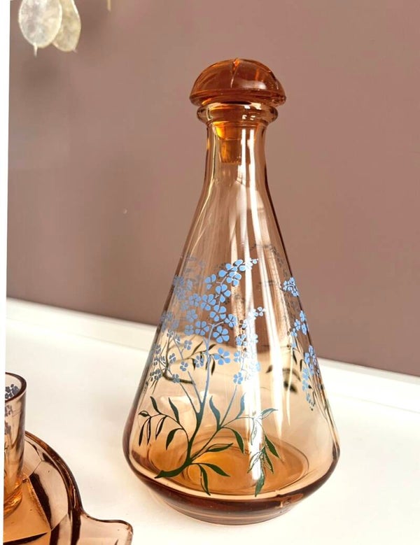 Prachtige roze borrel set, bestaande uit een karaf met zes glaasjes op een glazen bordje. Erop staan afbeeldingen van blauwe vergeet me nietjes. Hele mooie styling voor op een tafeltje of barcart✨